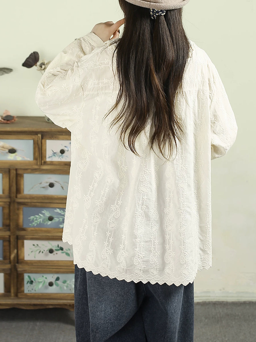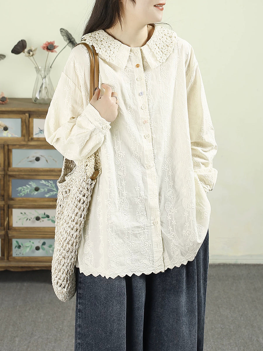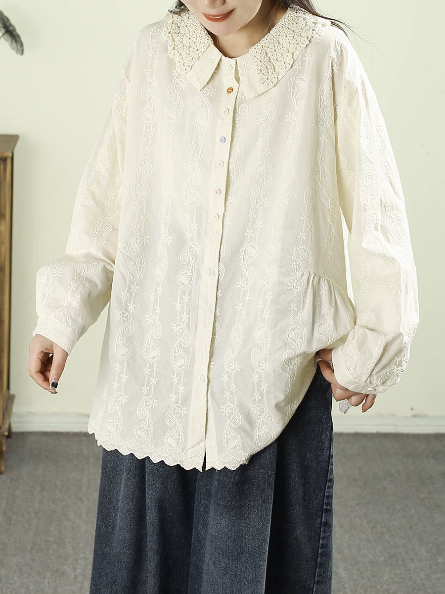 Women Artsy Autumn Embroidery 100%Cotton Shirt