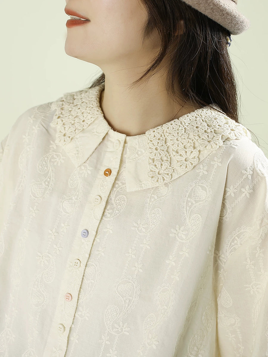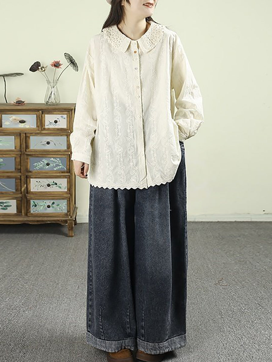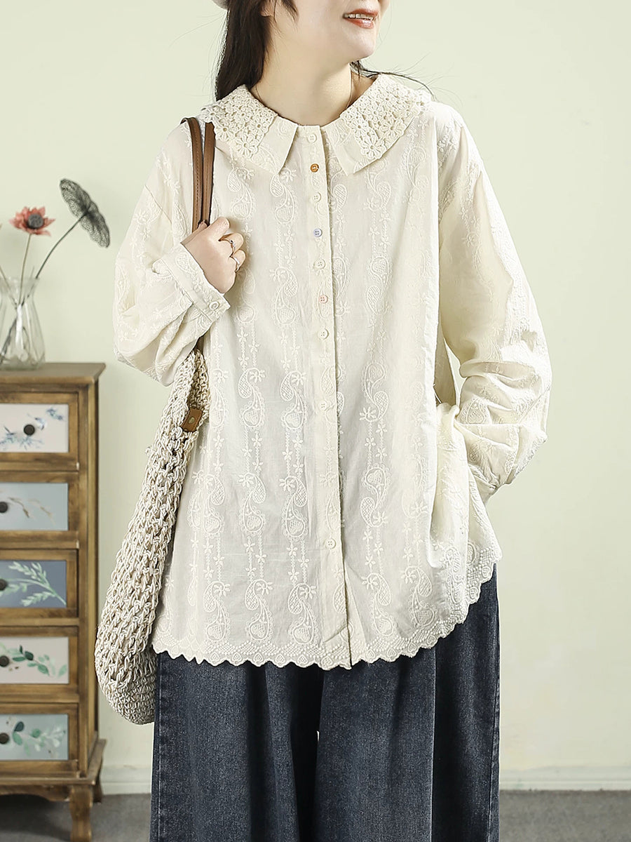 Women Artsy Autumn Embroidery 100%Cotton Shirt