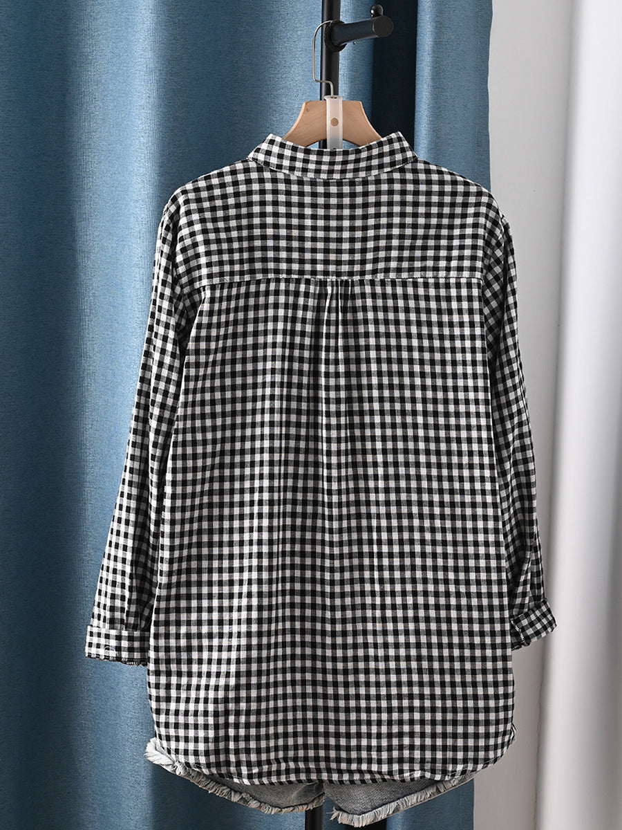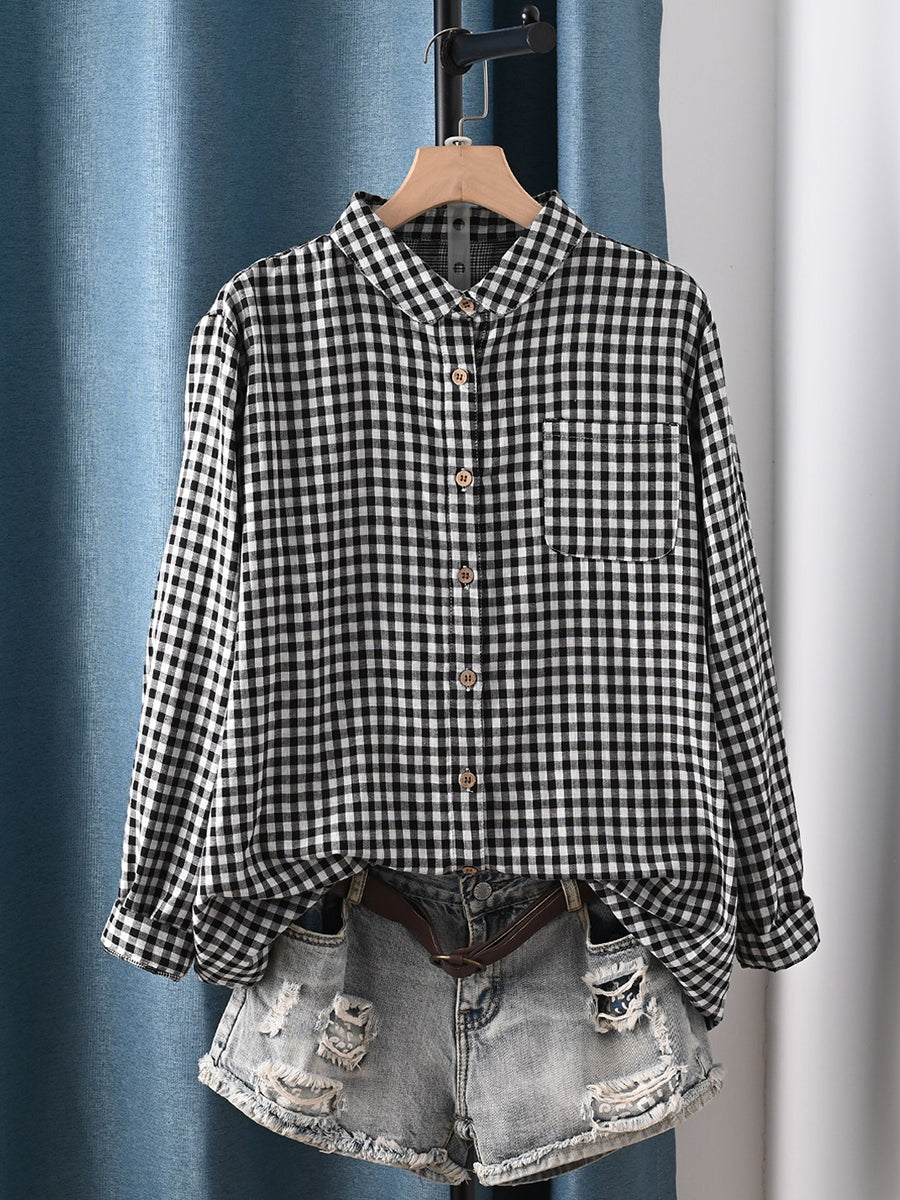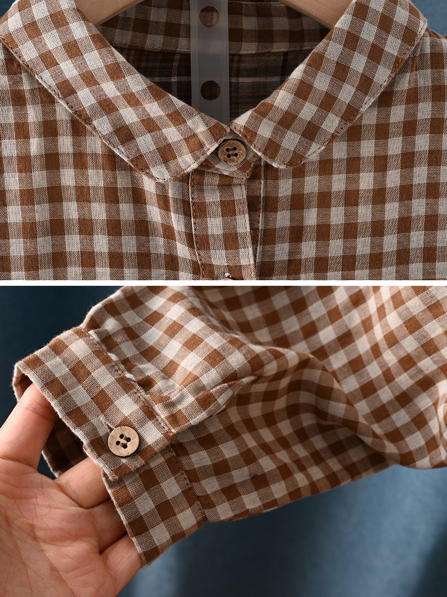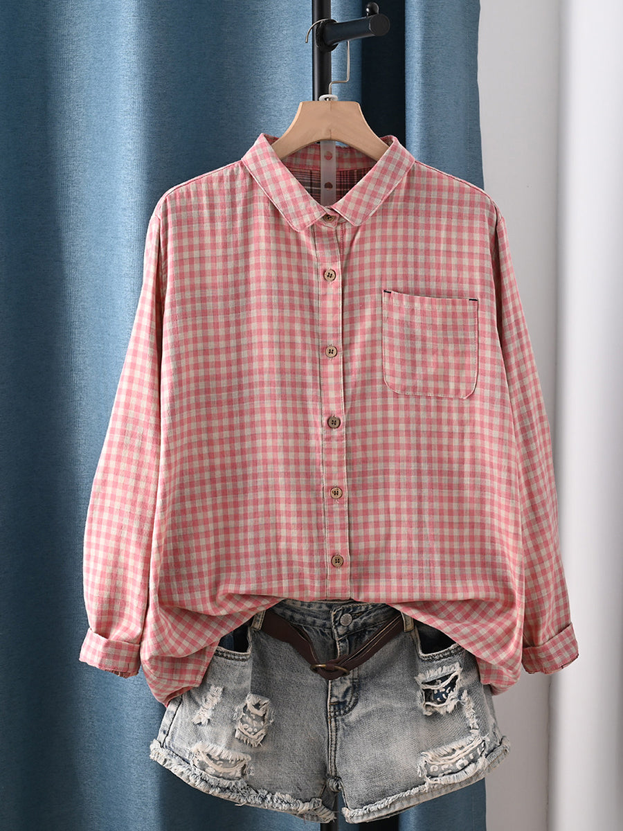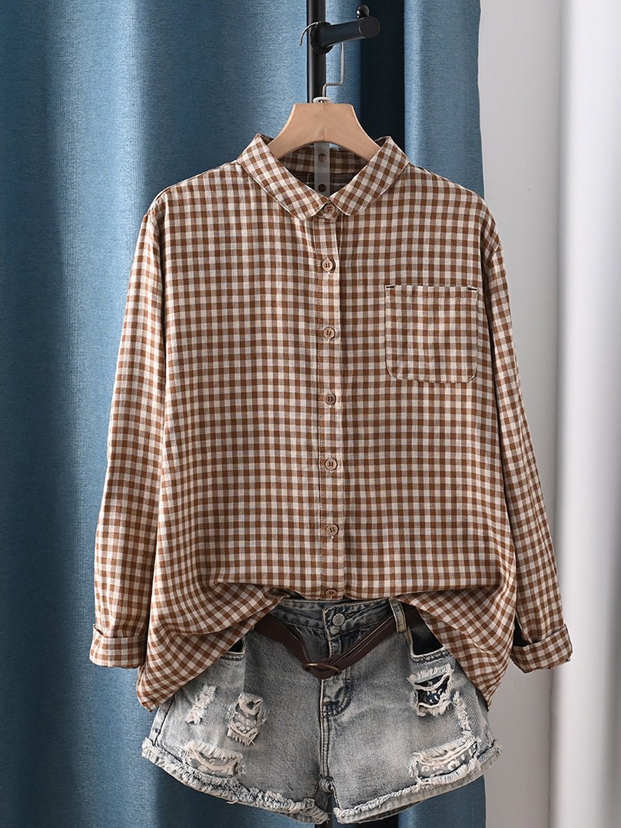 Women Artsy Autumn Plaid Turn-down Collar 100%Cotton Shirt