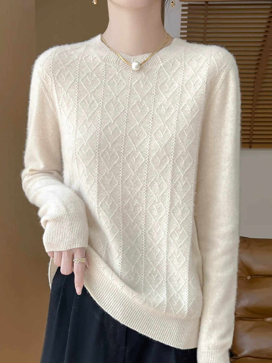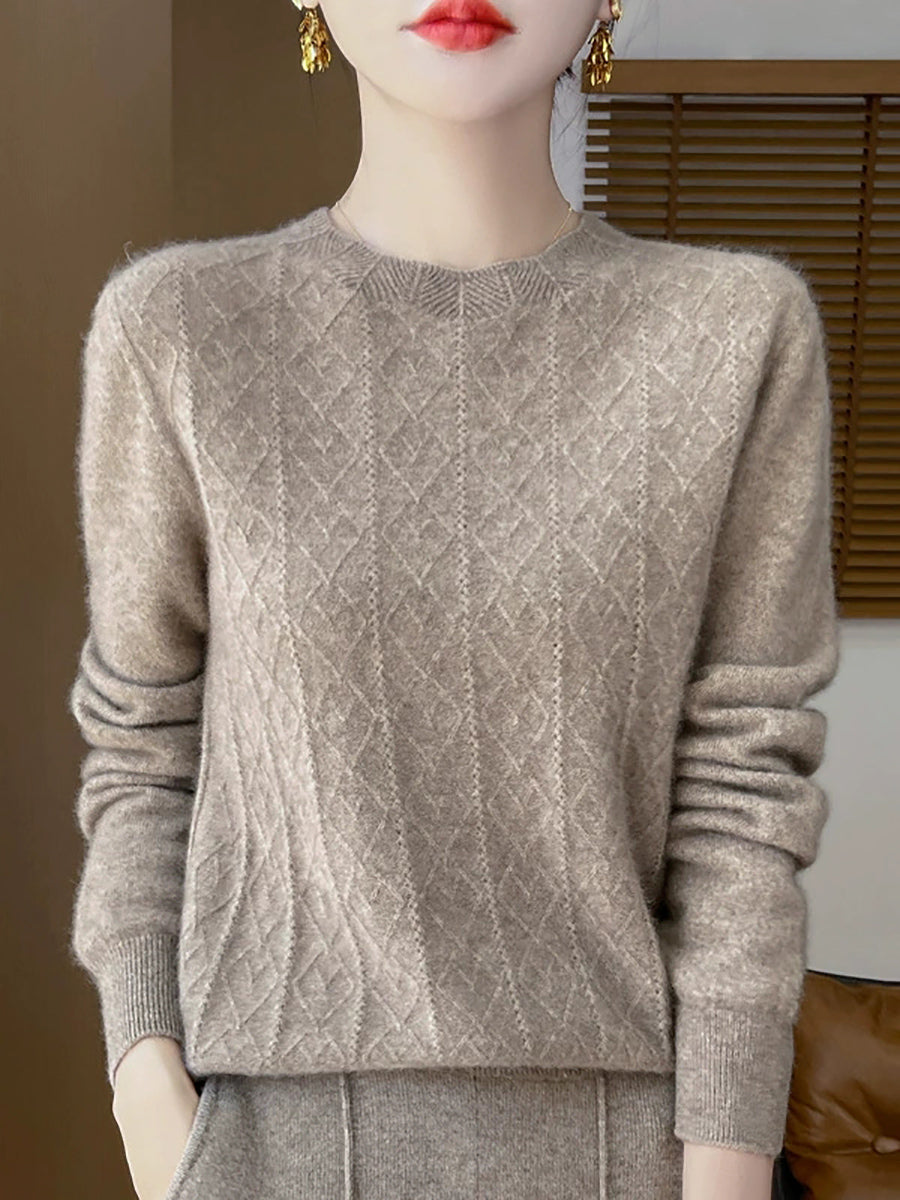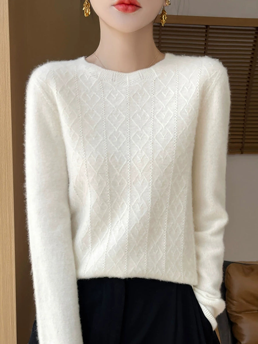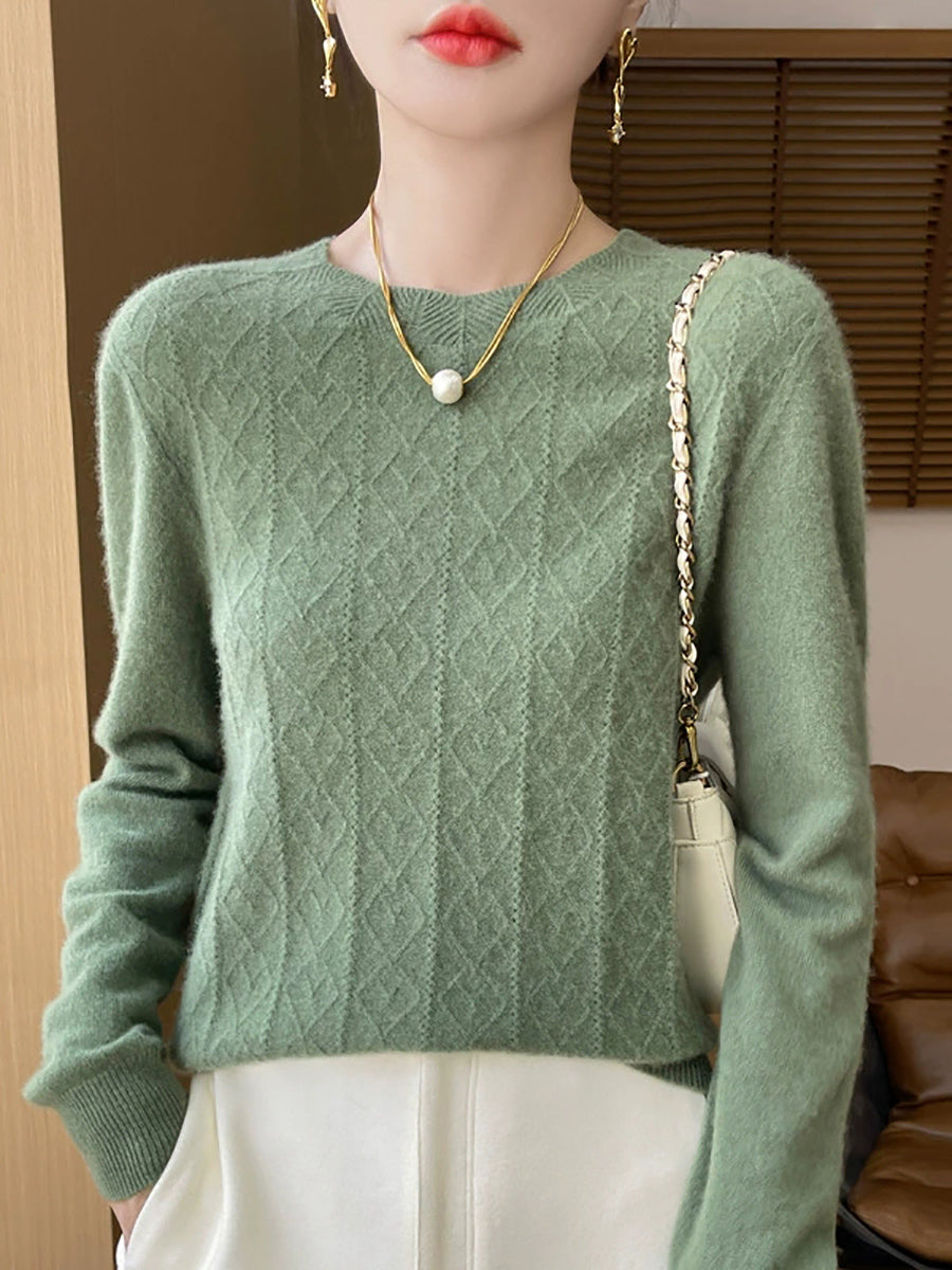 Women Artsy Pure Color Cable Knit O-Neck Sweater