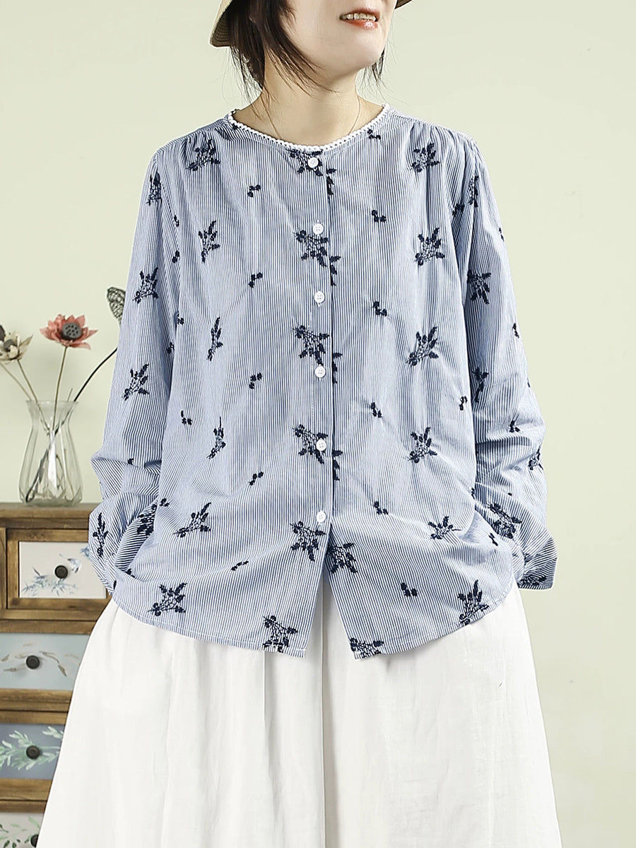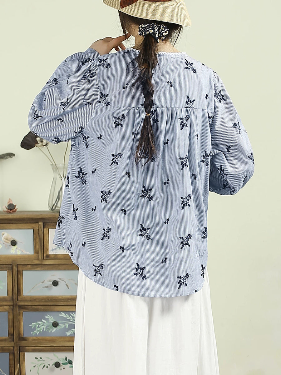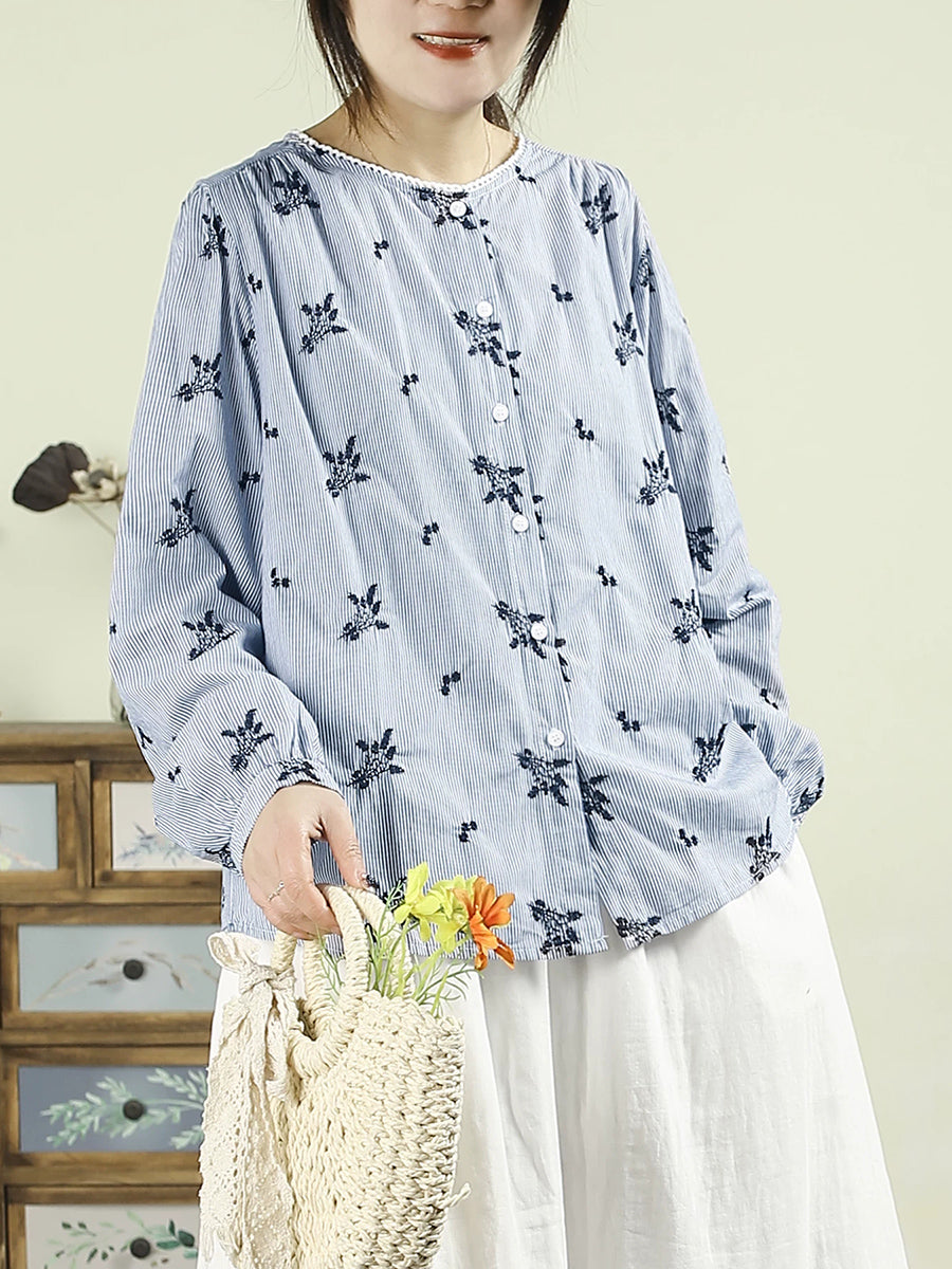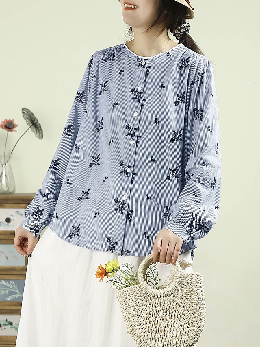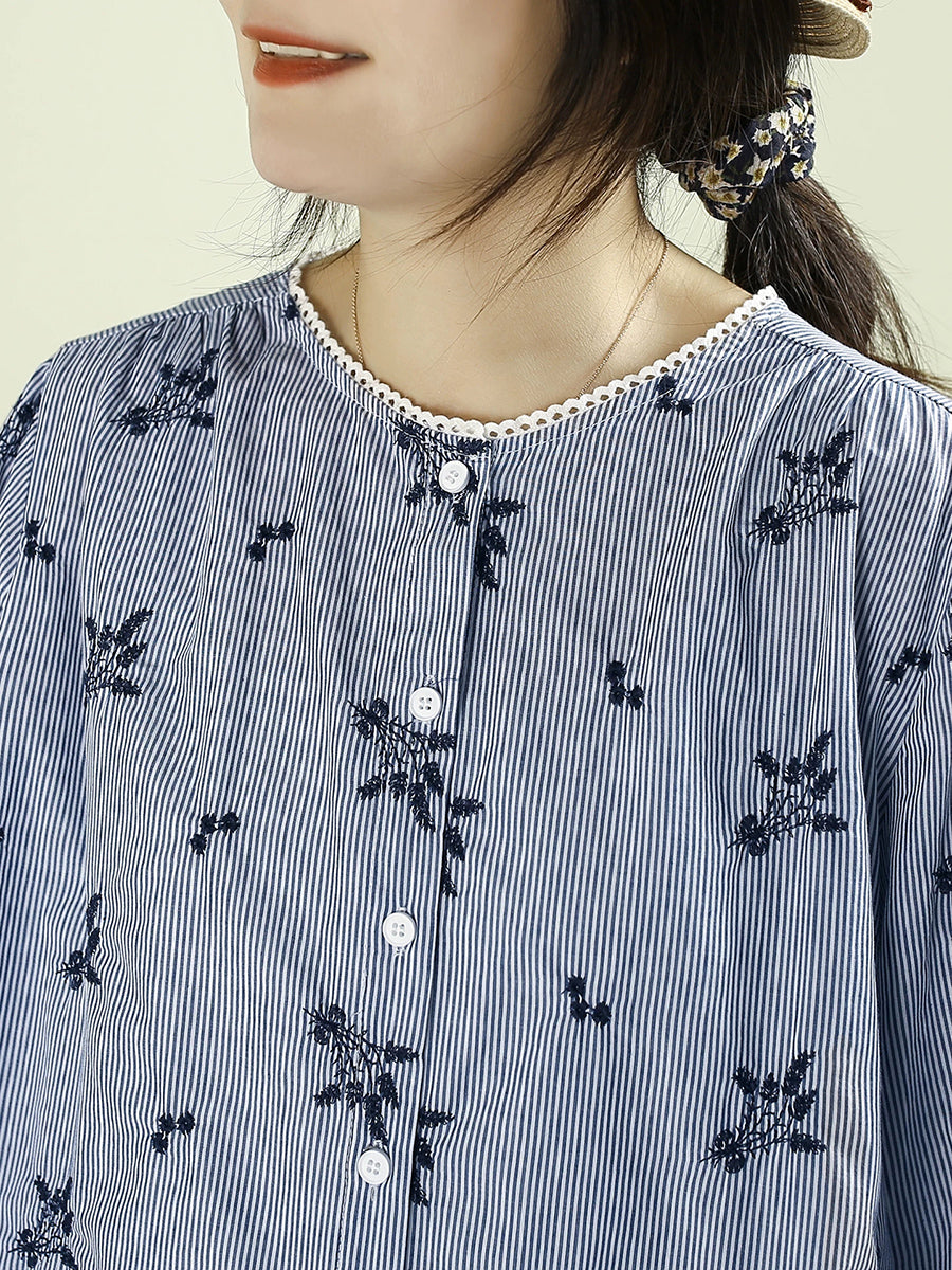 Women Artsy Spring Embroidery O-Neck 100%Cotton Shirt