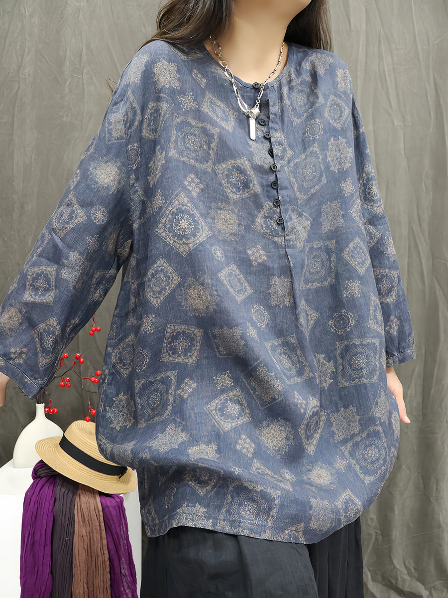 Women Artsy Spring Floral O-Neck 100%Linen Blouse