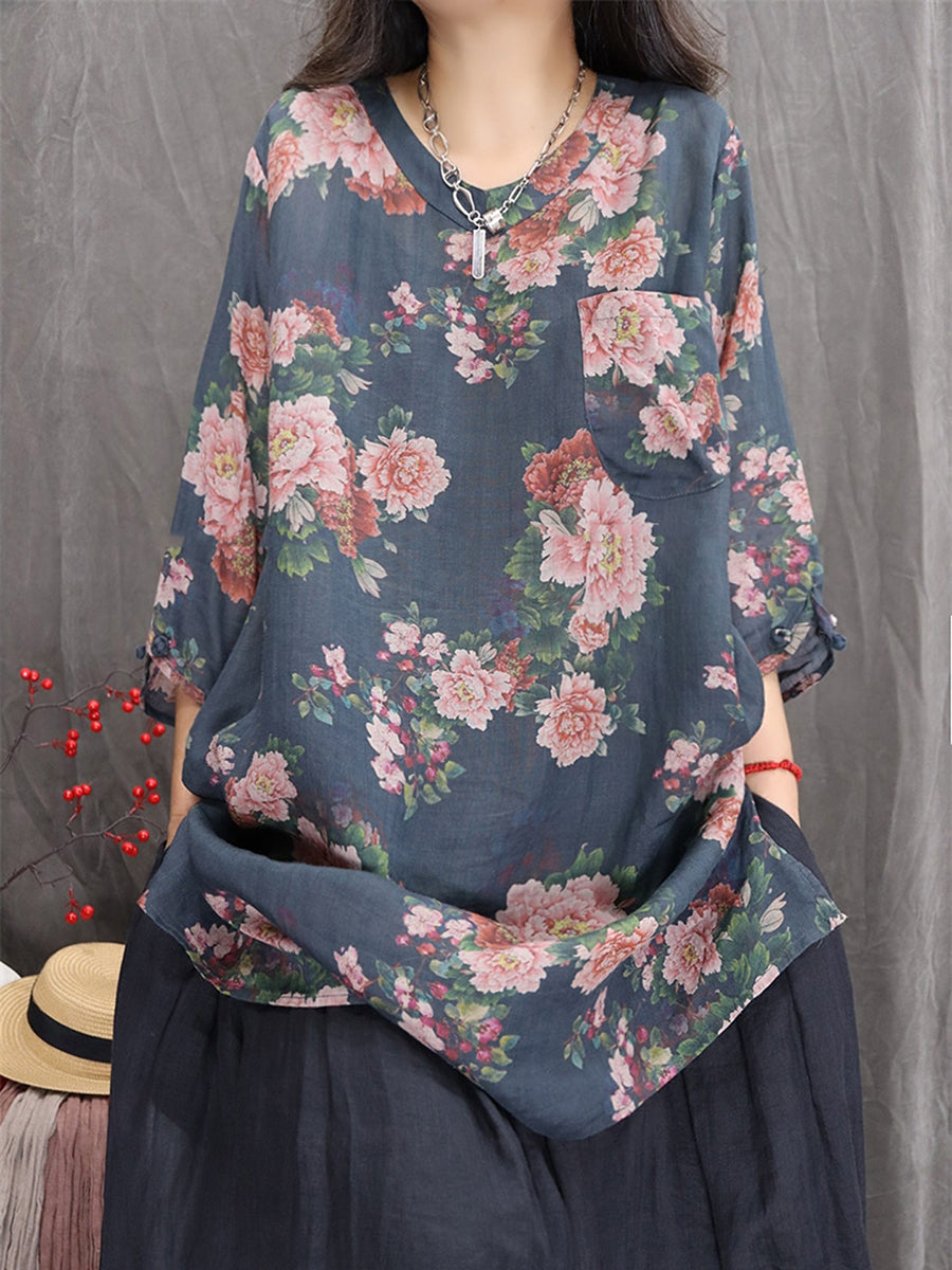 Women Artsy Summer Flower V-Neck 100%Ramie Blouse