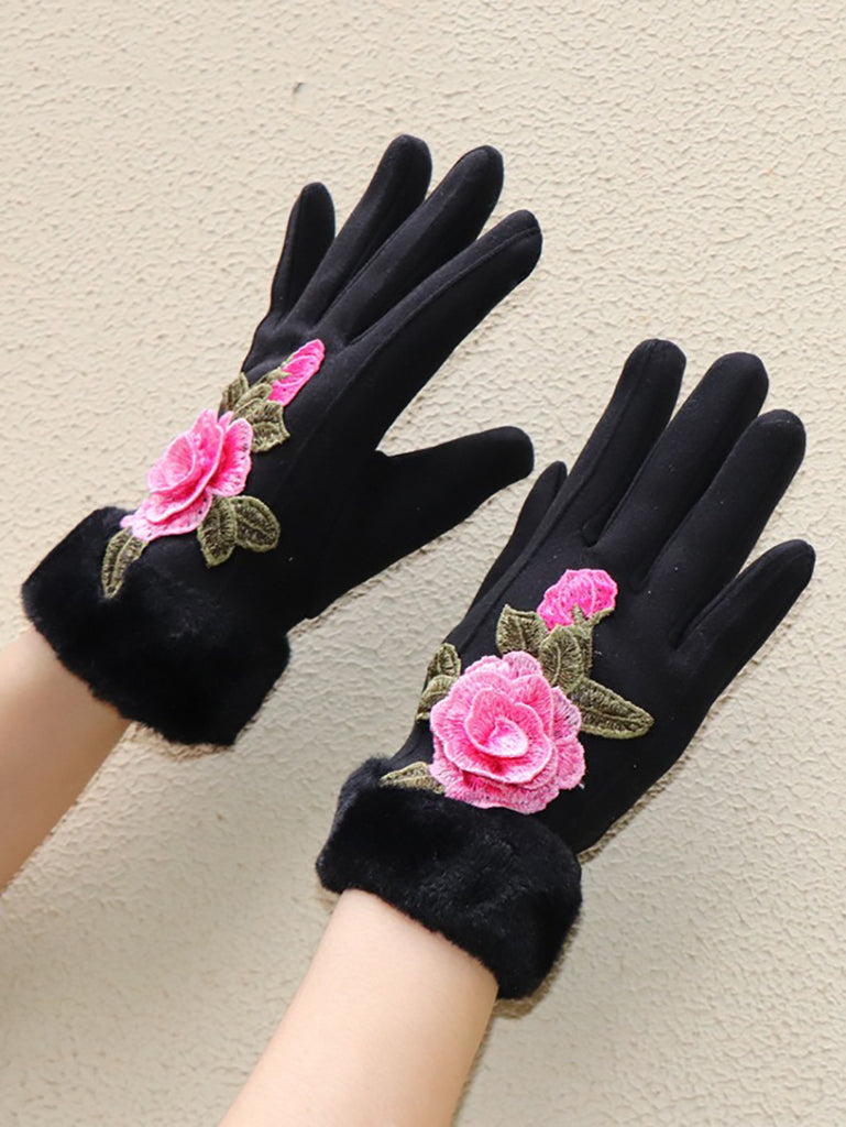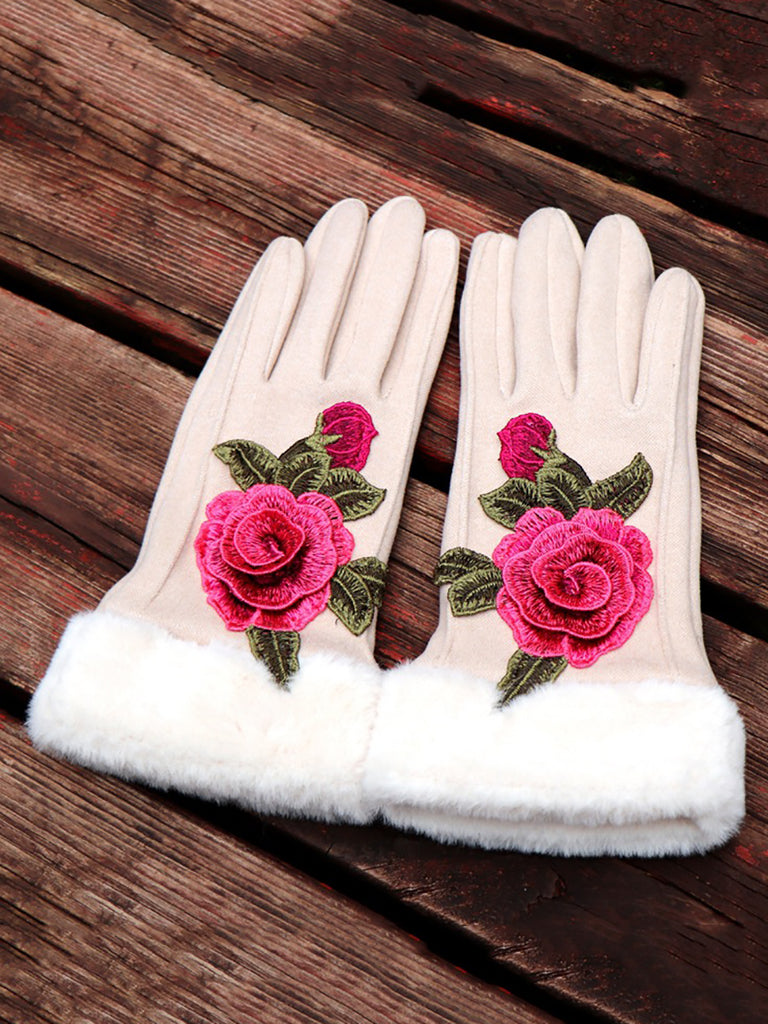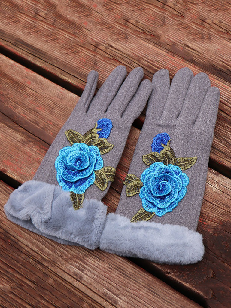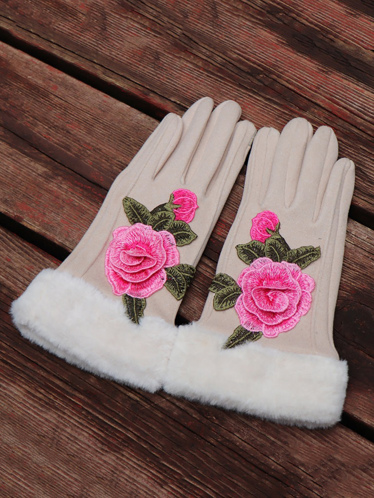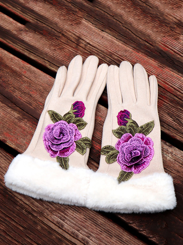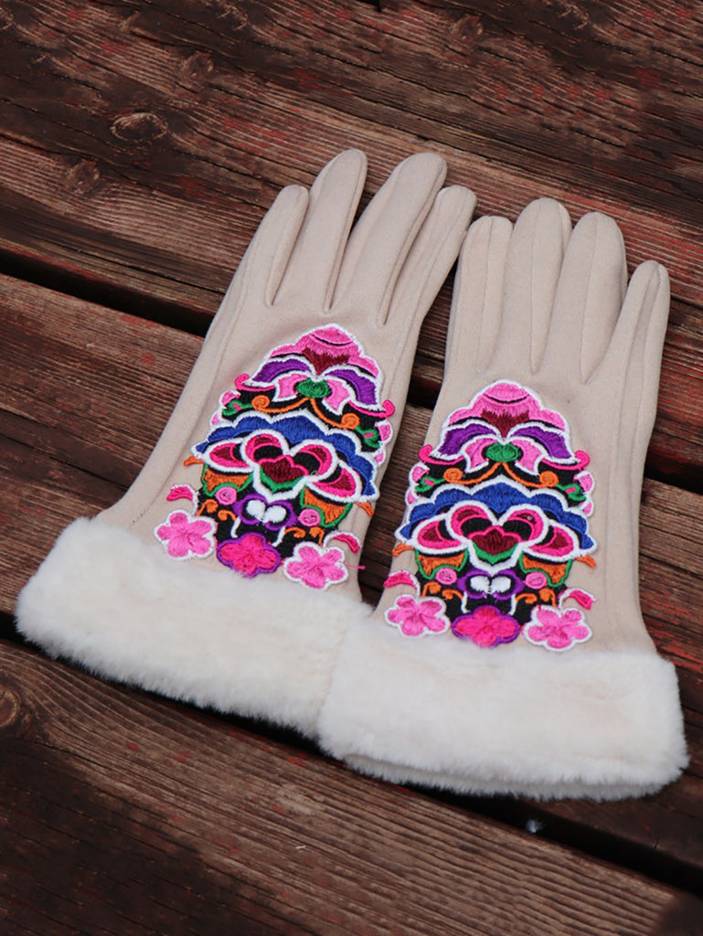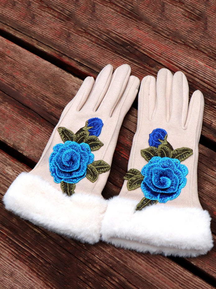 Women Artsy Winter Embroidery Fleece-lined Gloves