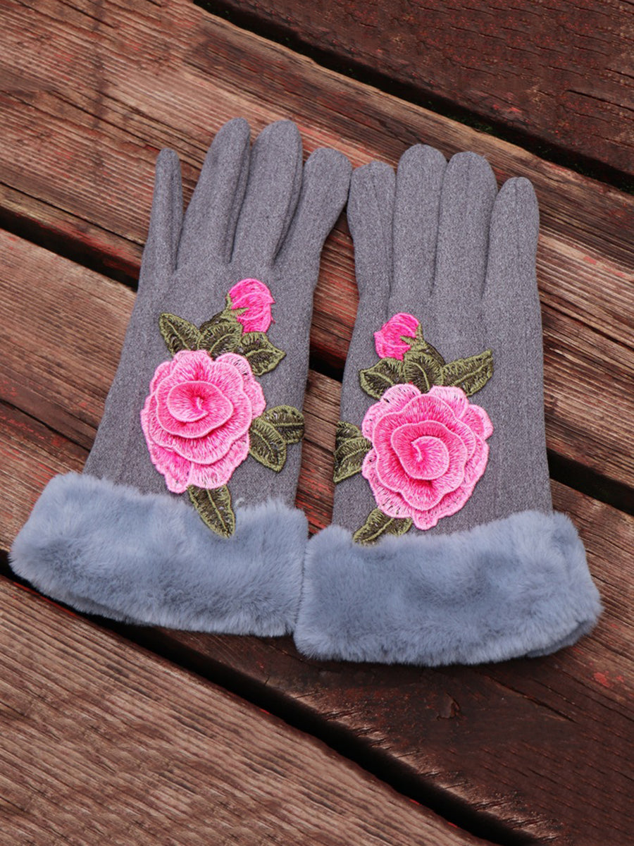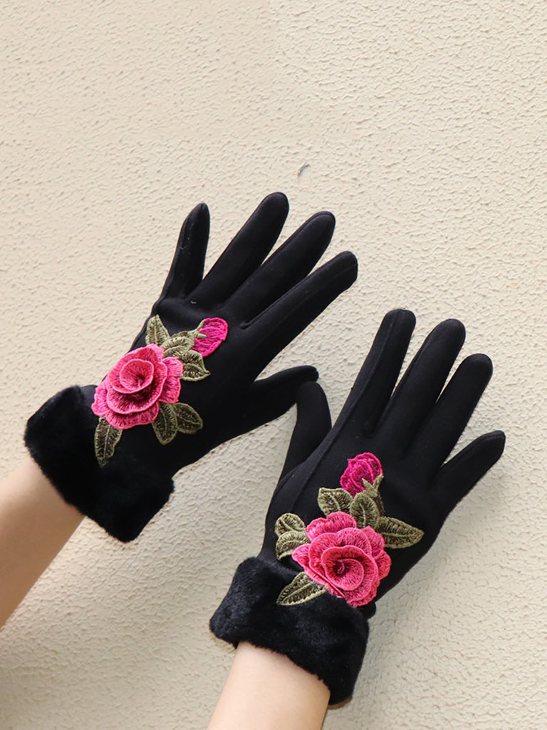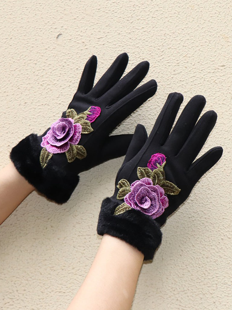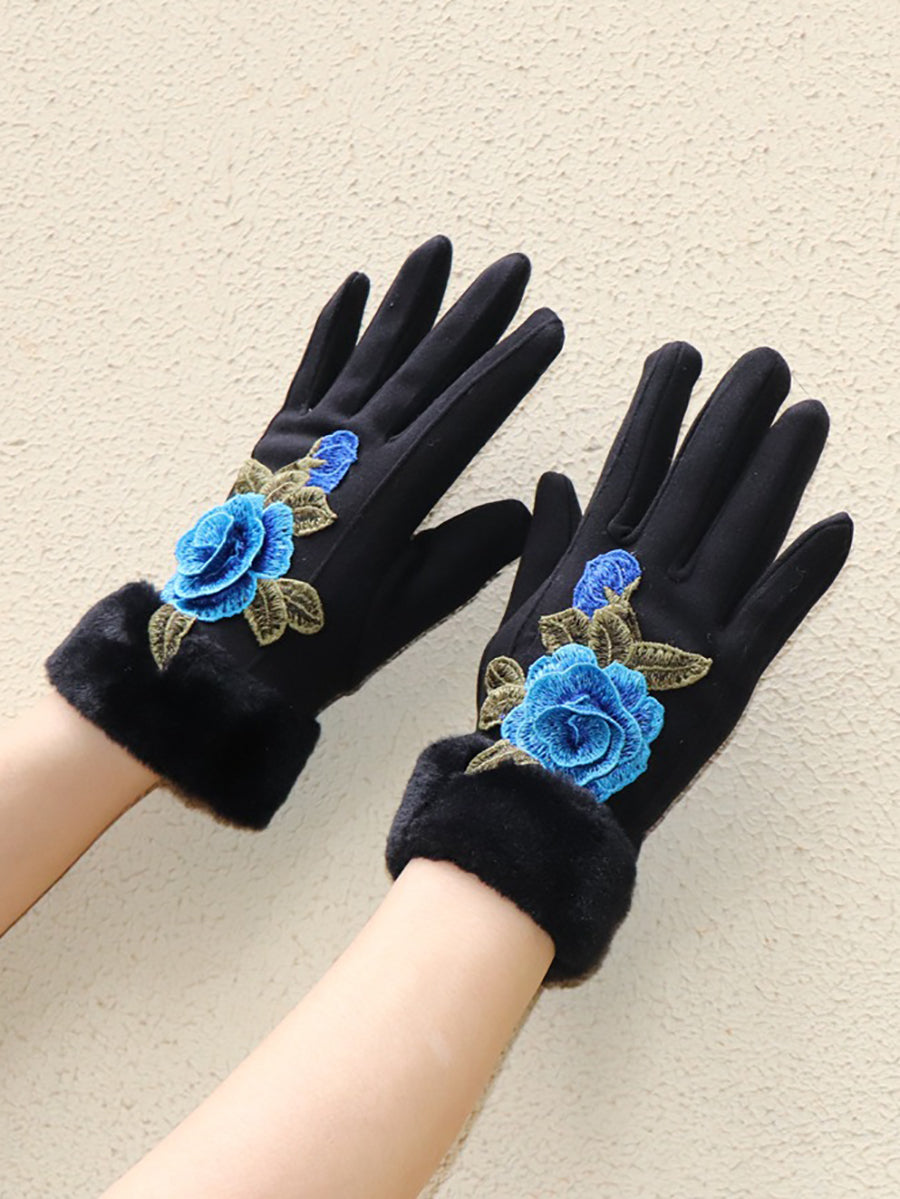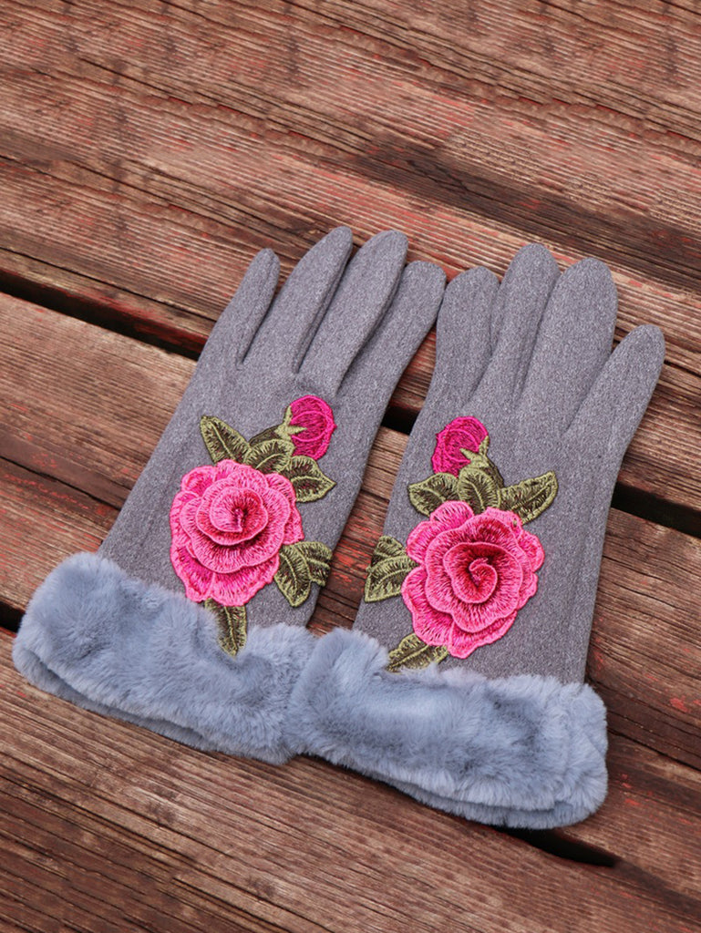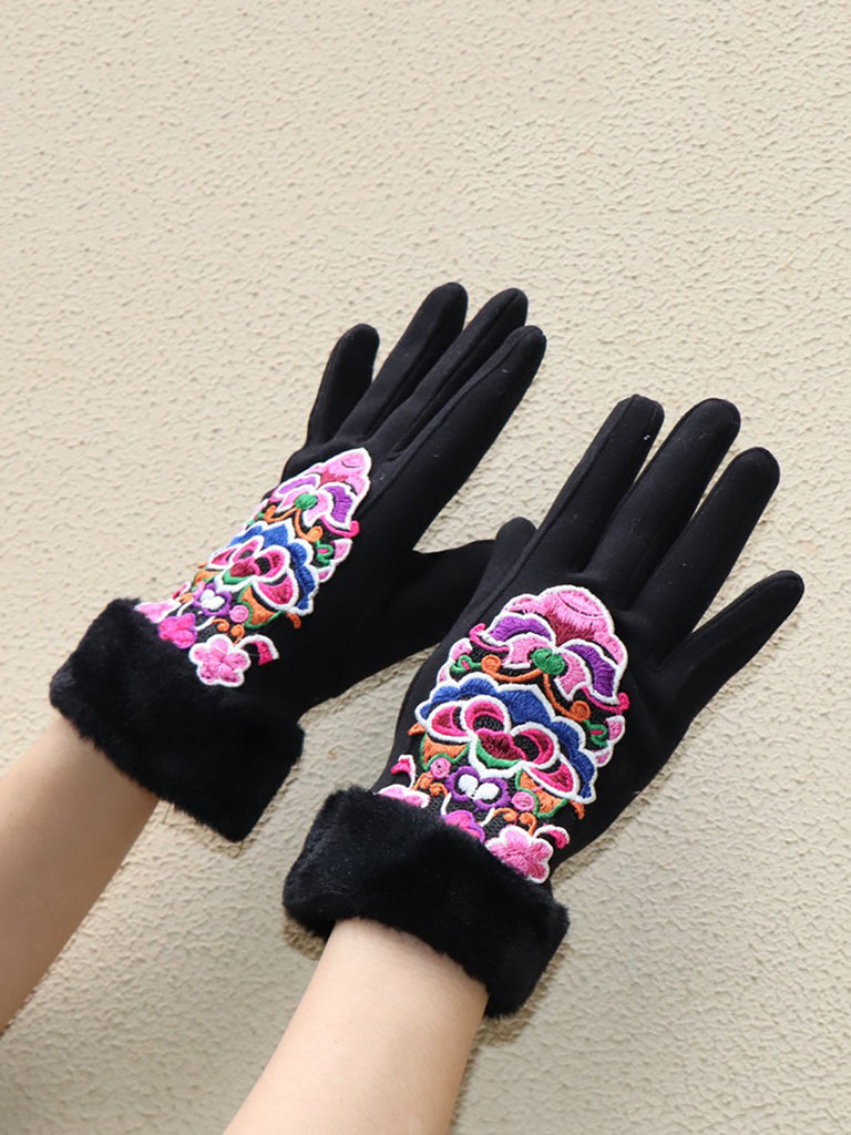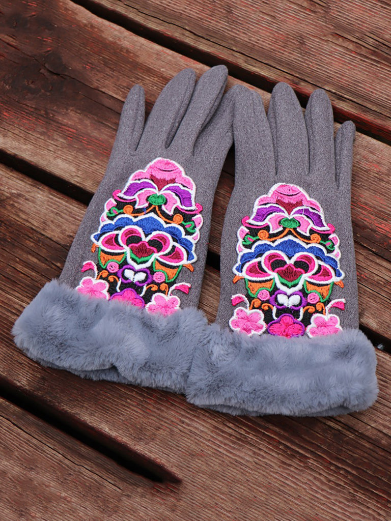 Women Artsy Winter Embroidery Fleece-lined Gloves