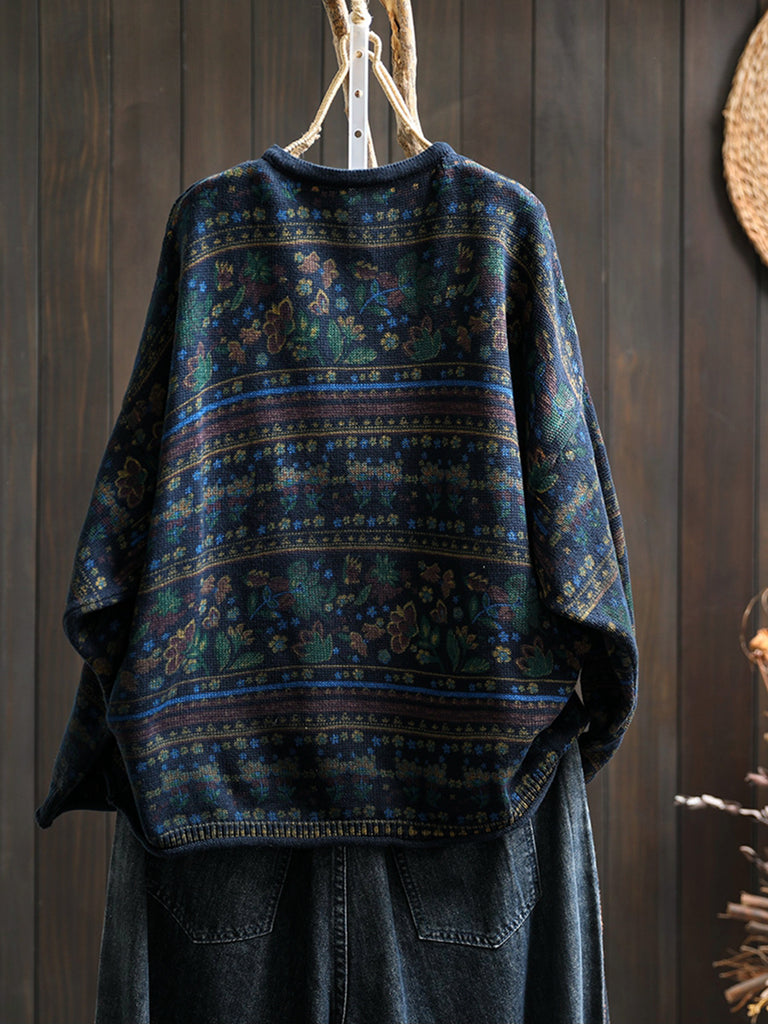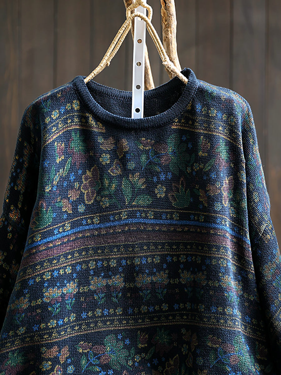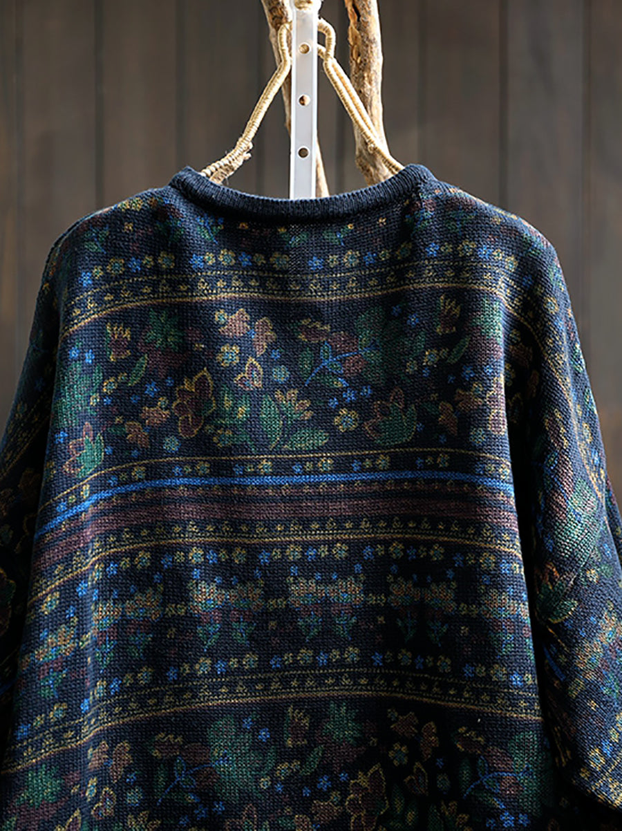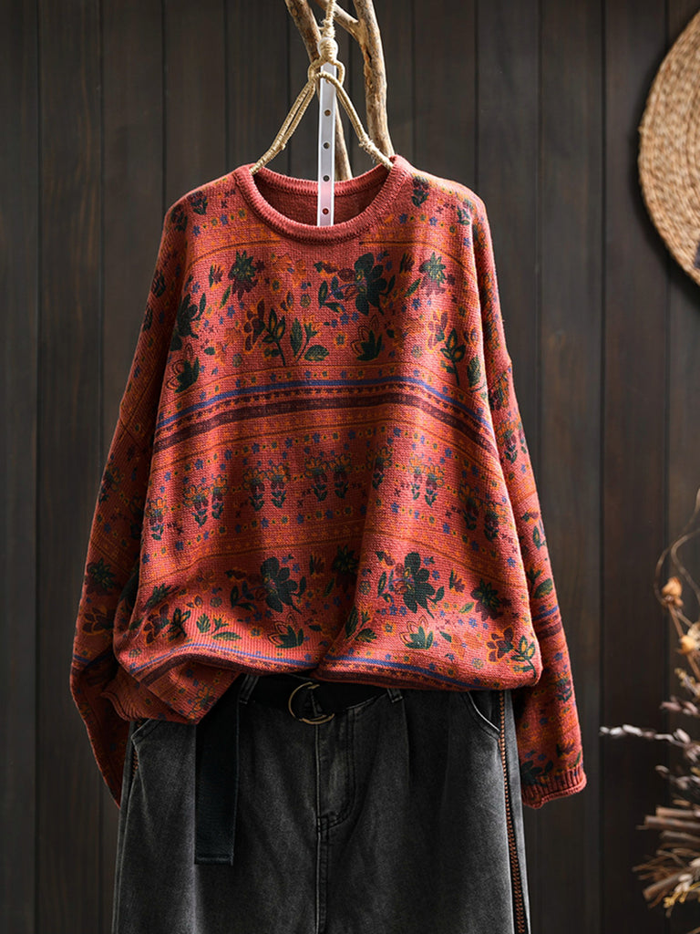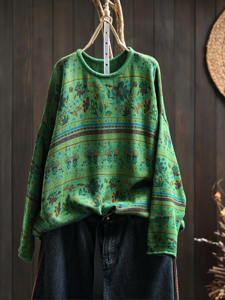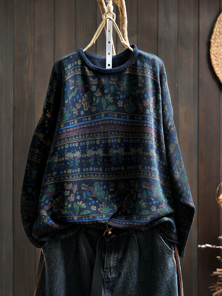Women Autumn Artsy Flower Knitted O-Neck Sweater