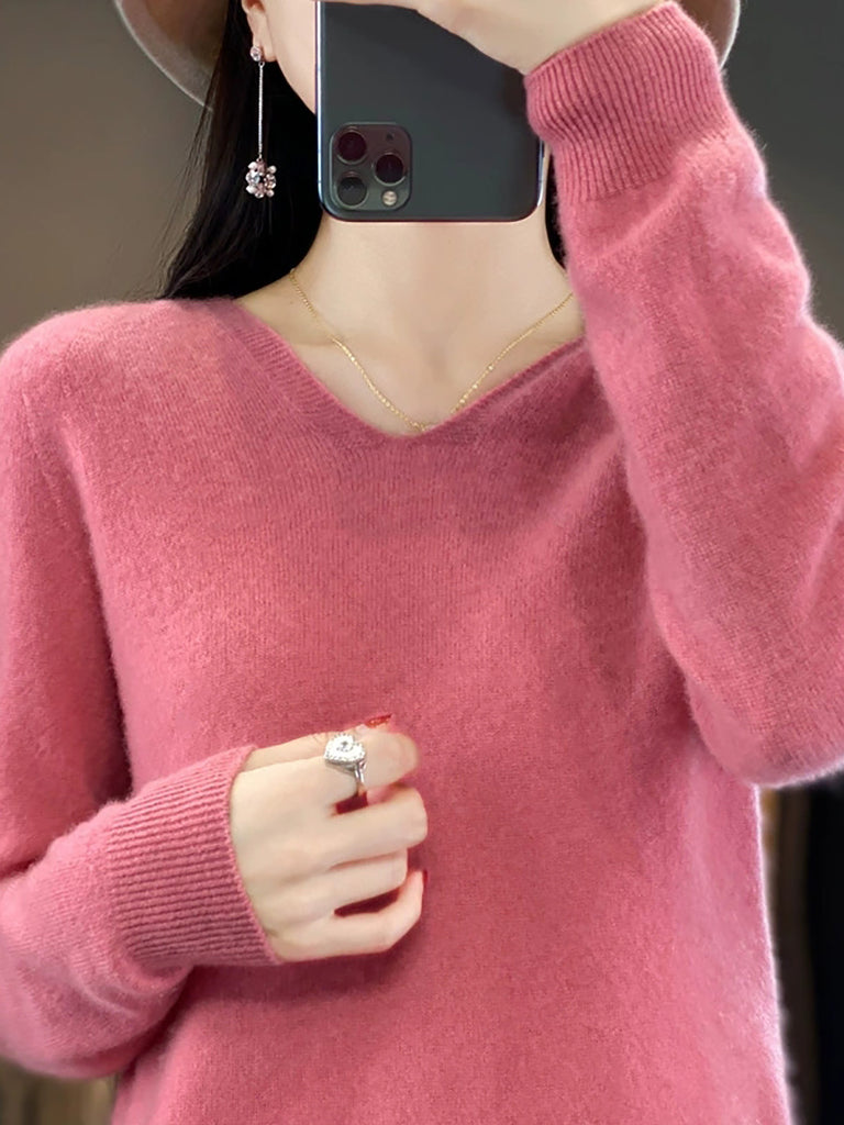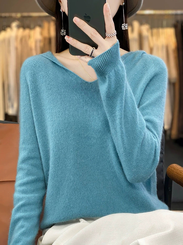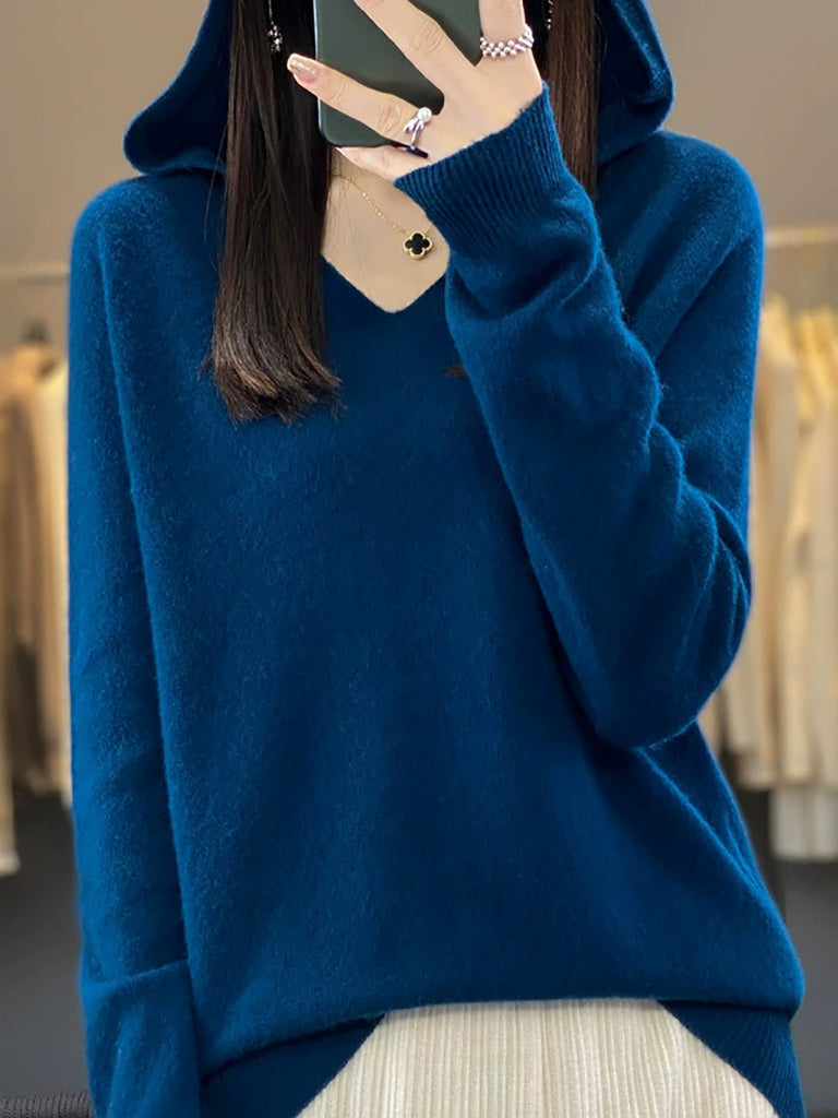 Women Autumn Casual Pure Color Knitted Hooded Sweater
