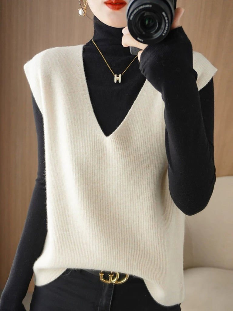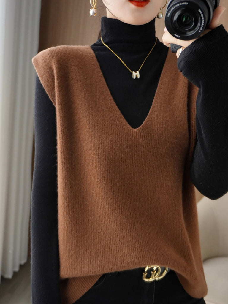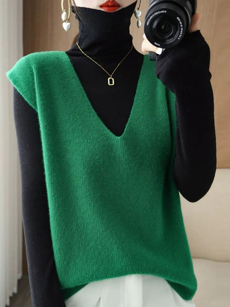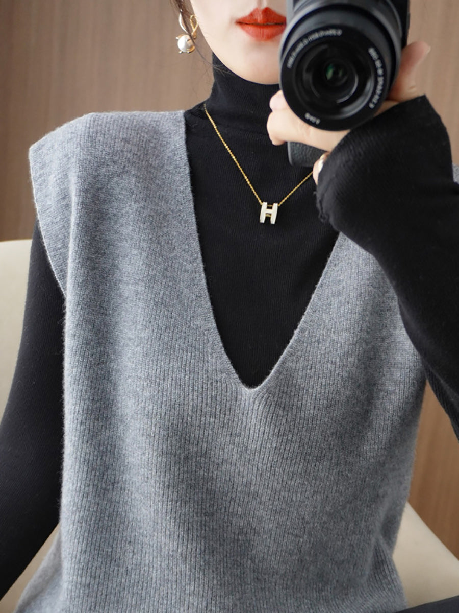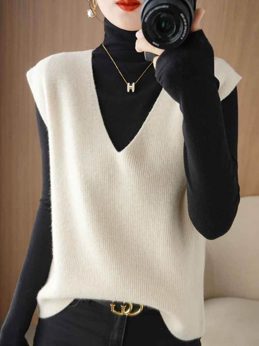 Women Autumn Casual Pure Color V-Neck Knitted Vest