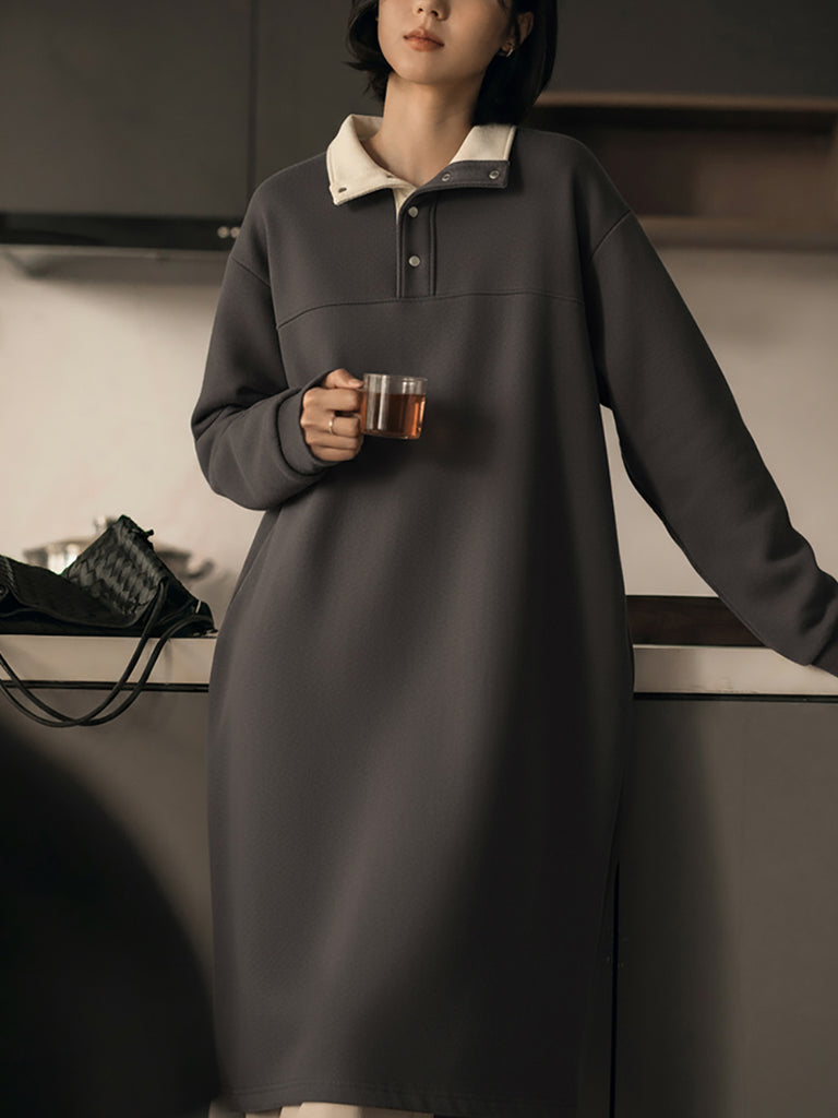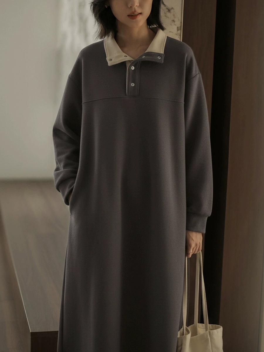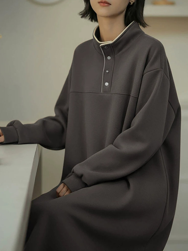 Women Autumn Pure Color Fleece-lined Stand Collar Dress