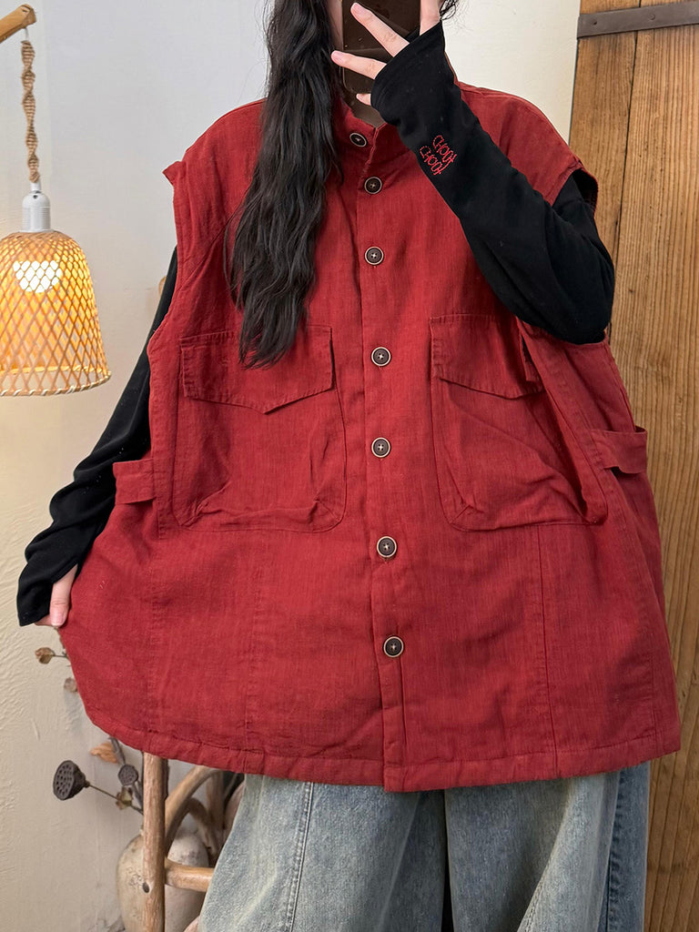 Women Autumn Pure Color Stand Collar Linen Padded Vest