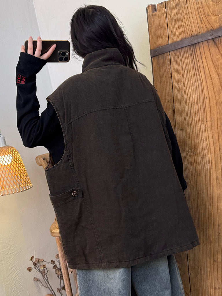 Crafted from linen, this vest features a solid color design with a stand-up collar. Its vintage style makes it ideal for autumn and winter wear