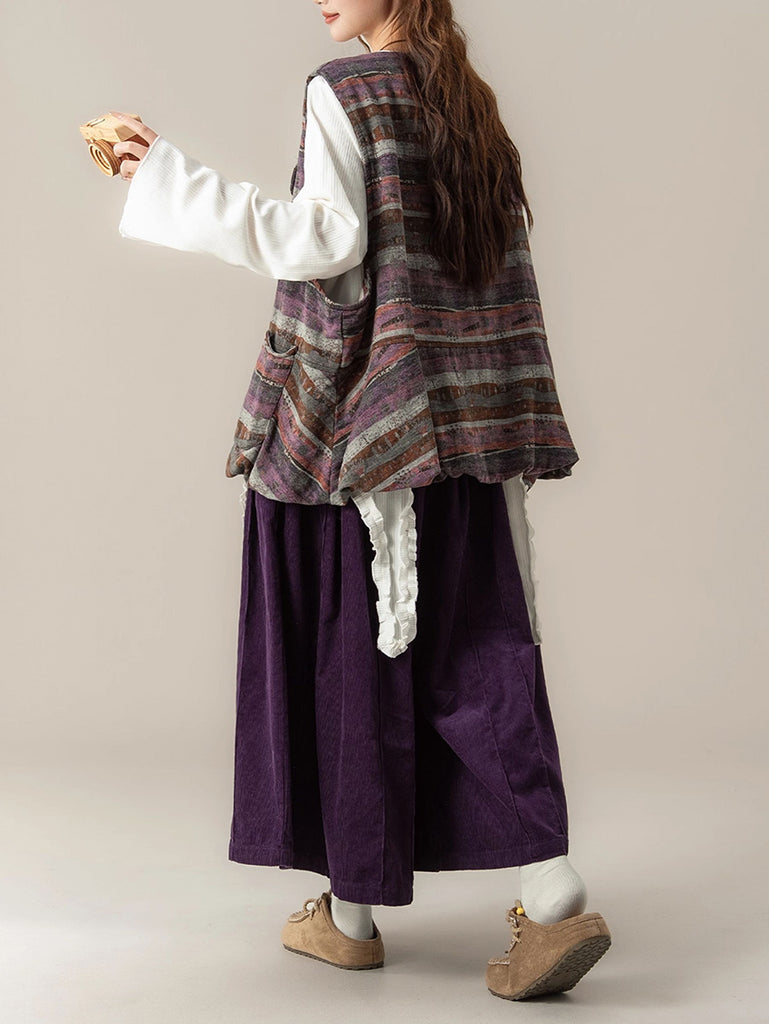 Women Autumn Retro Colorblock Stripe O-Neck Vest