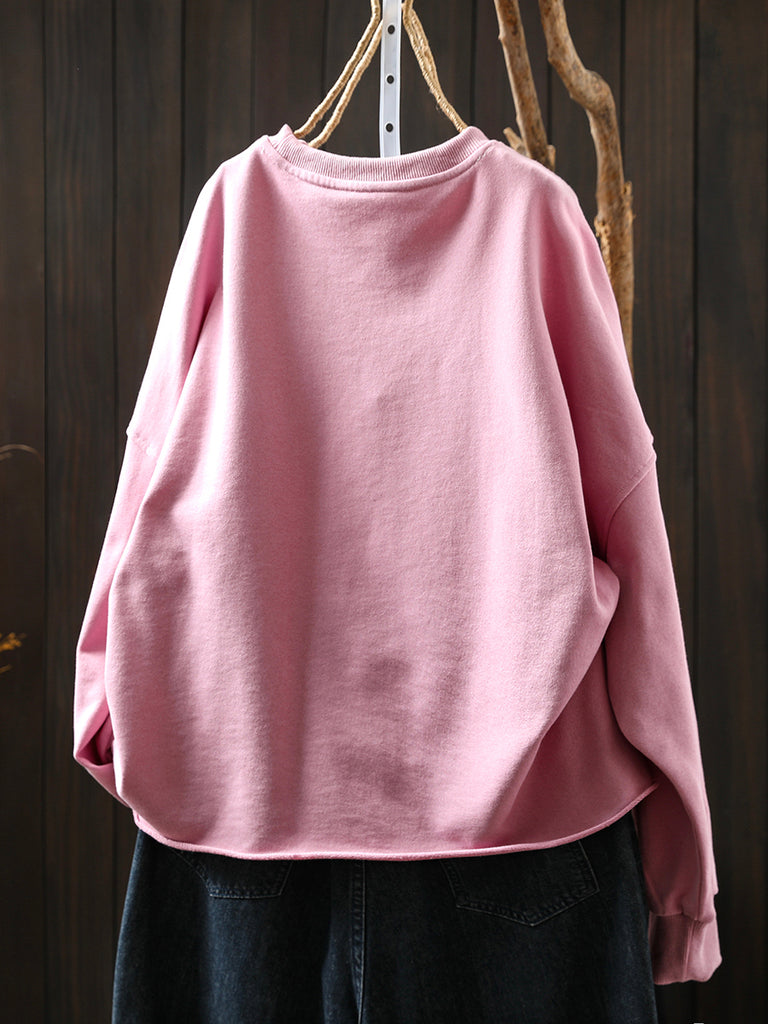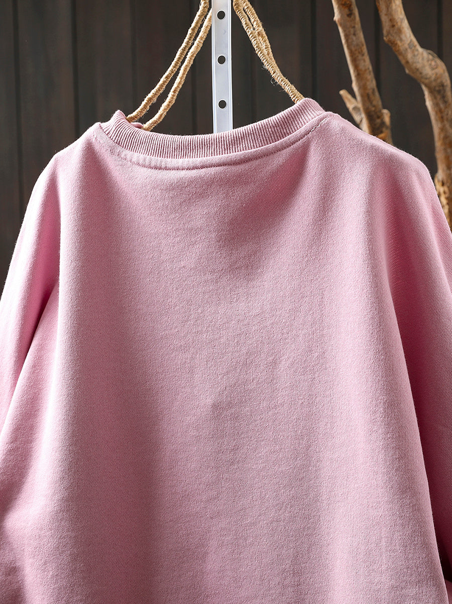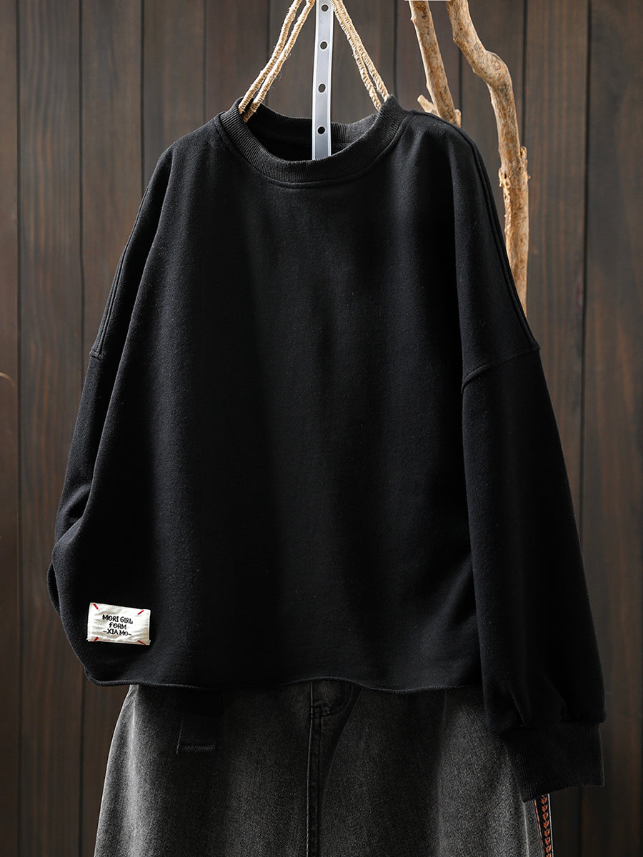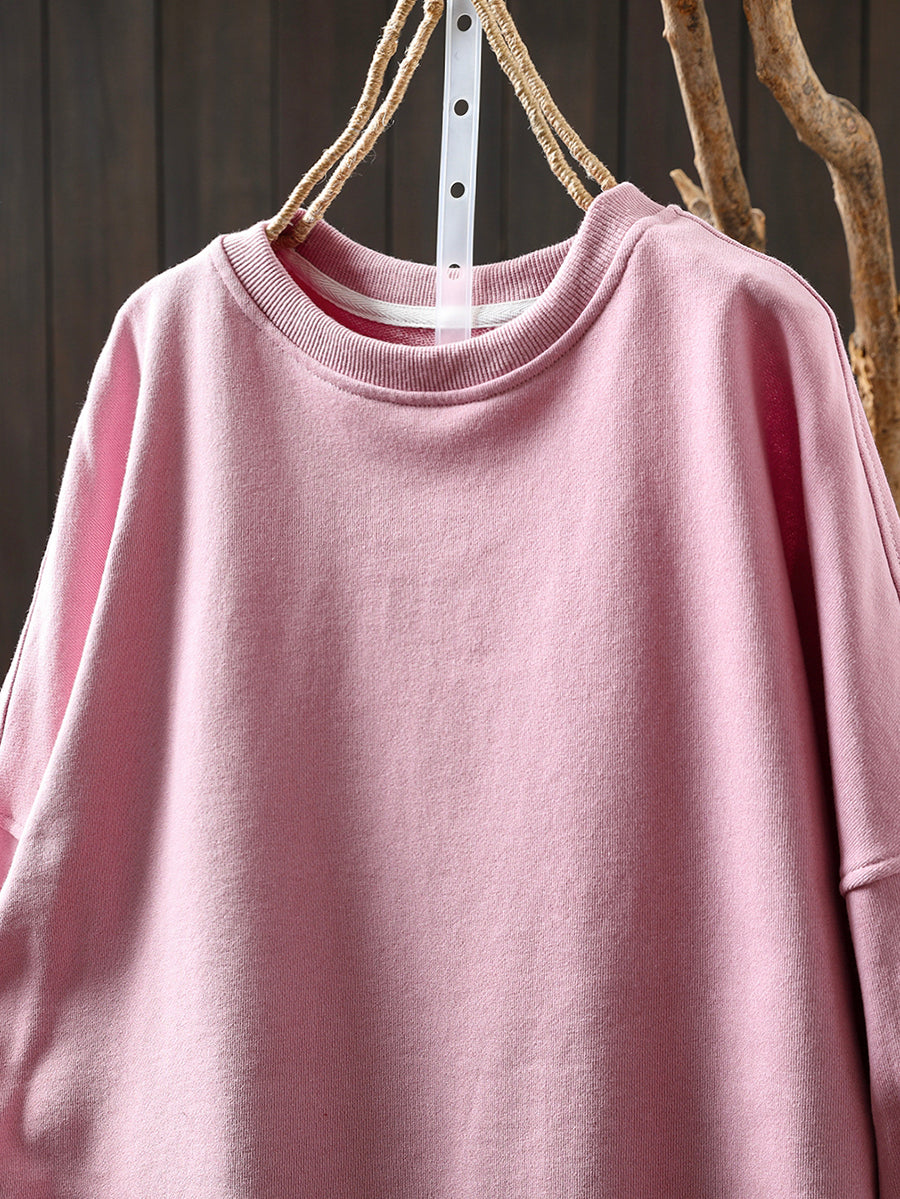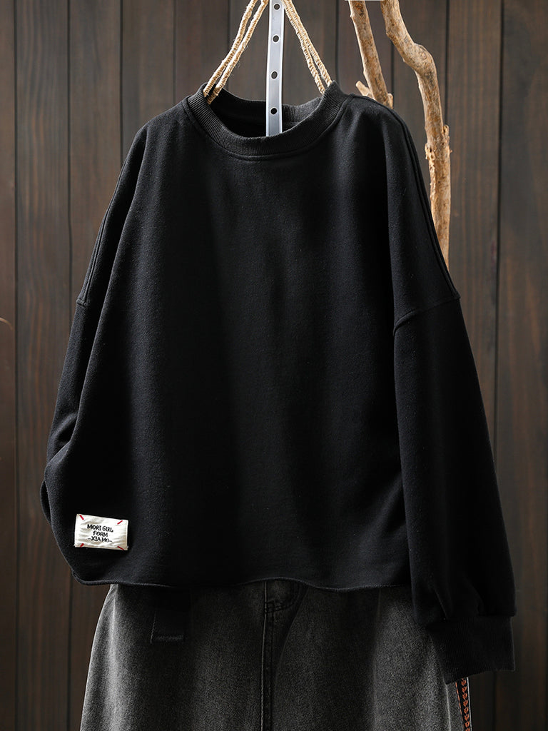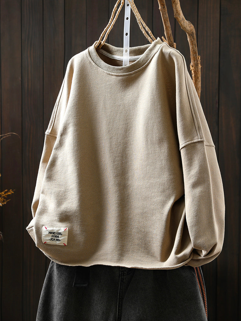 Women Autumn Retro Pure Color O-Neck Cotton Blouse
