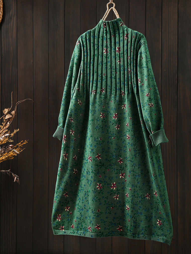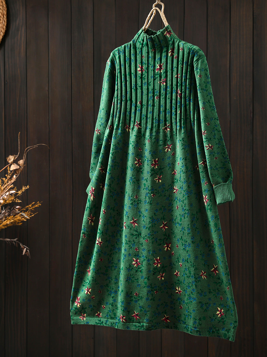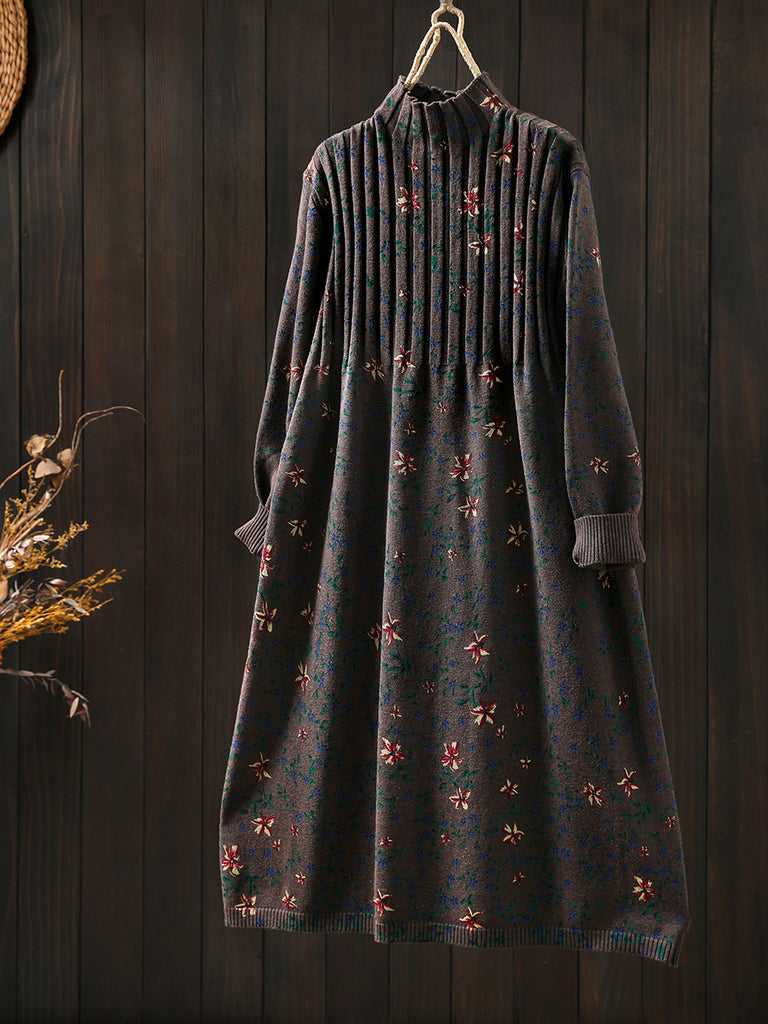 Women Autumn Vintage Floral Half-Turtleneck Knitted Dress