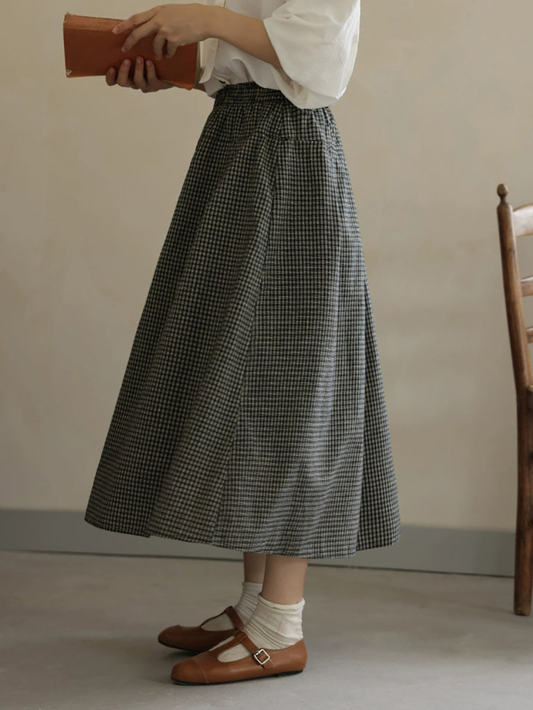Women Autumn Vintage Lattice A-Shape 100%Cotton Skirt