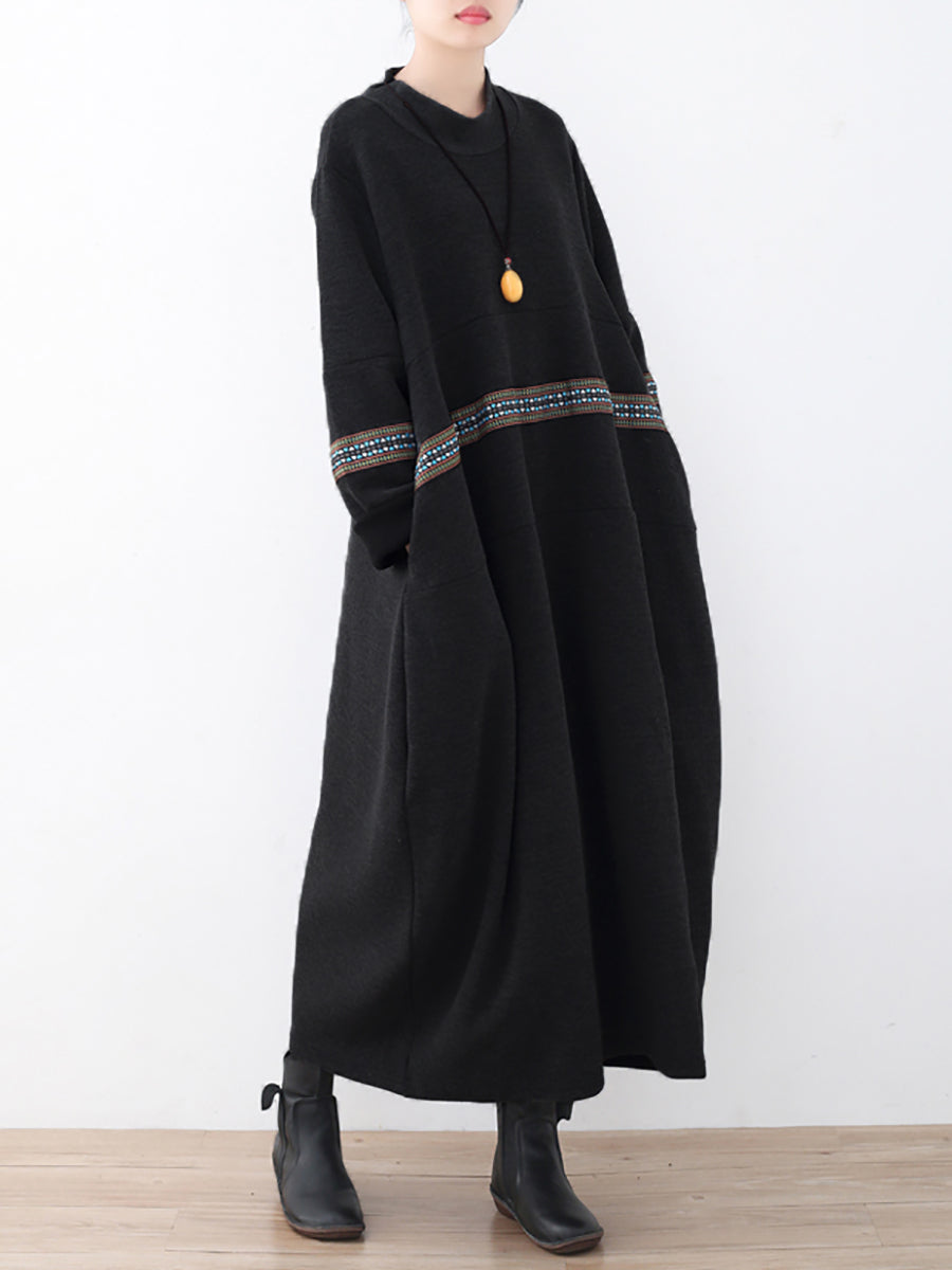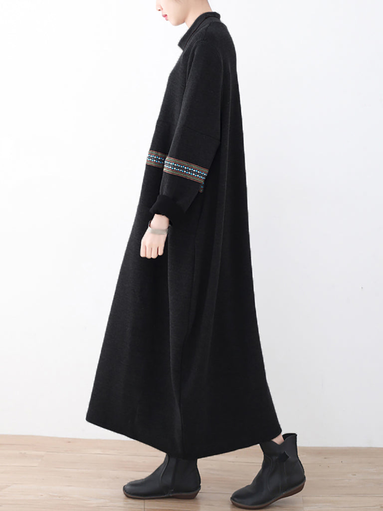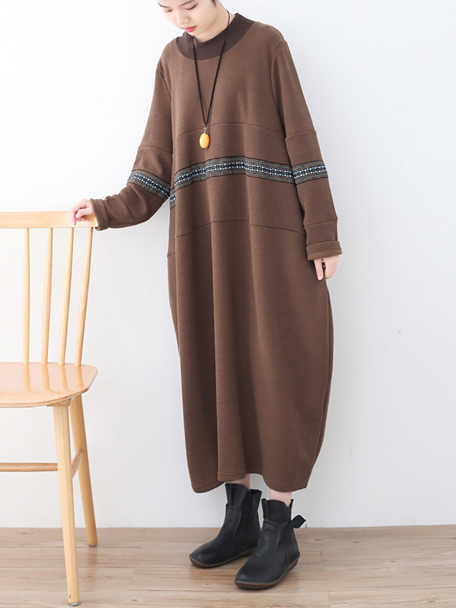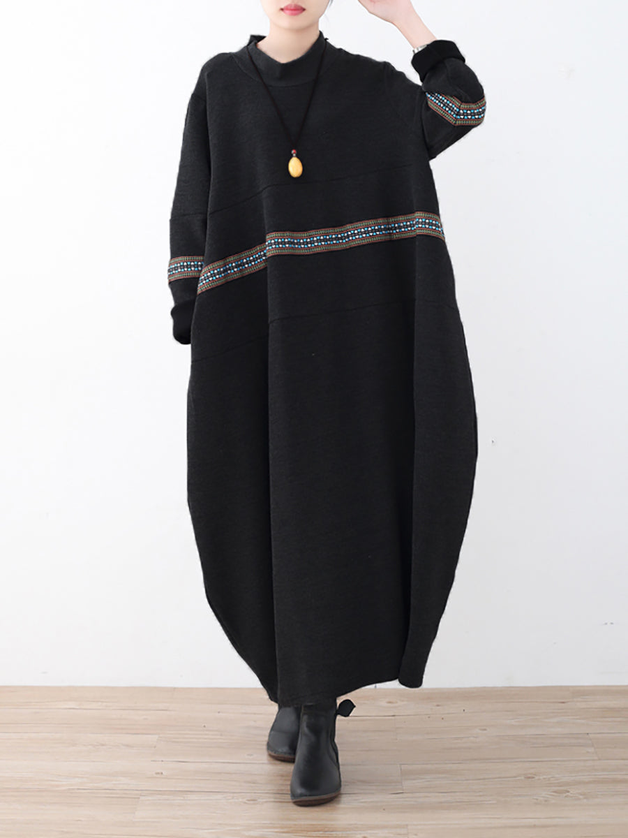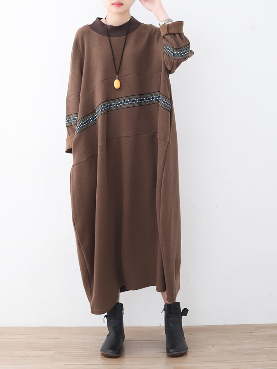 This dress is made from a material blend of polyester and spandex, featuring a half turtleneck collar and colorblock design. The sleeves are regular length and full, while the dress itself falls to ankle length. This dress is perfect for the spring and autumn seasons, adding a pop of color to your wardrobe.