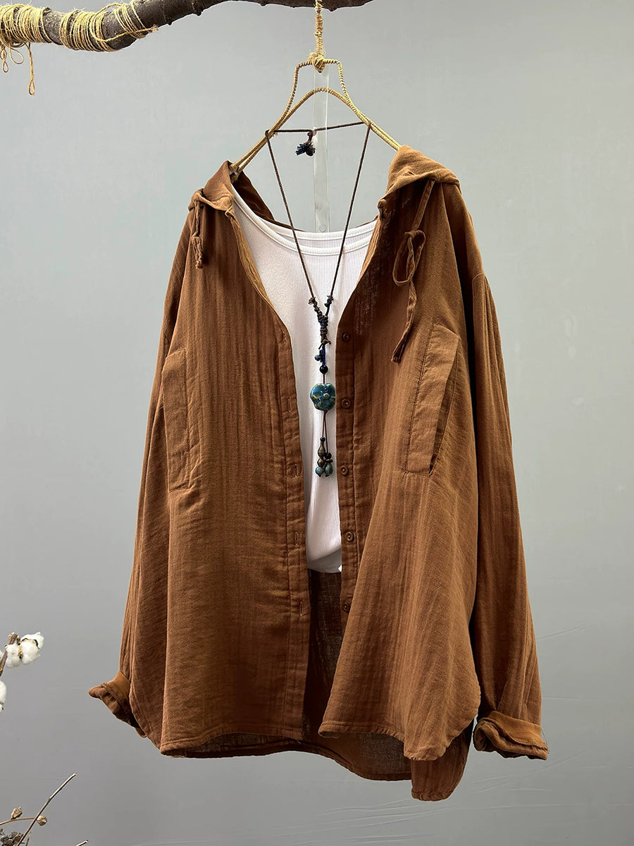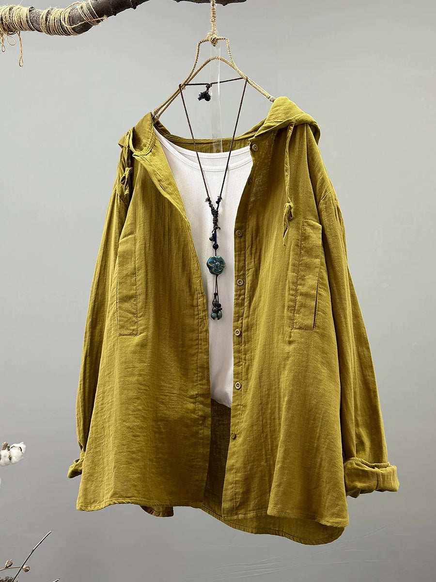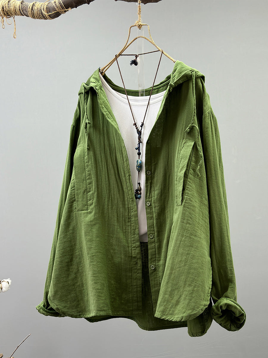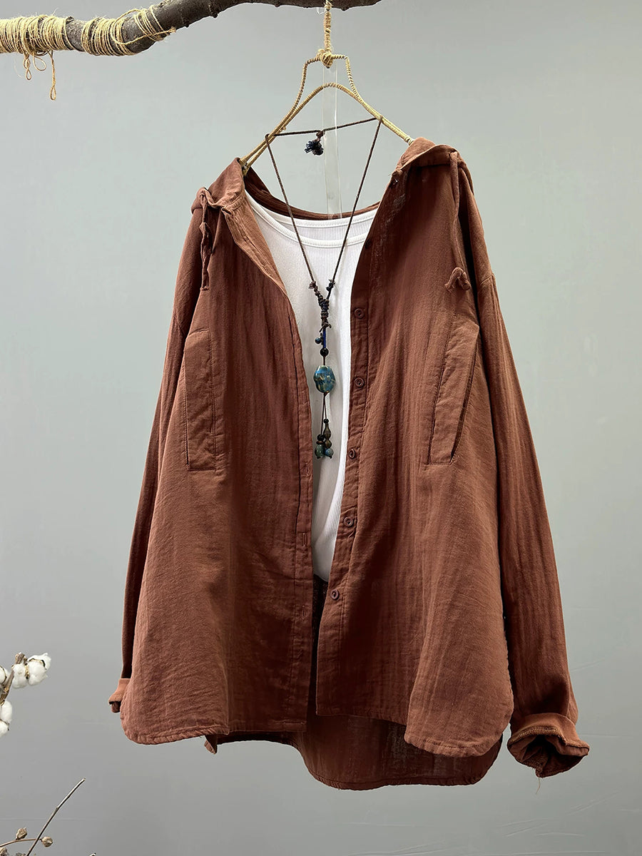 Women Casual Pure Color 100%Cotton Hooded Coat