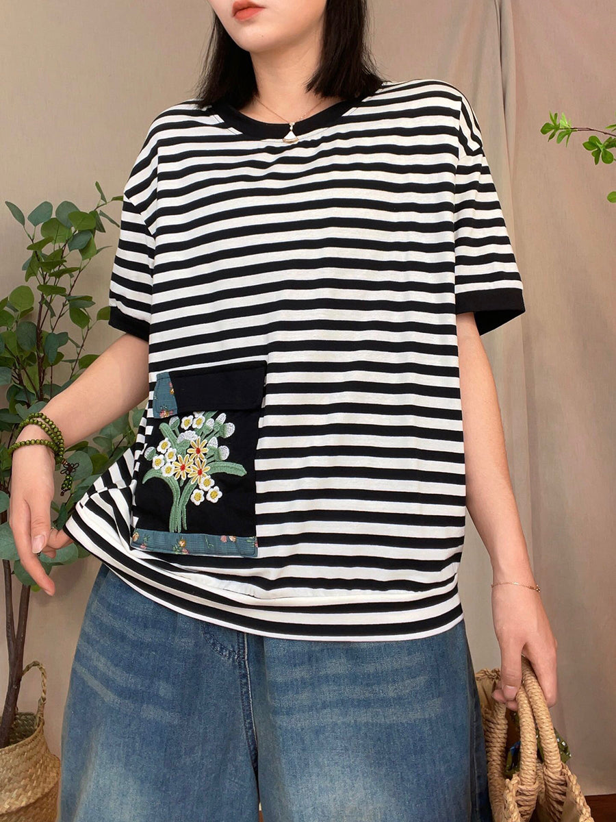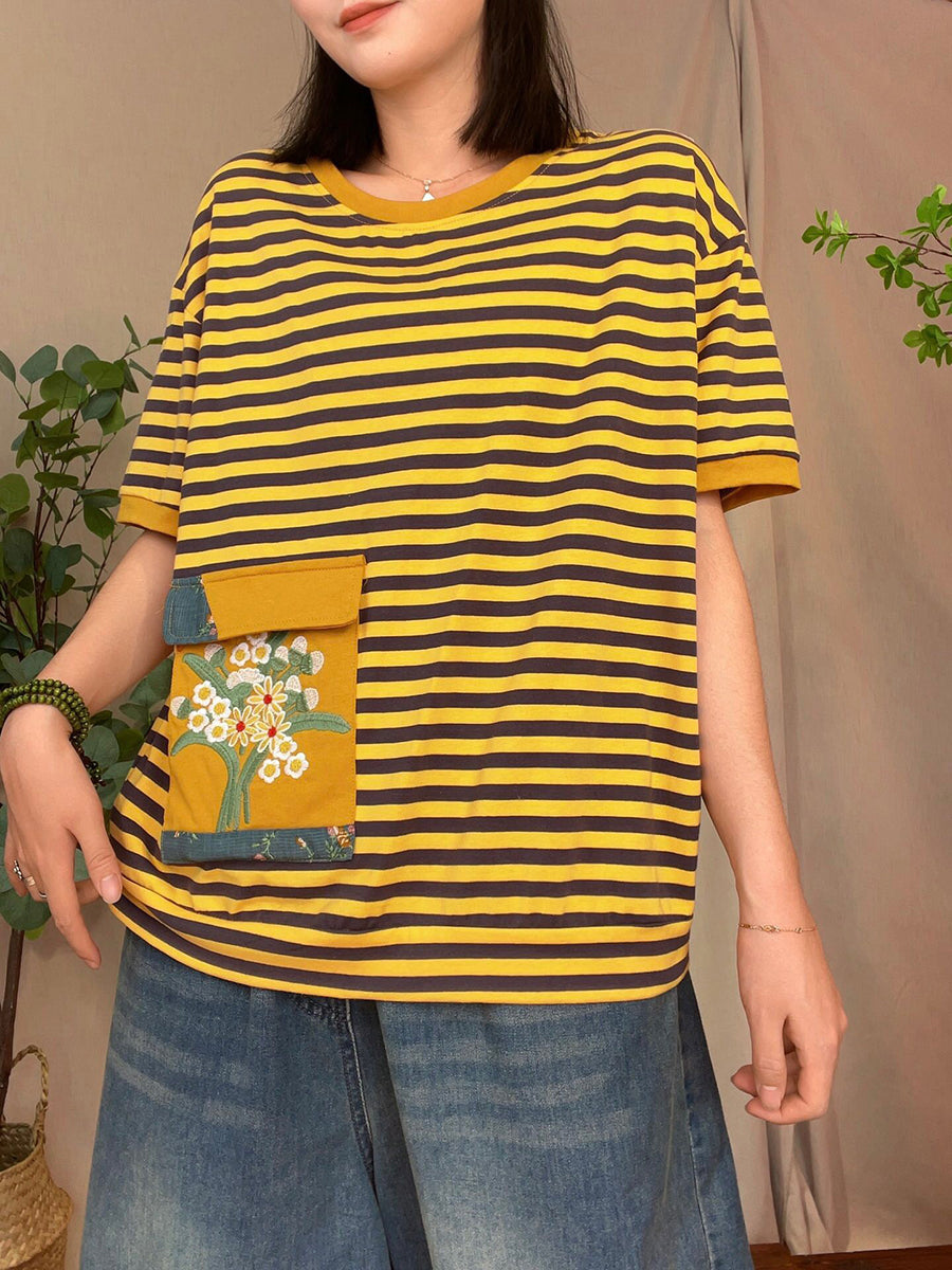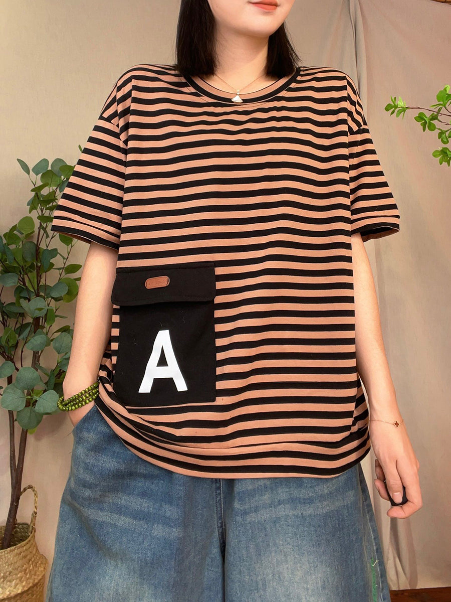Women Casual Summer Stripe Patch Pocket Shirt
