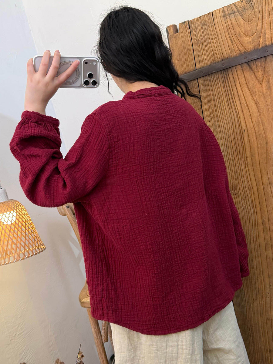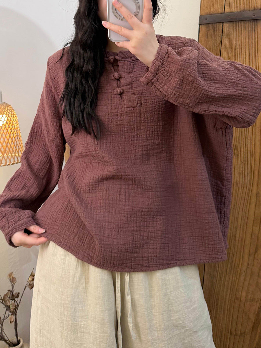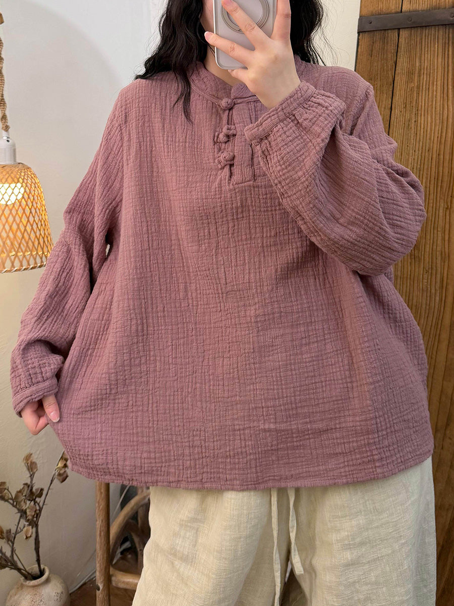 Women Ethnic Spring Pure Color Stand Collar Blouse