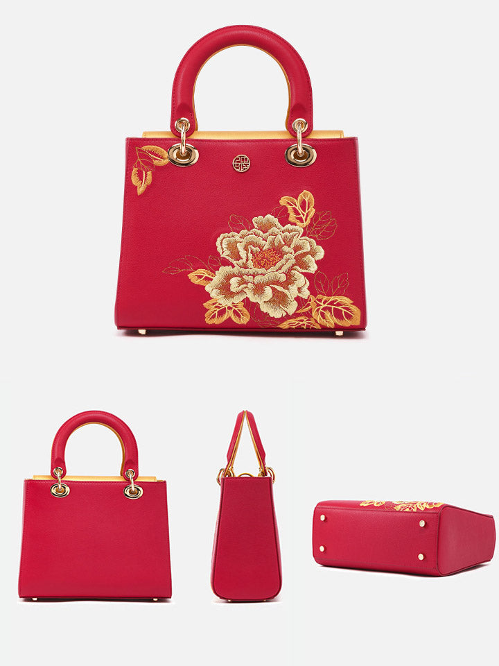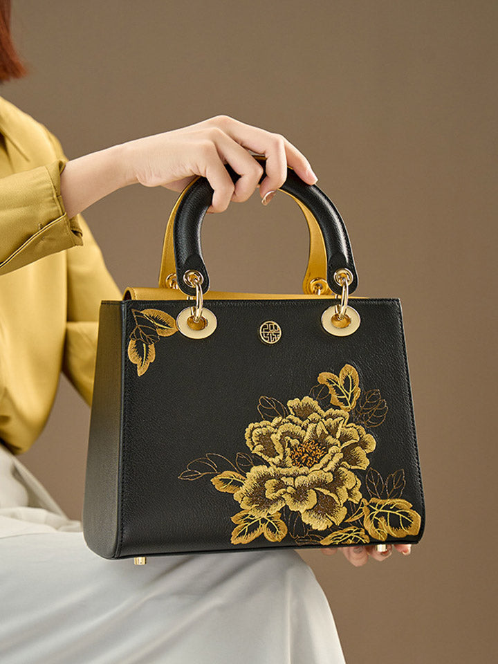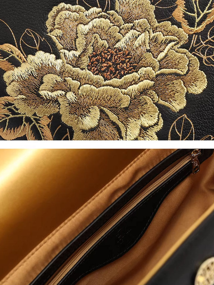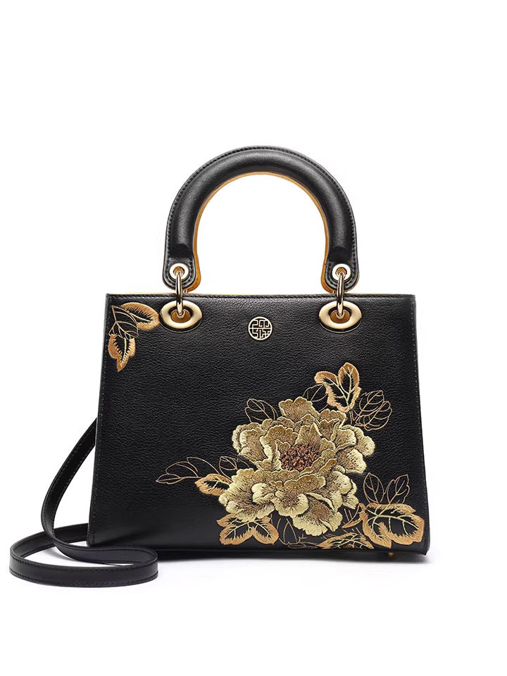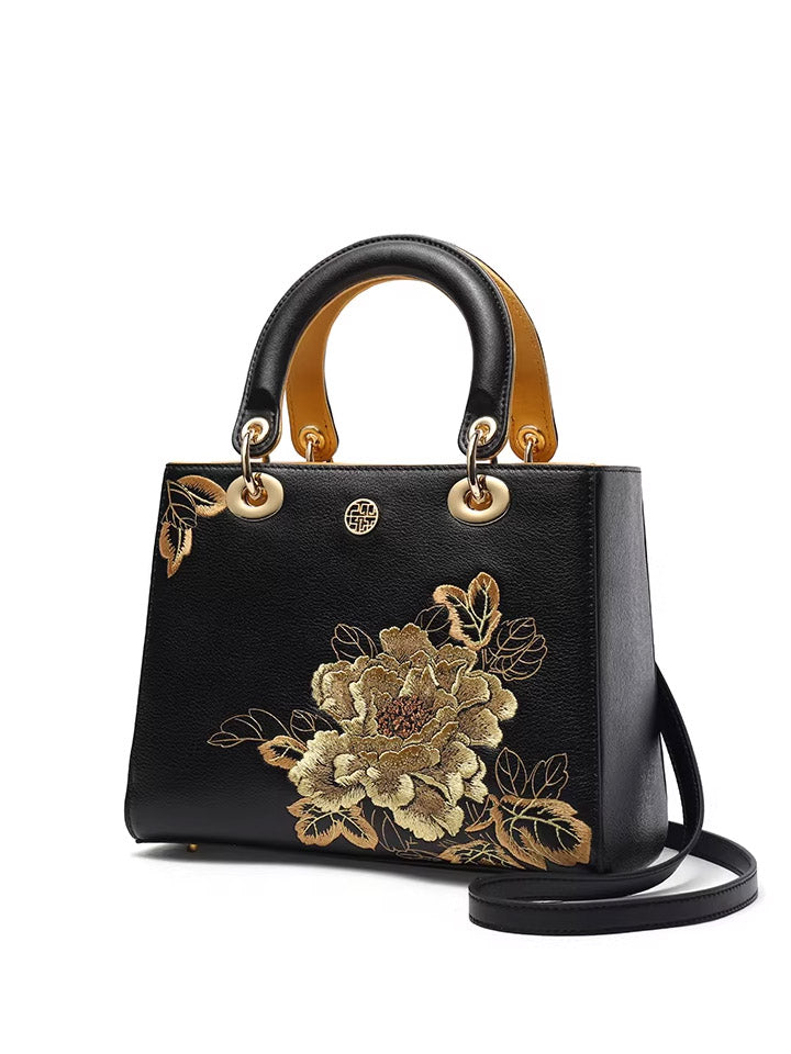 Women Flower Embroidery Leather Handbag