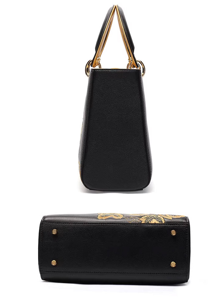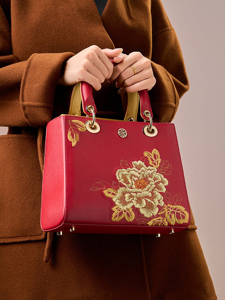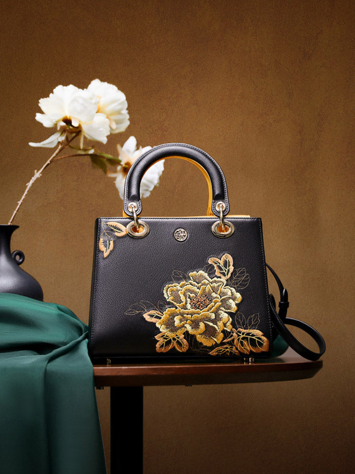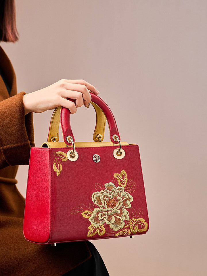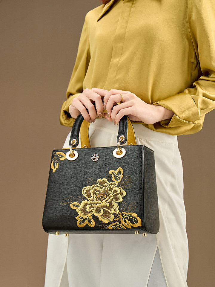 Women Flower Embroidery Leather Handbag
