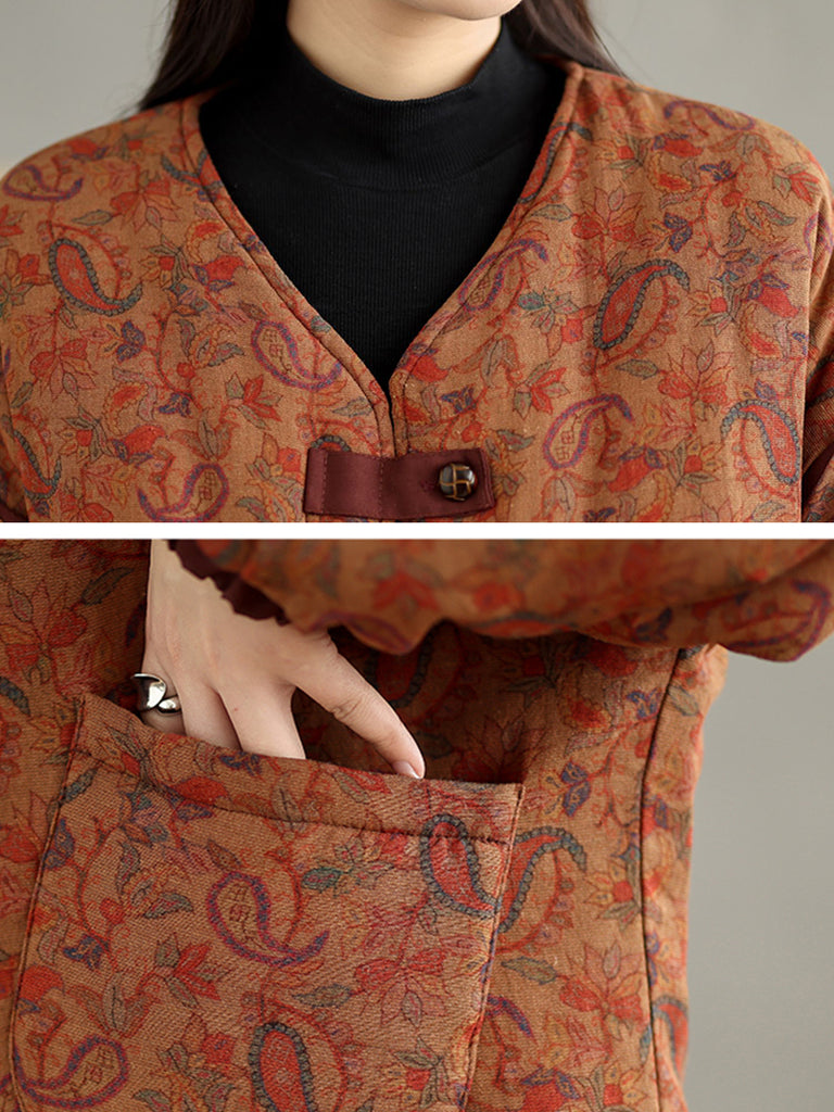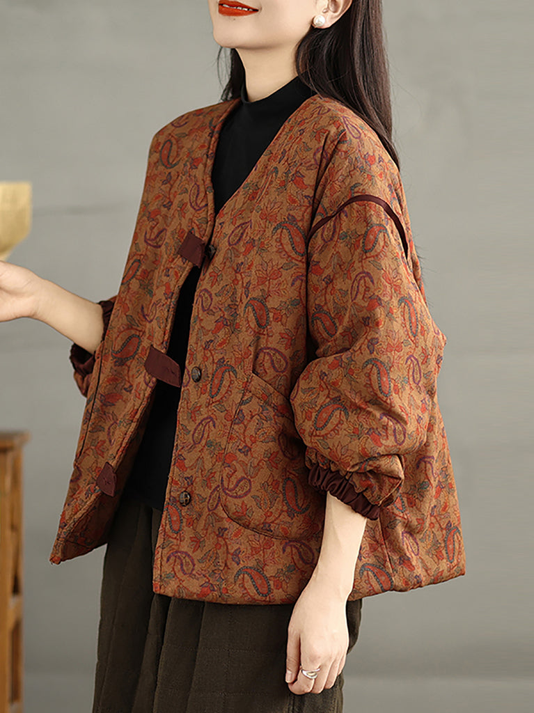 Women Retro Autumn Flower V-Neck Cotton Padded Coat