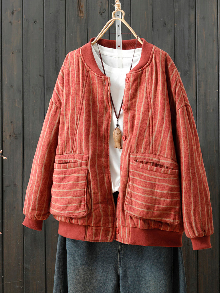 Women Retro Autumn Stripe Stand Collar Cotton Padded Coat