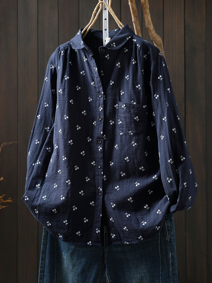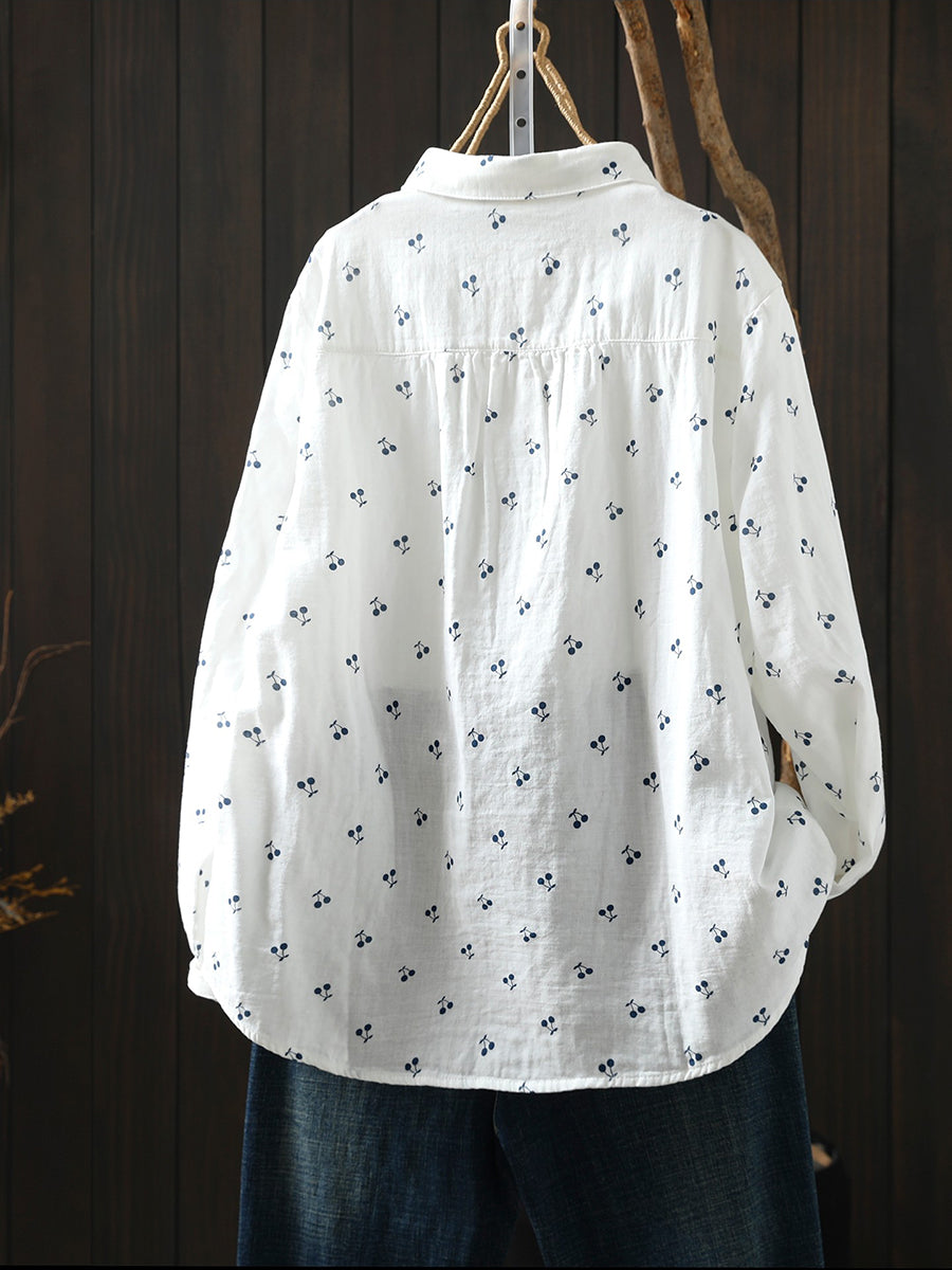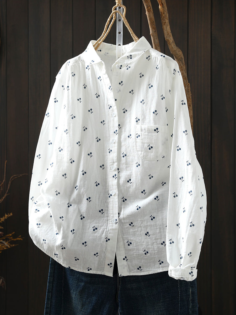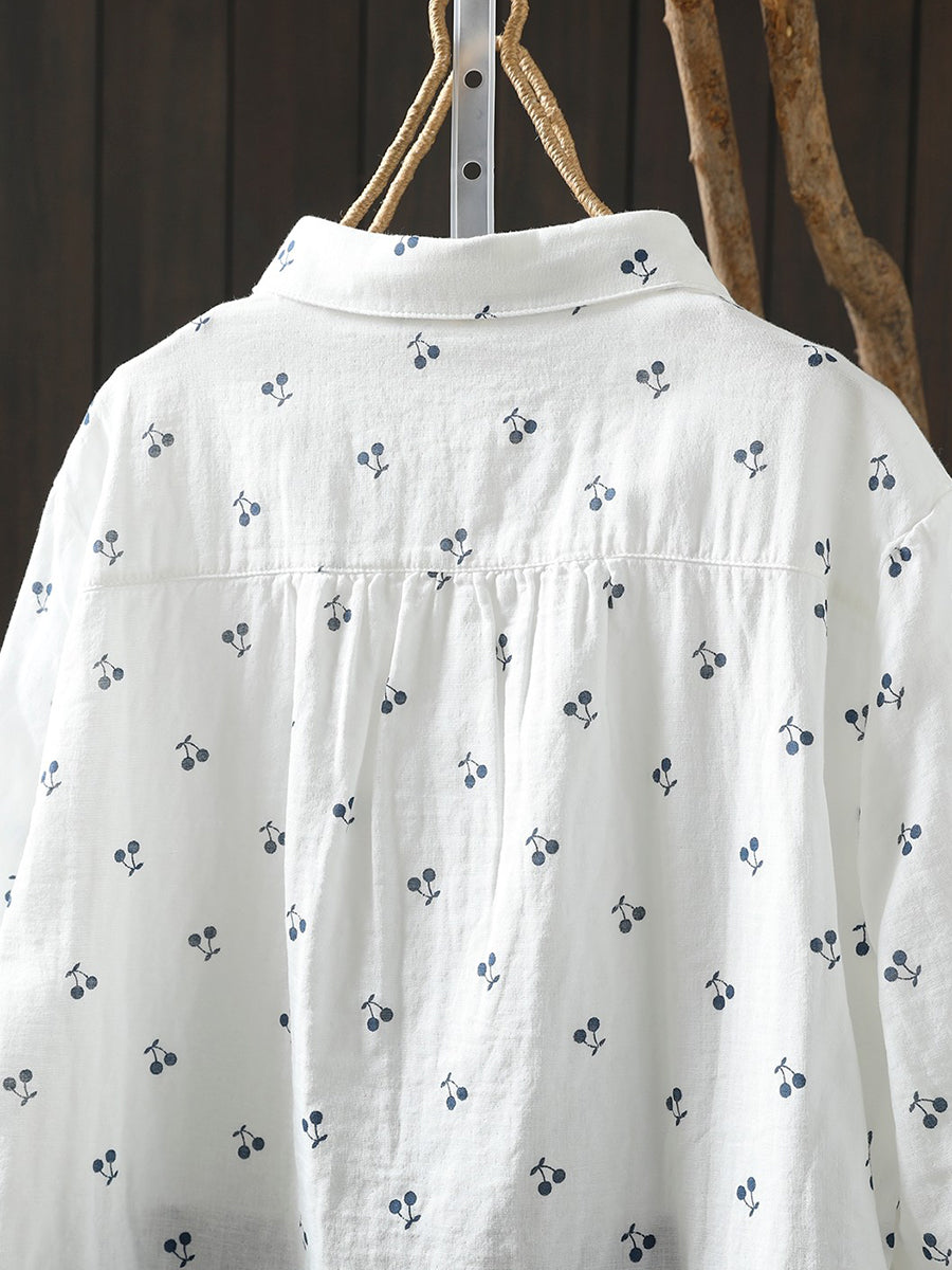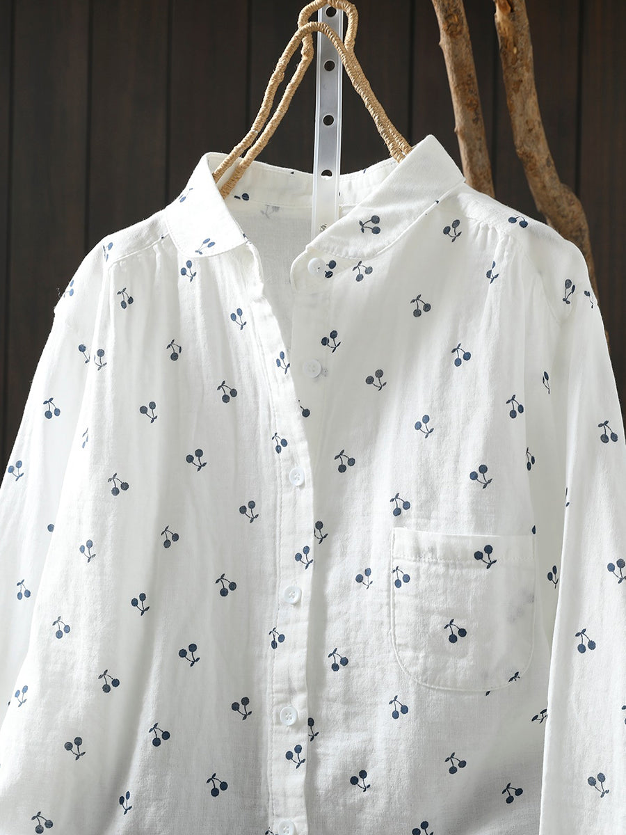 Women Spring Artsy Cherry Embroidery 100%Cotton Shirt