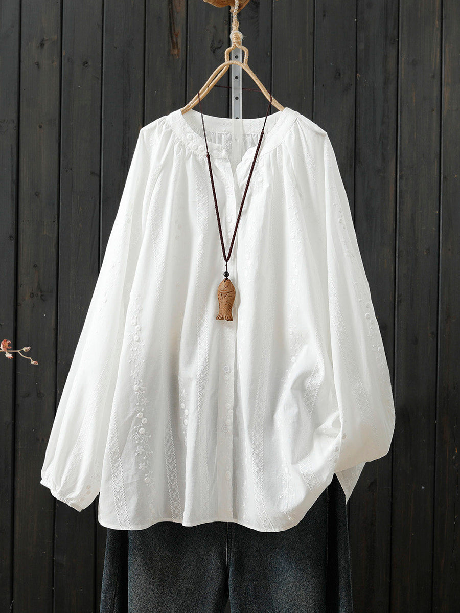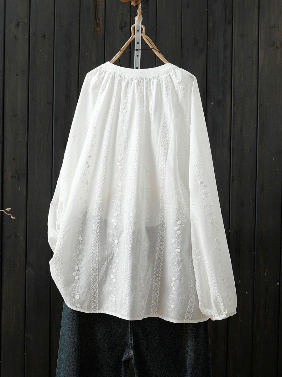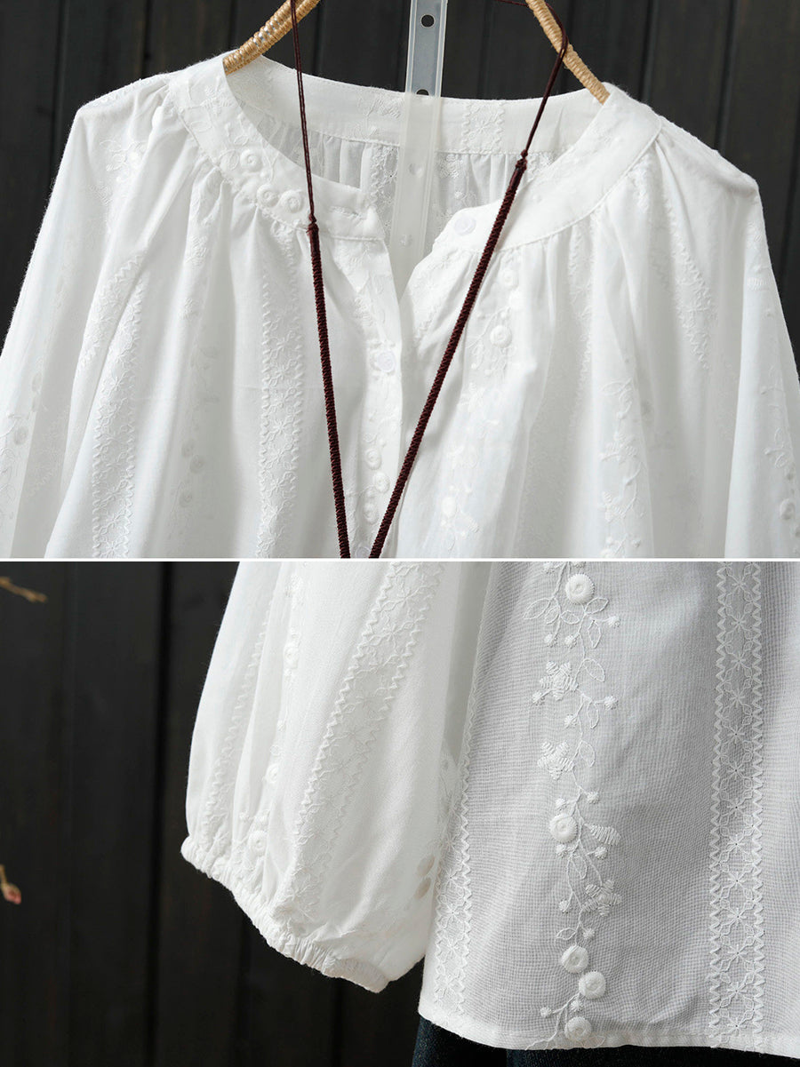 Women Spring Artsy Embroidery Cotton O-Neck Shirt