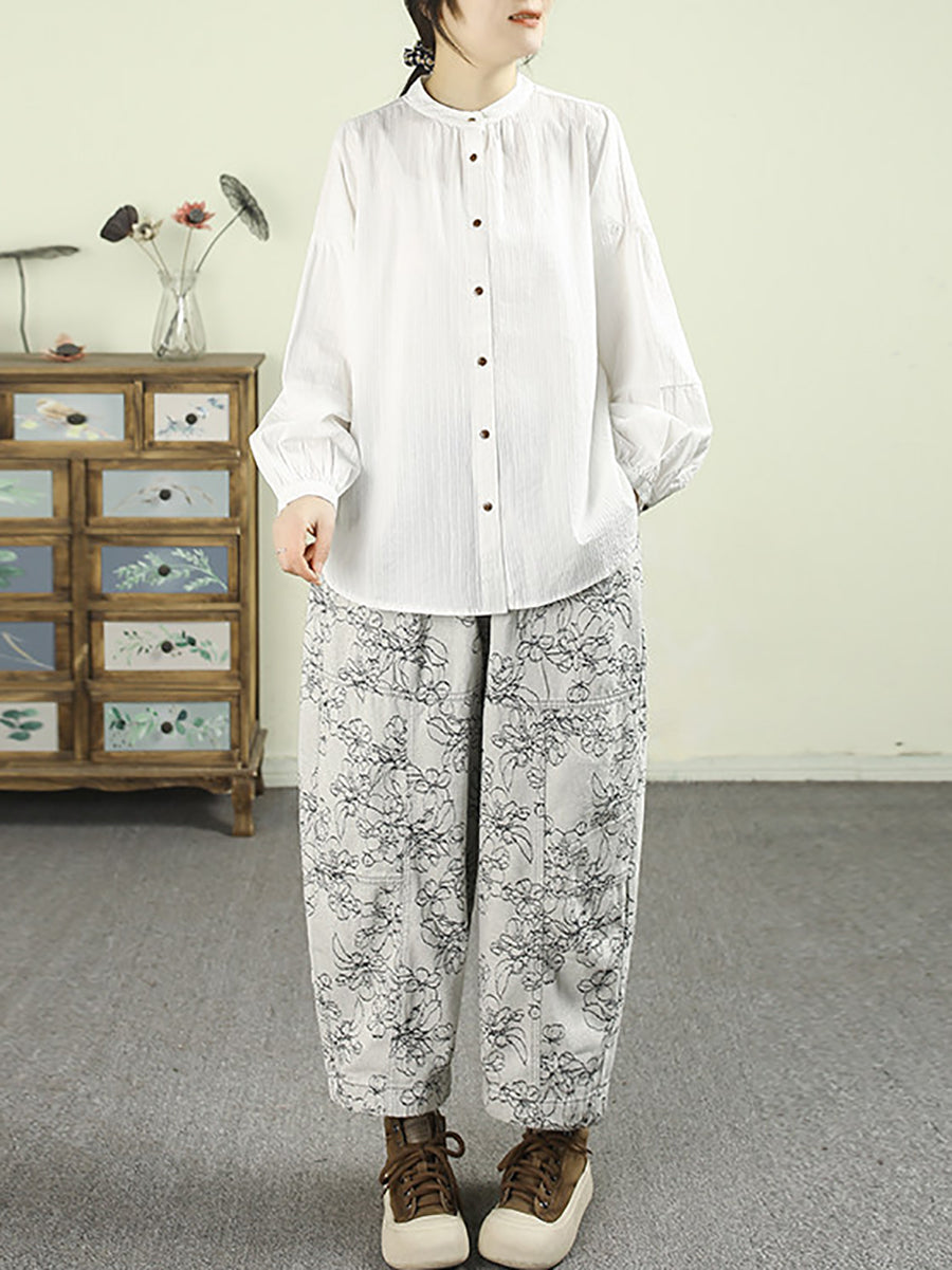 Women Spring Artsy Pure Color 100%Cotton Stand Collar Shirt