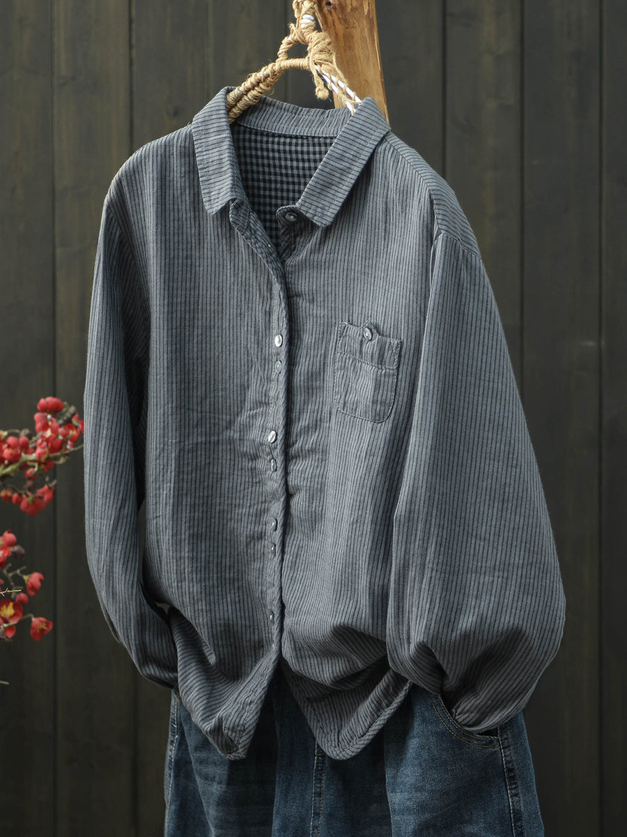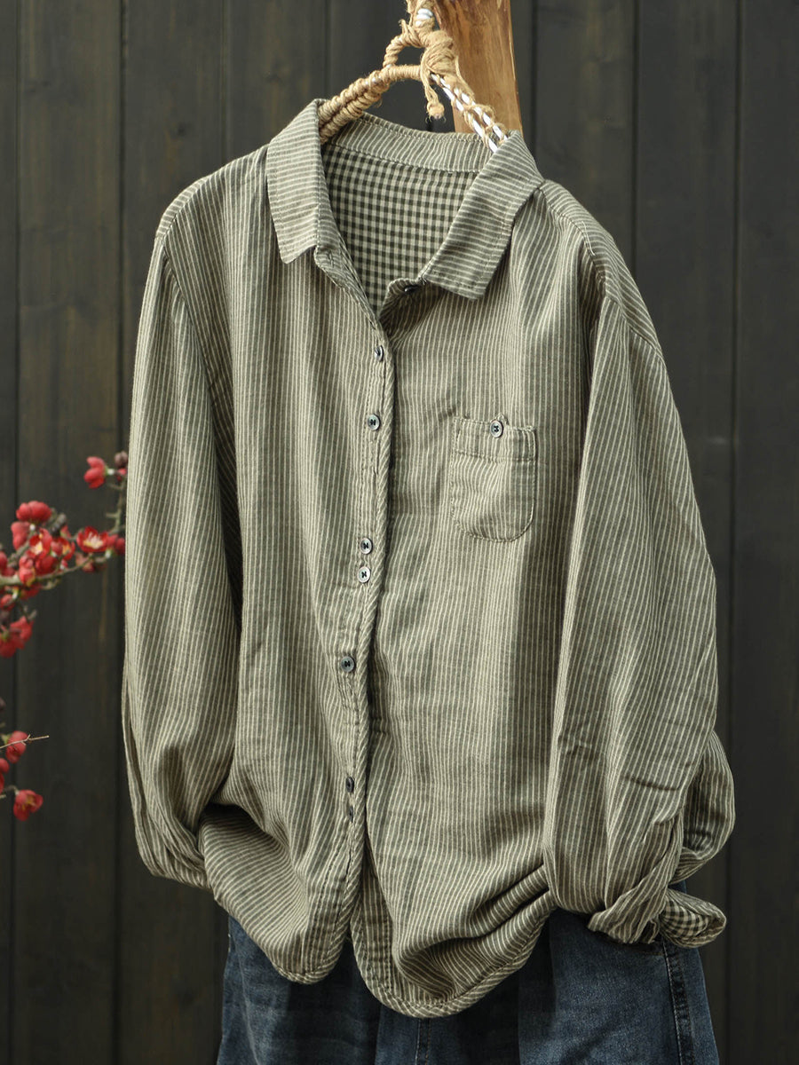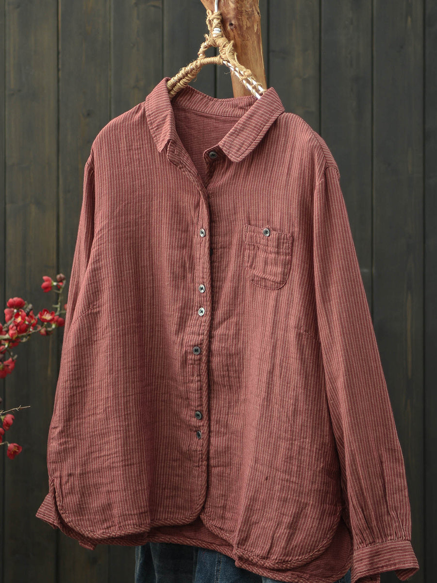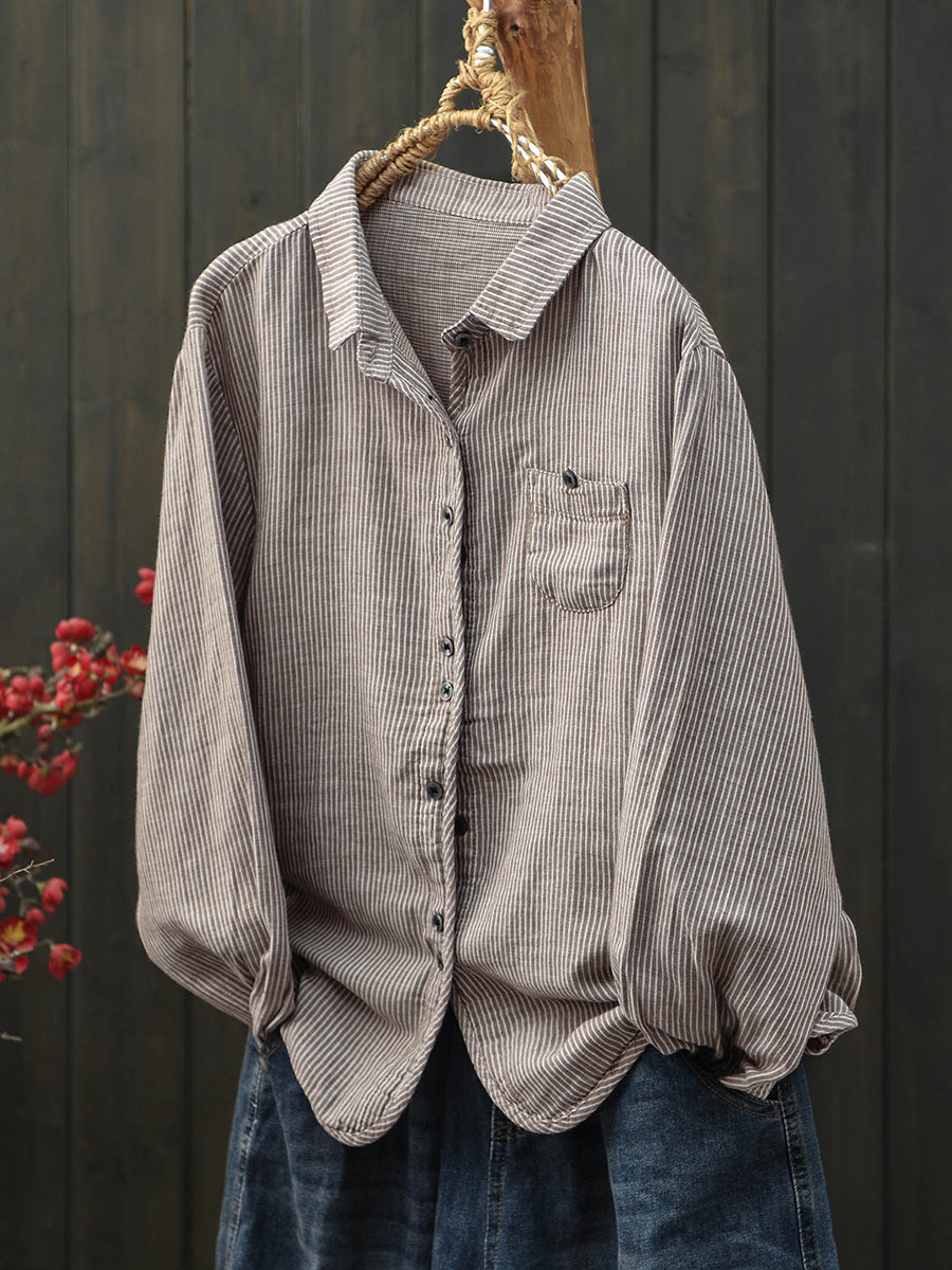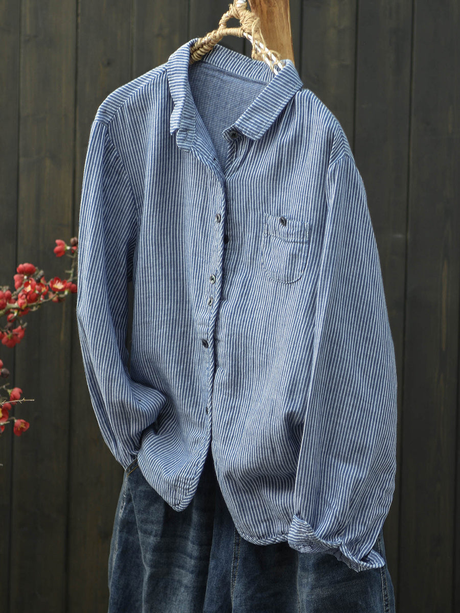 Women Spring Artsy Stripe Turn-down Collar Cotton Shirt