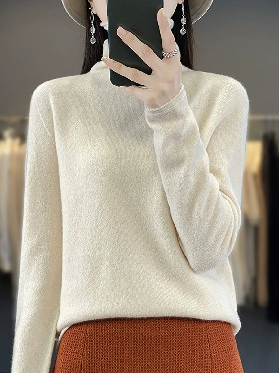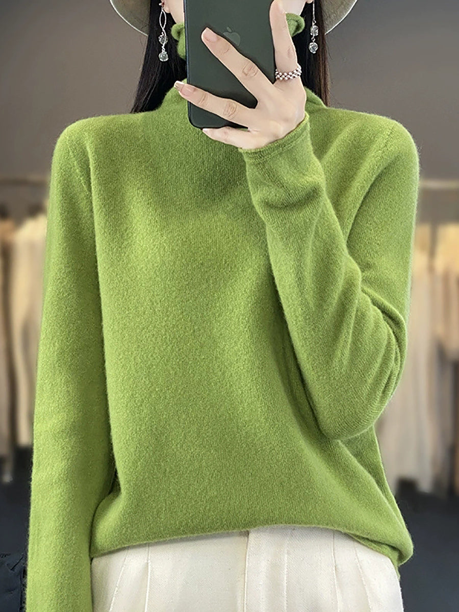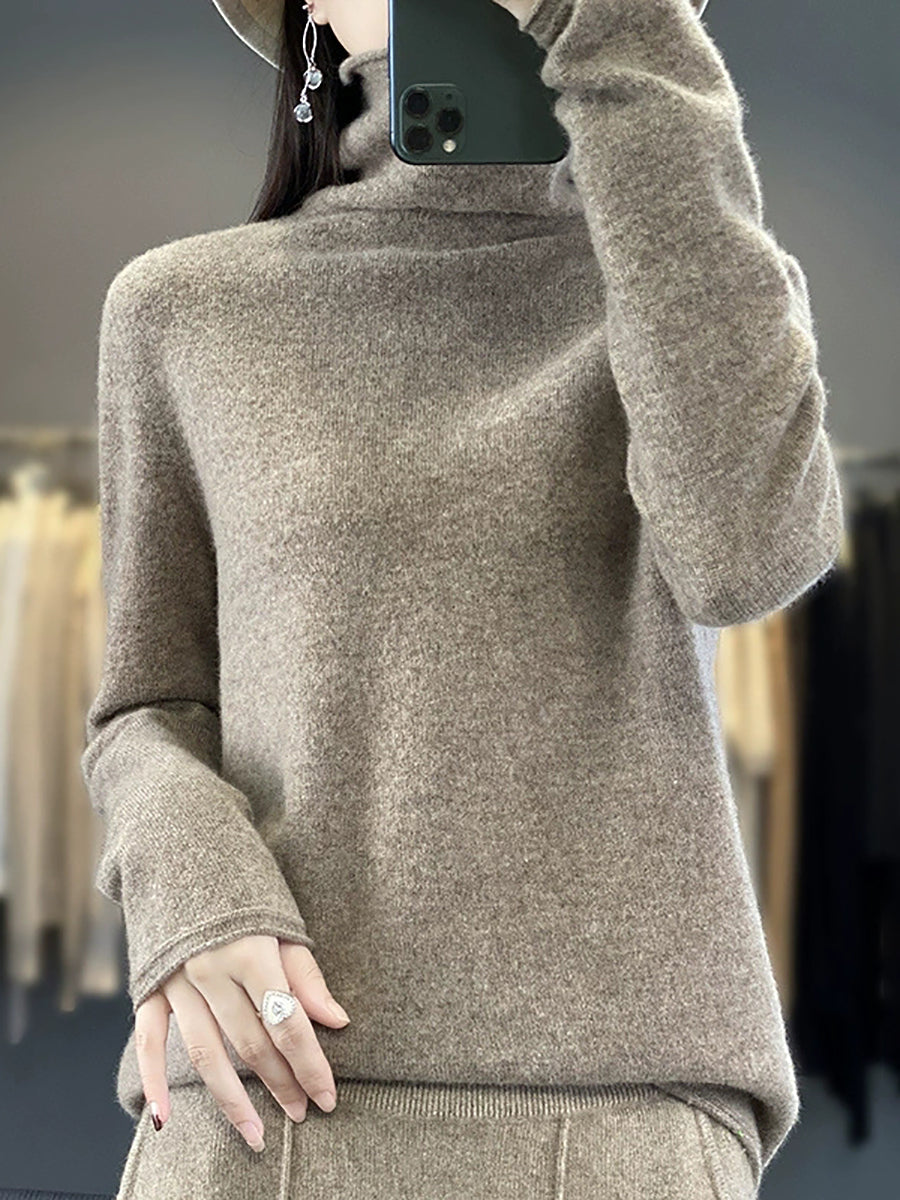 Women Spring Casual Pure Color Turtleneck Wool Sweater