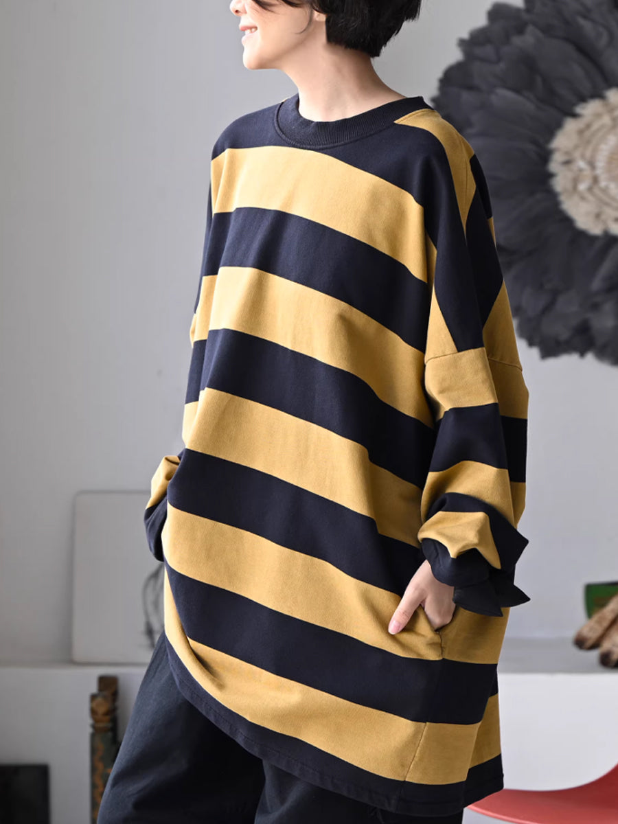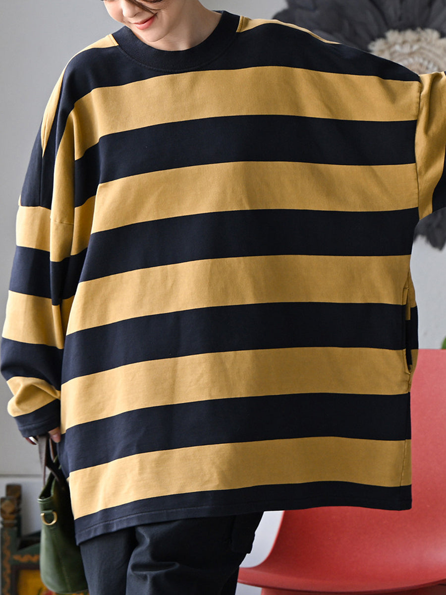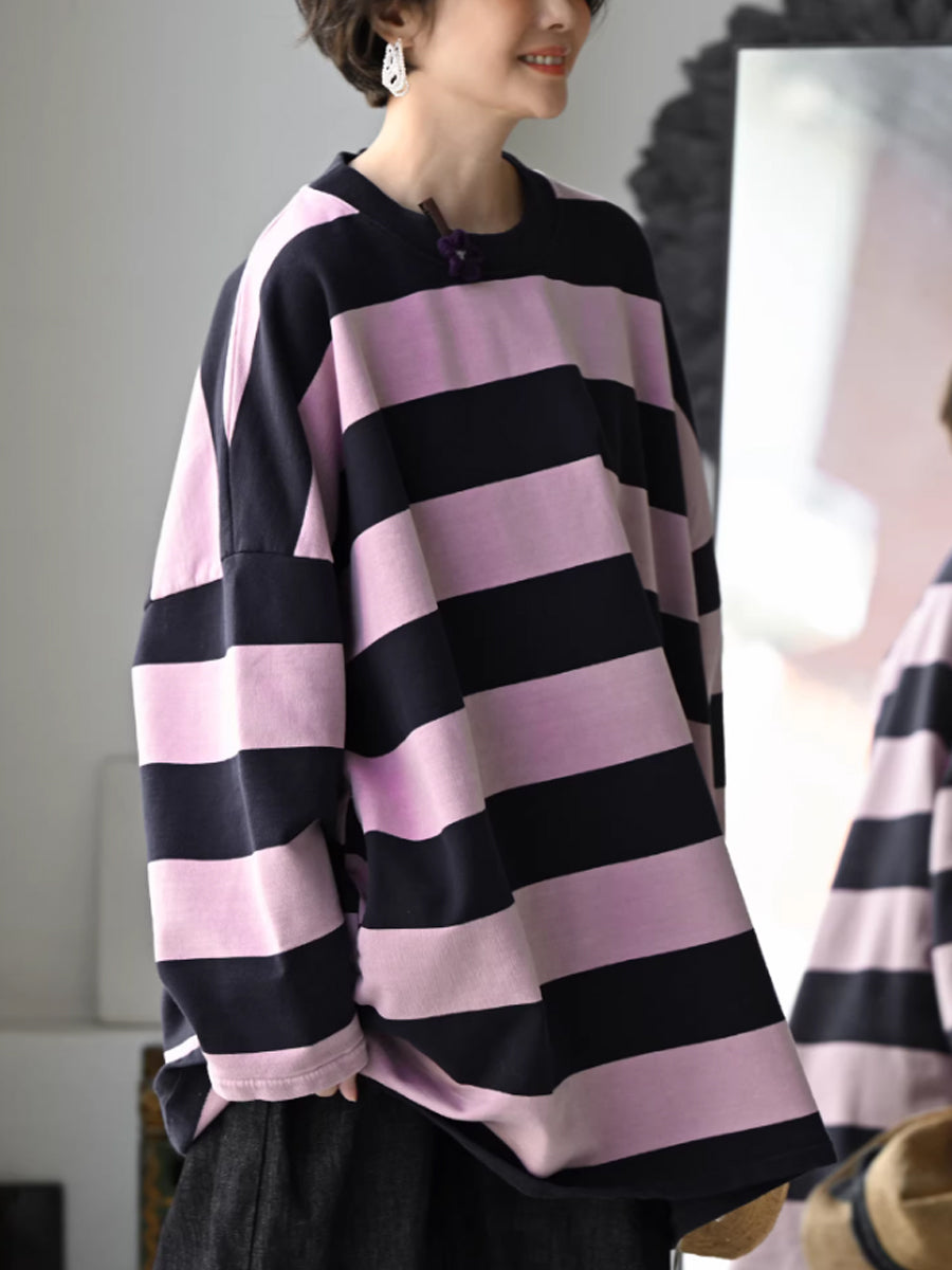 Women Spring Casual Stripe O-Neck 100%Cotton Shirt