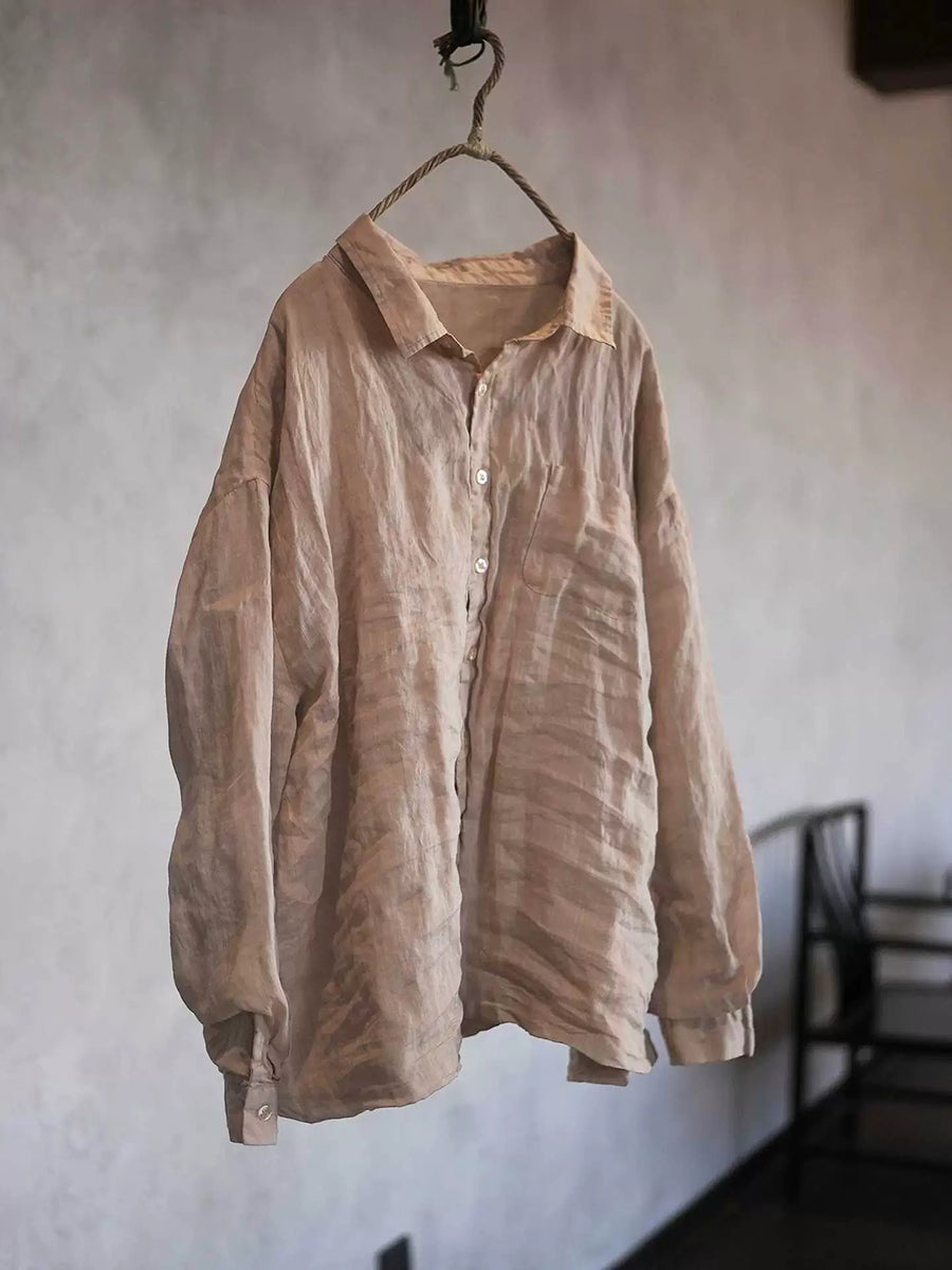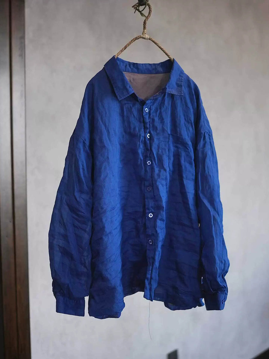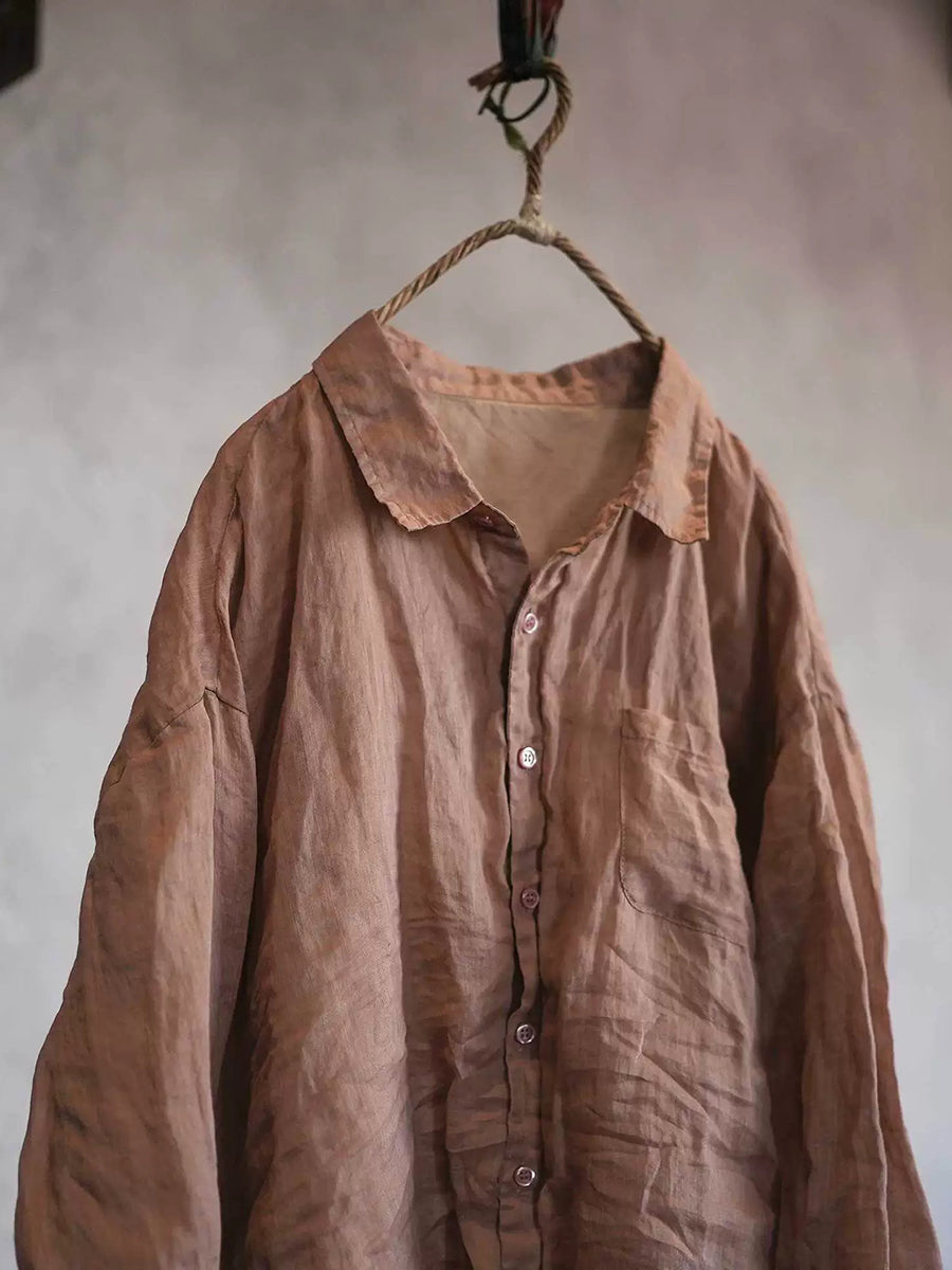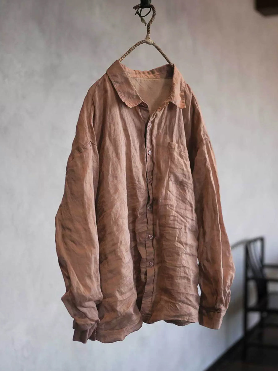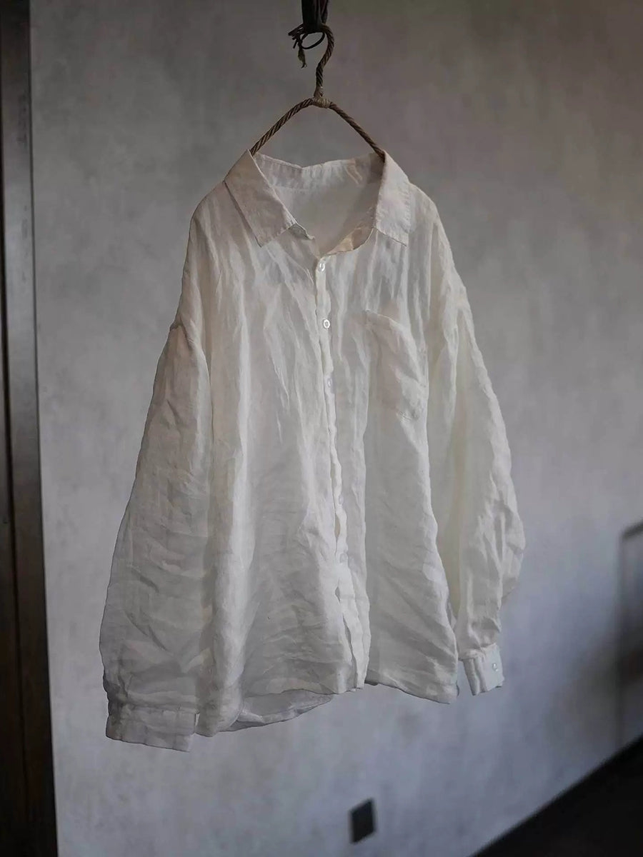 Women Spring Pure Color Turn-down Collar Ramie Shirt