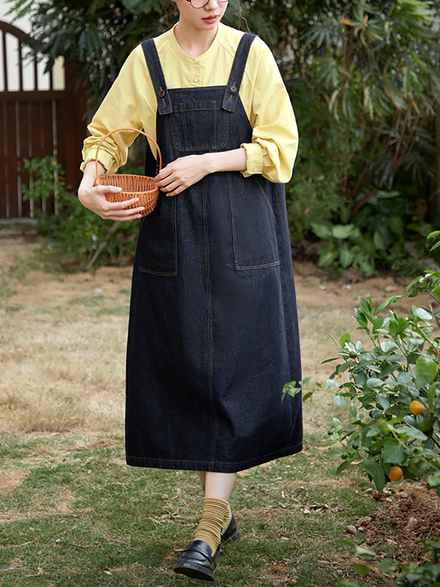 Women Spring Retro Pure Color Denim Overall Dress