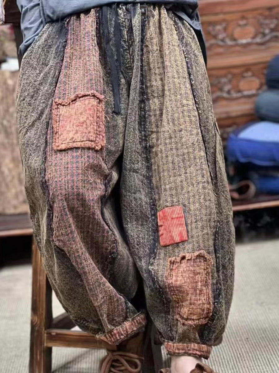 This pair of Women's Spring Retro Spliced Frayed Harem Pants is made from 100% cotton and features an elastic waist, making it a comfortable and stylish option for any season. The unique spliced pattern and full length design add a touch of retro style to your wardrobe. Perfect for the spring, autumn, and summer months, these pants are a must-have for any fashion-forward individual.
