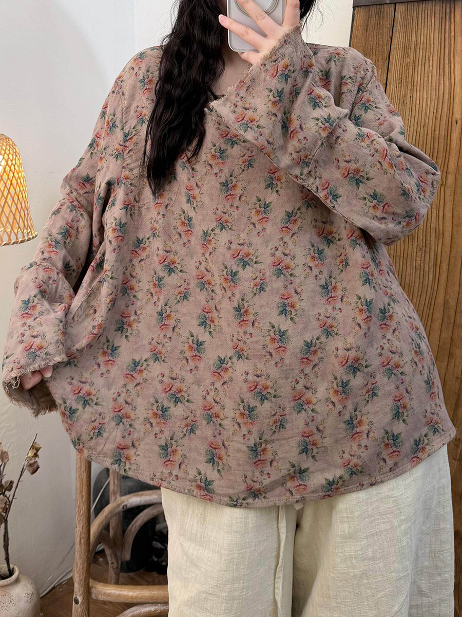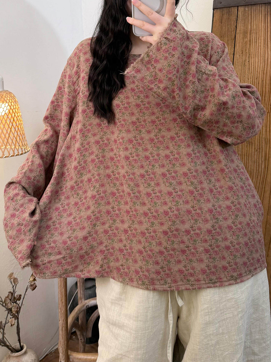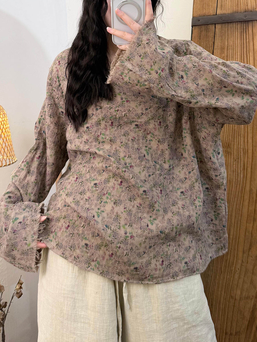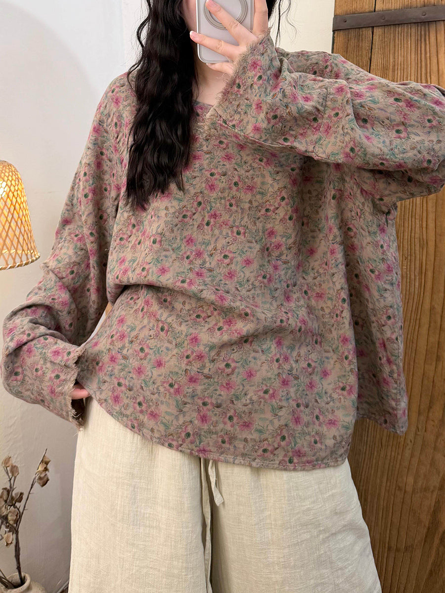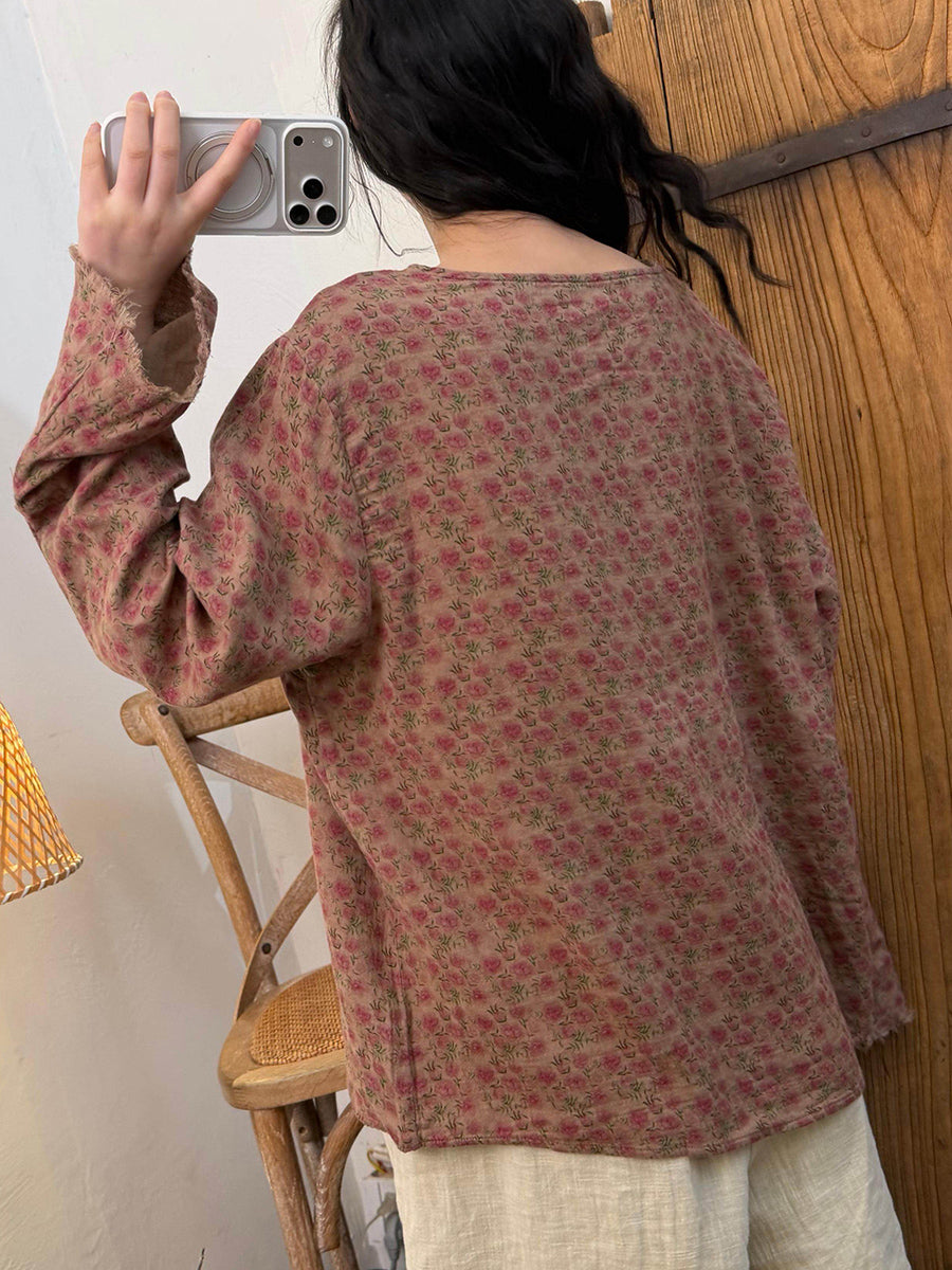 Women Spring Vintage Floral O-Neck Cotton Blouse