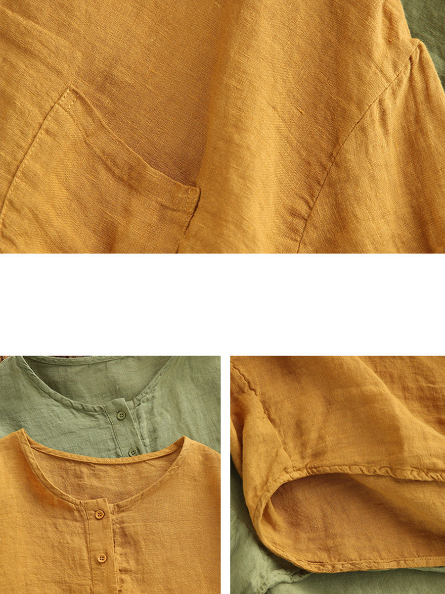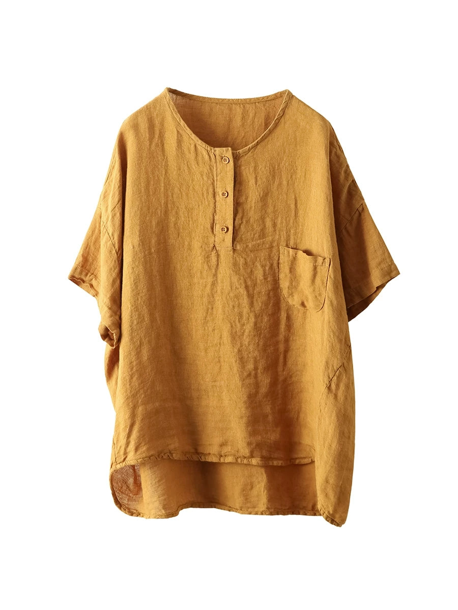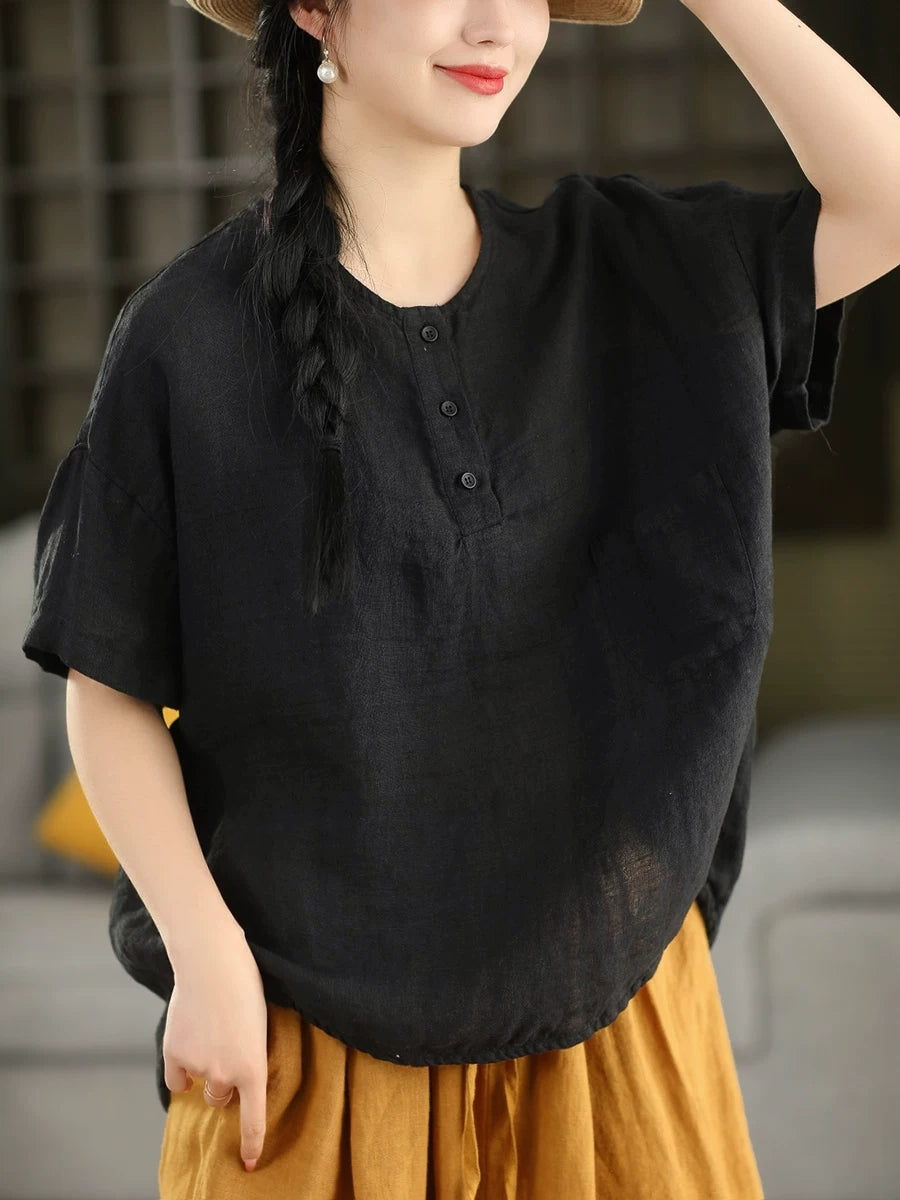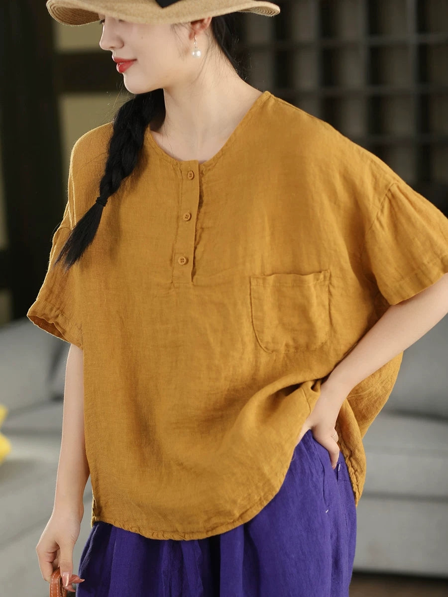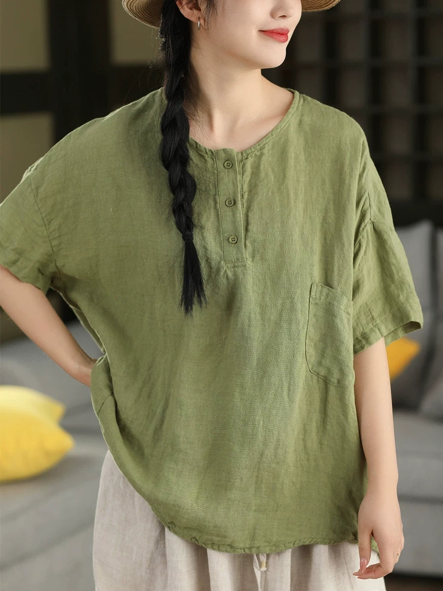 Women Summer Artsy Pure Color 100%Linen O-Neck Blouse