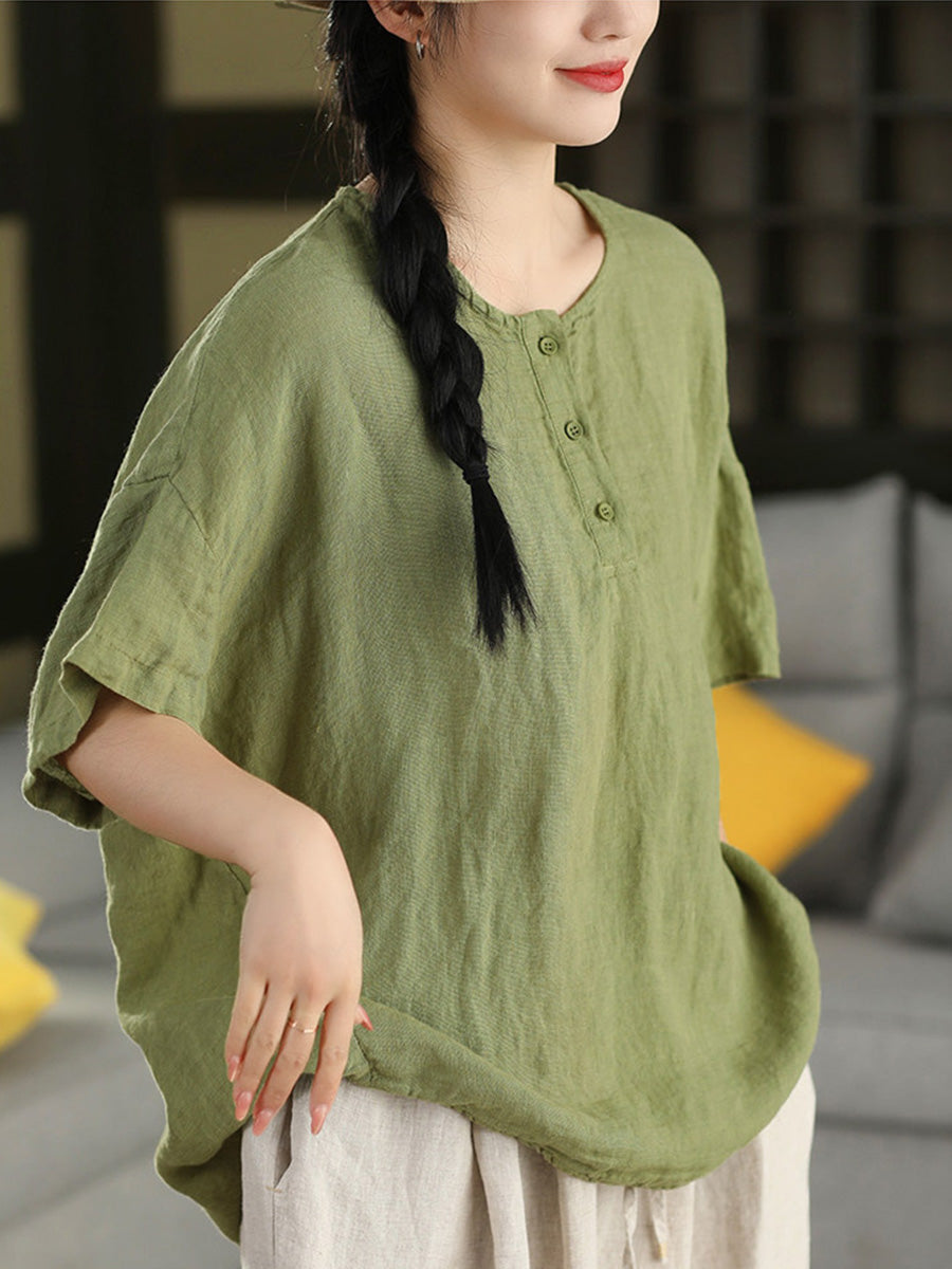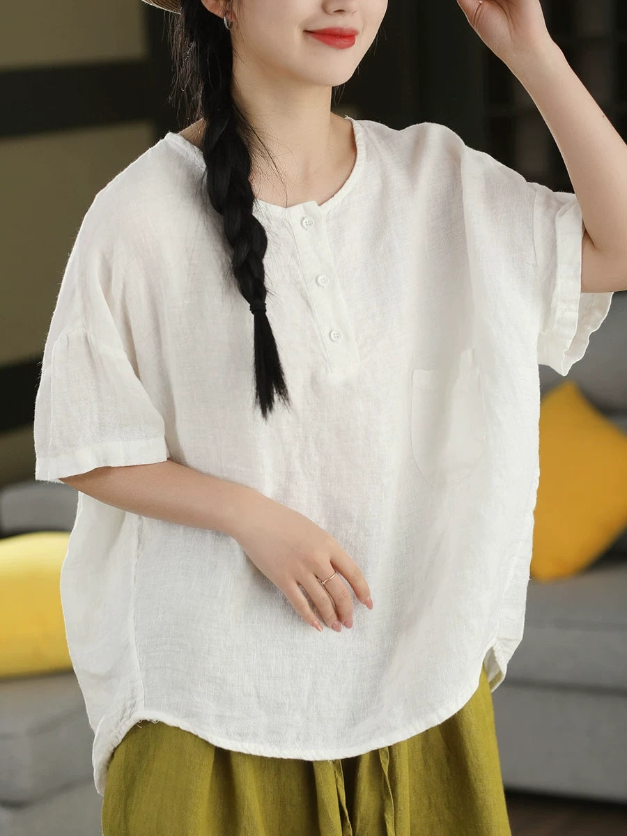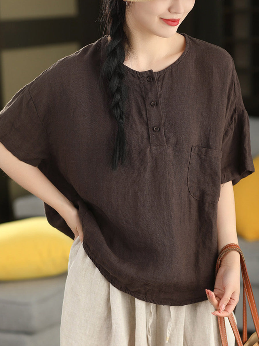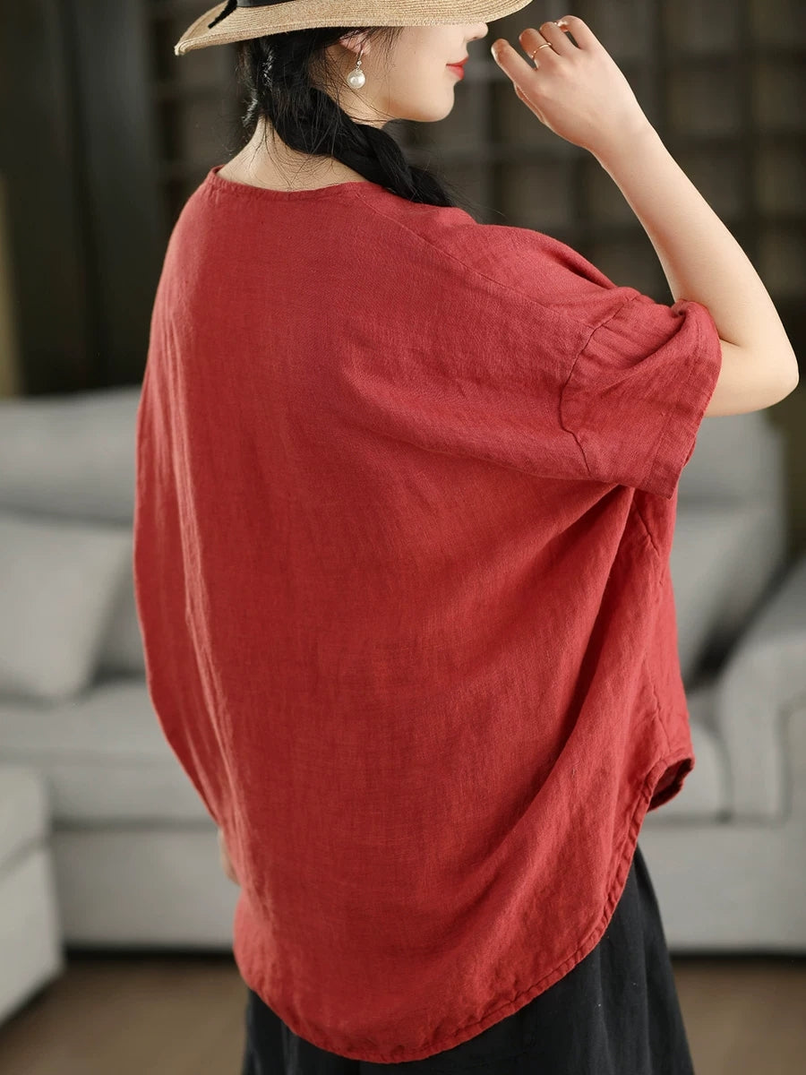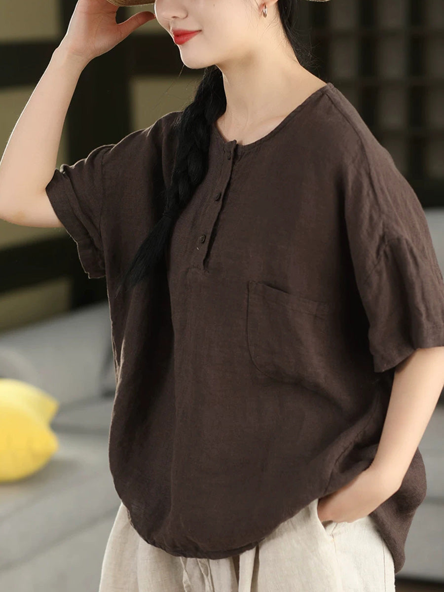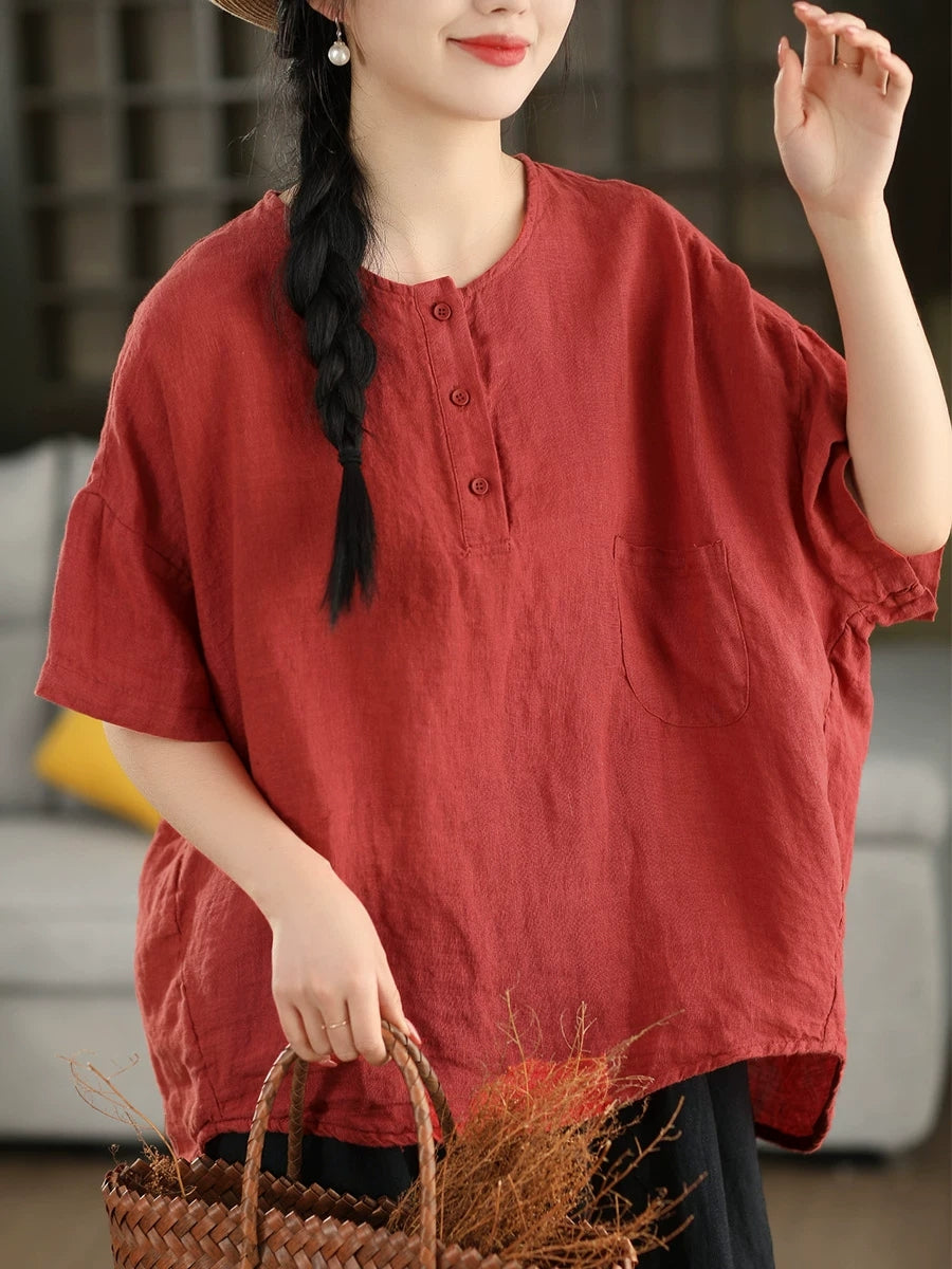 Women Summer Artsy Pure Color 100%Linen O-Neck Blouse