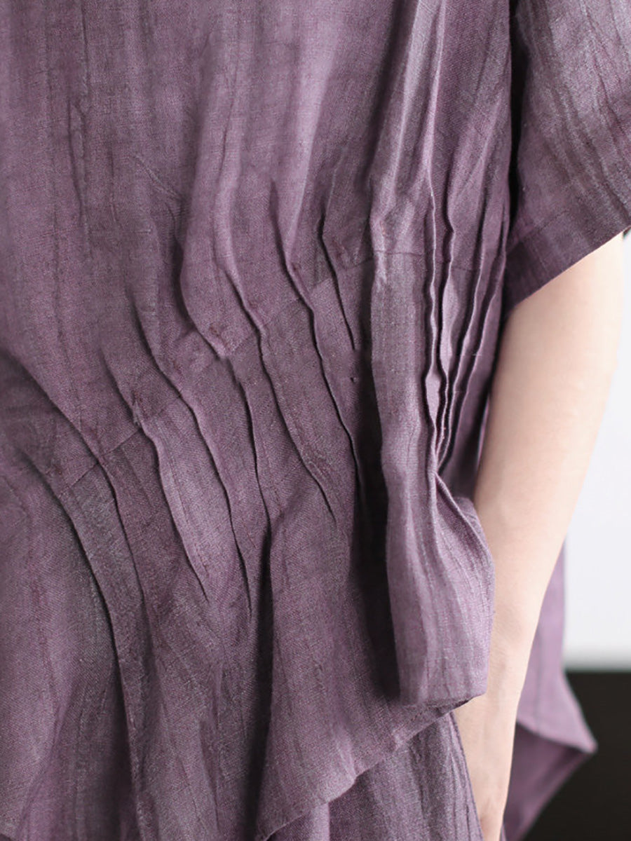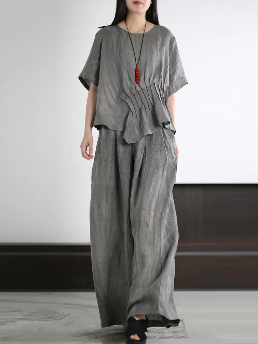 Women Summer Artsy Pure Color Linen O-Neck Suits