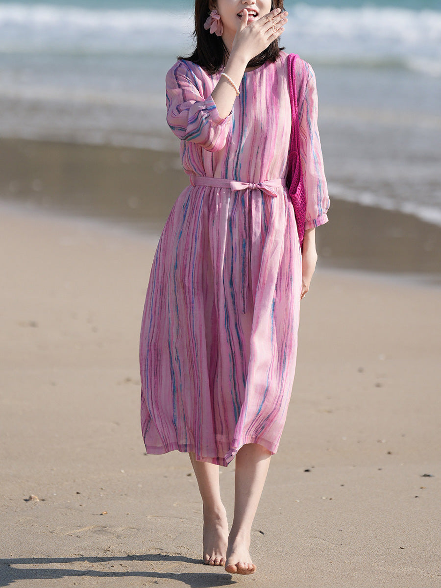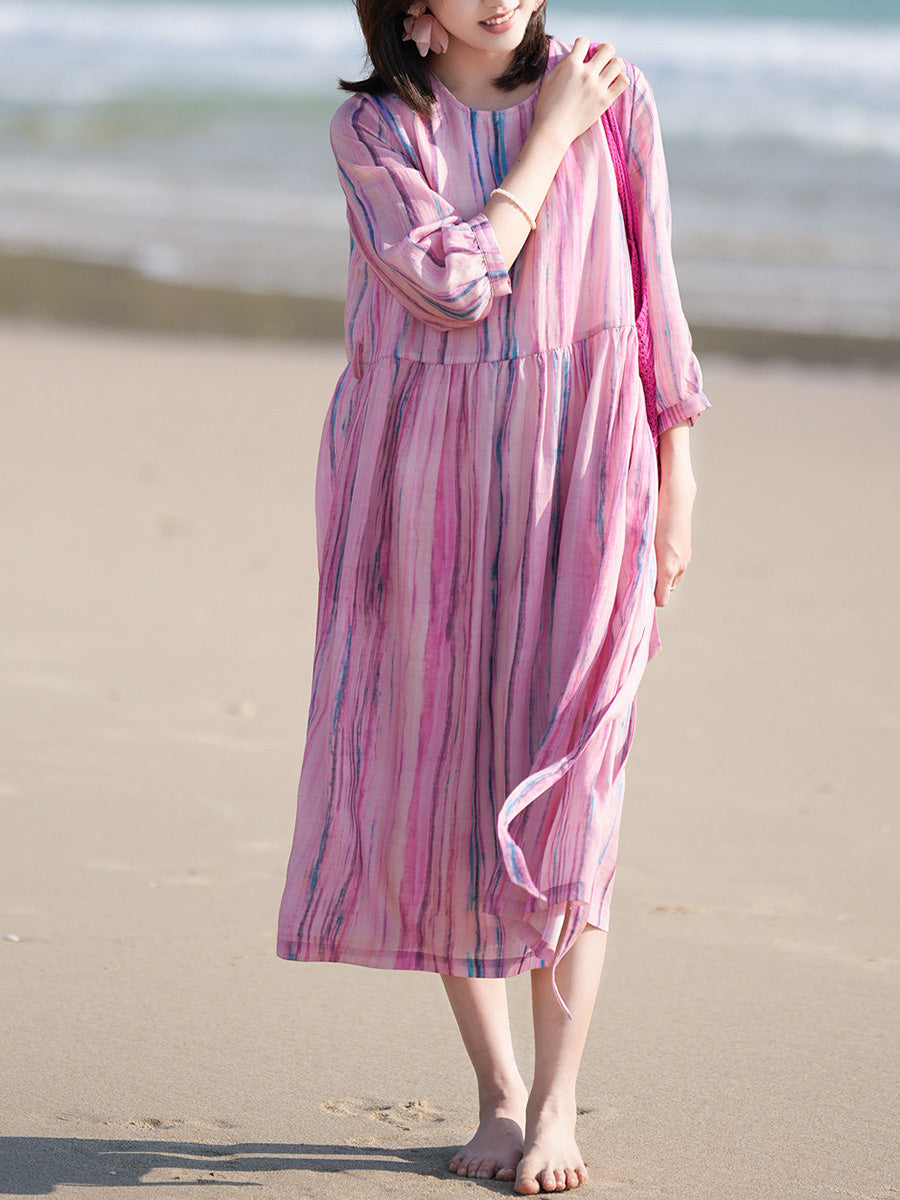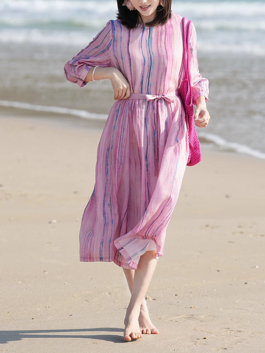 Women Summer Artsy Stripe 100%Ramie O-Neck Dress