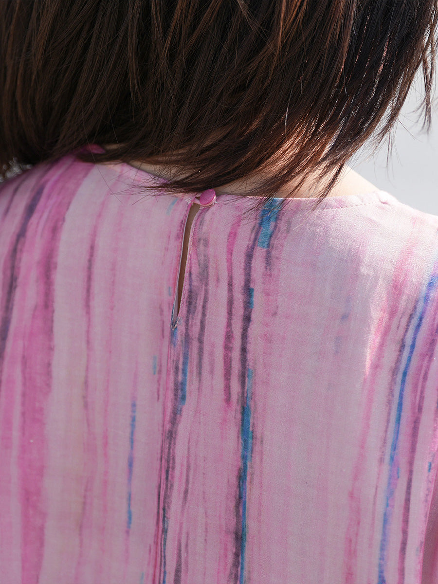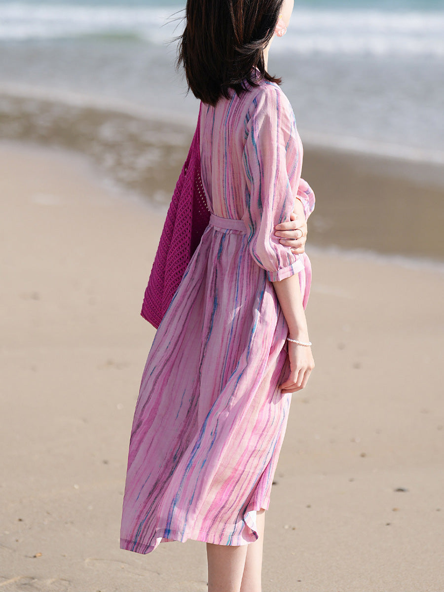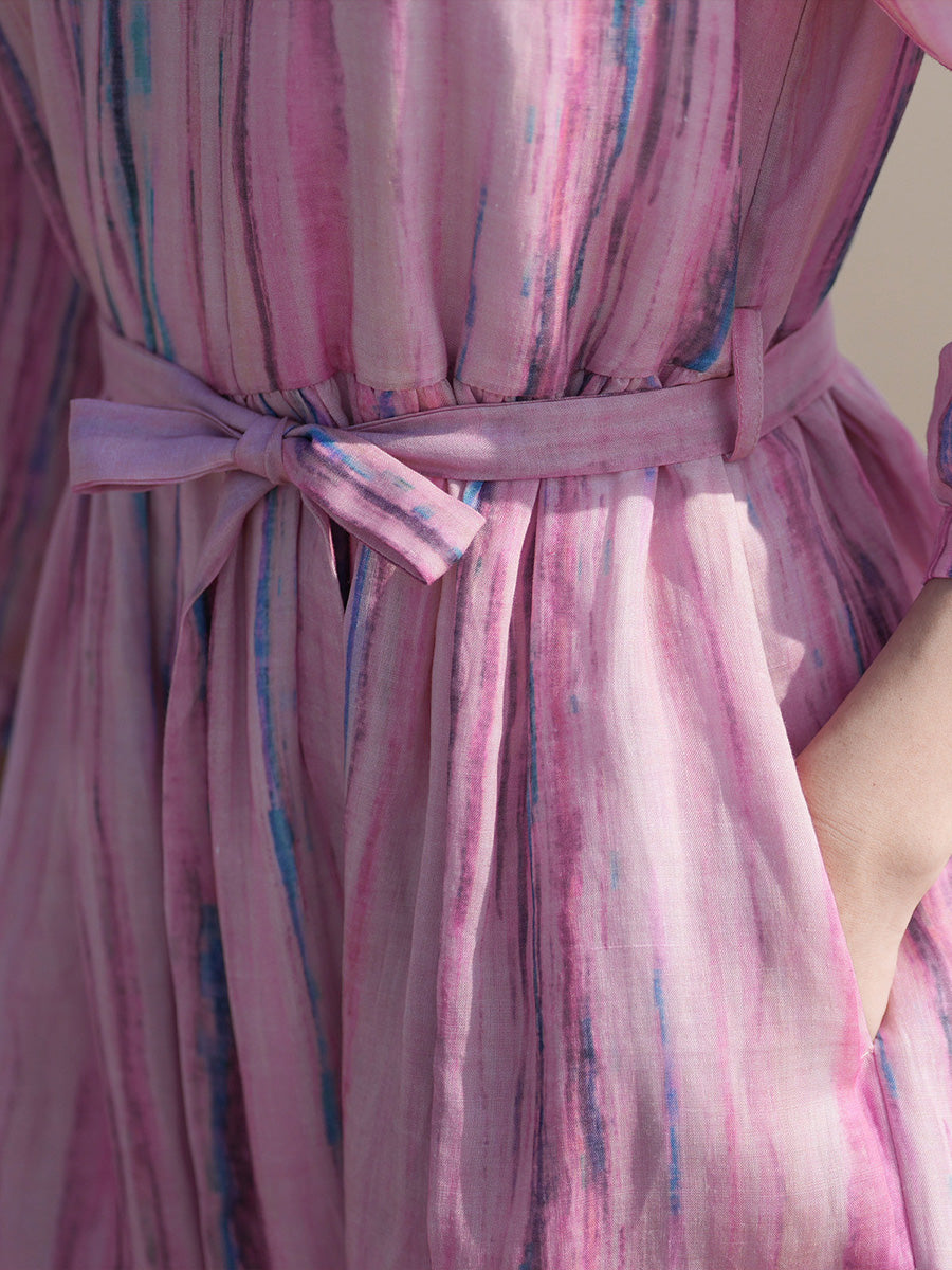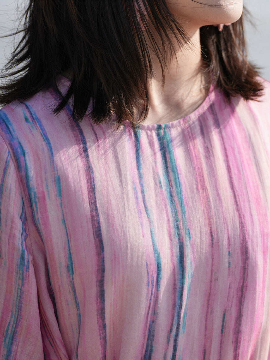 Women Summer Artsy Stripe 100%Ramie O-Neck Dress
