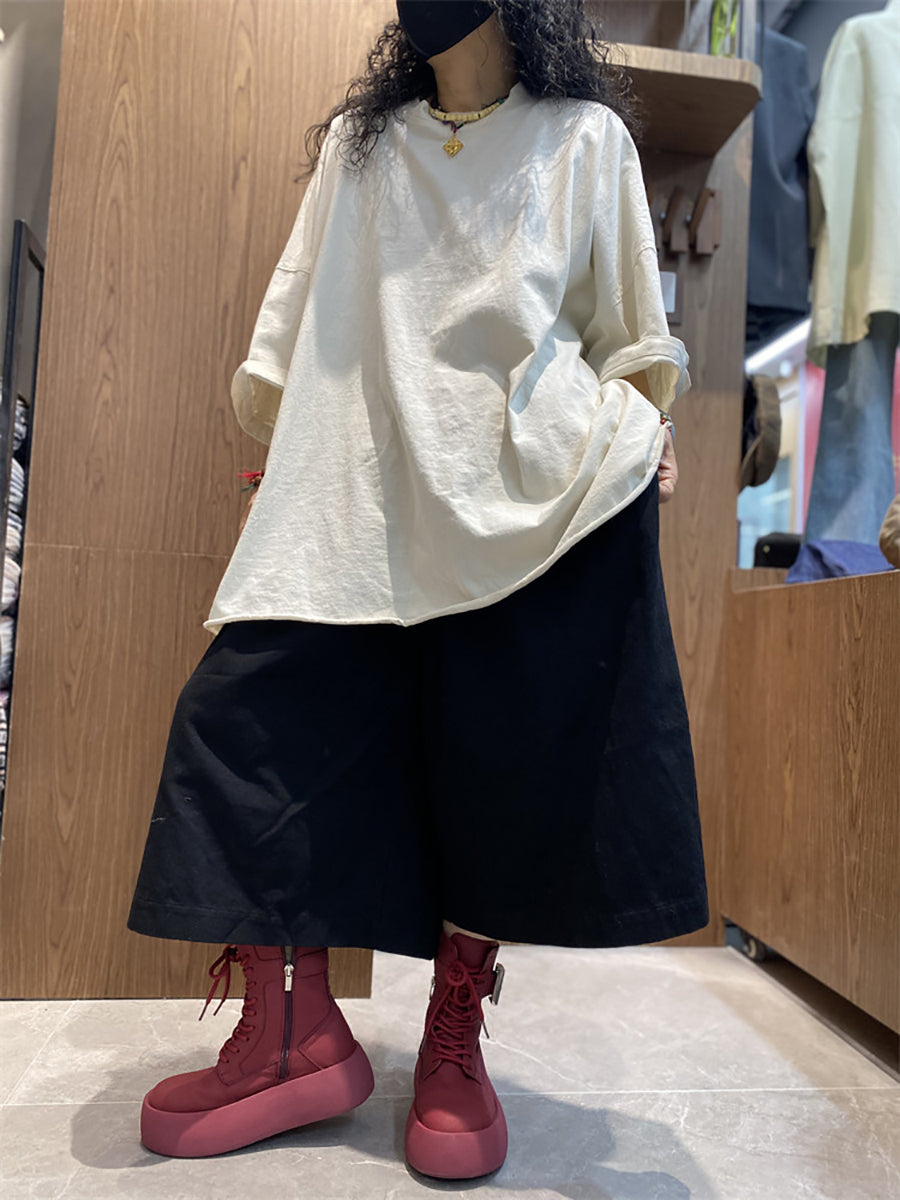 Women Summer Casual Pure Color O-Neck Cotton Shirt