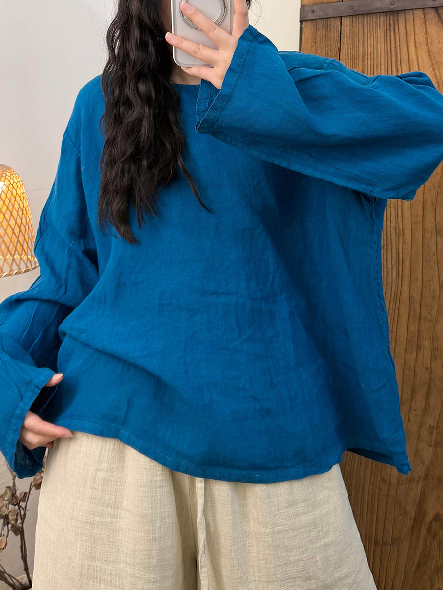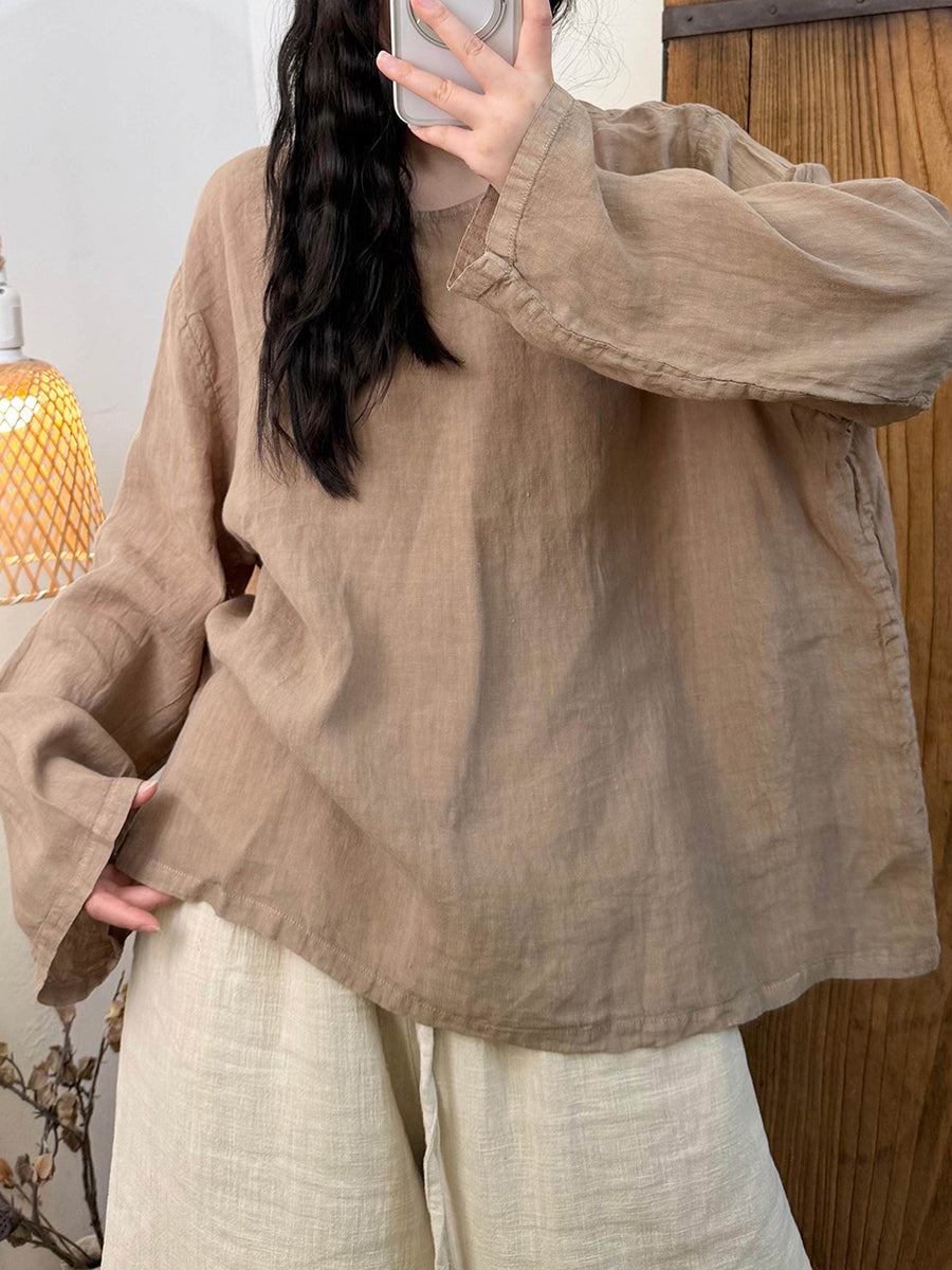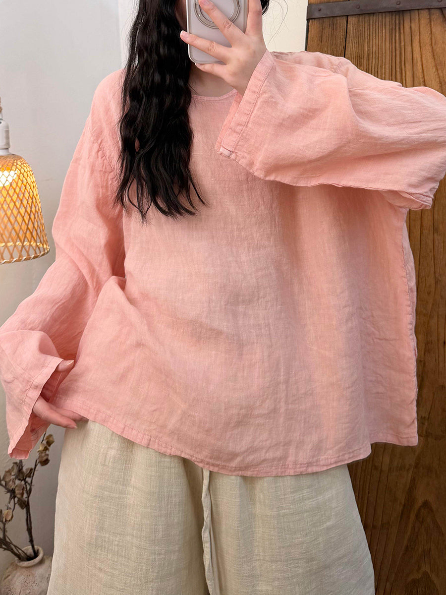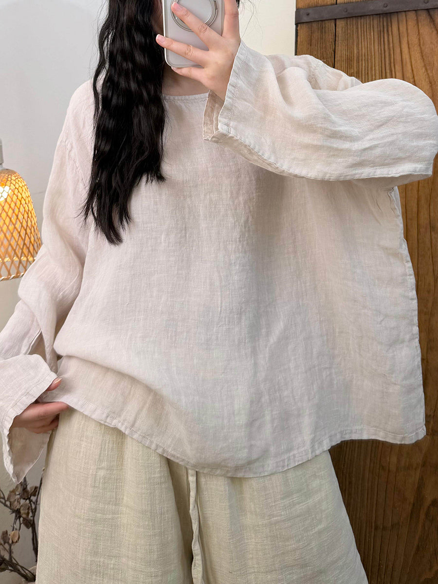 Women Summer Casual Pure Color O-Neck Linen Shirt