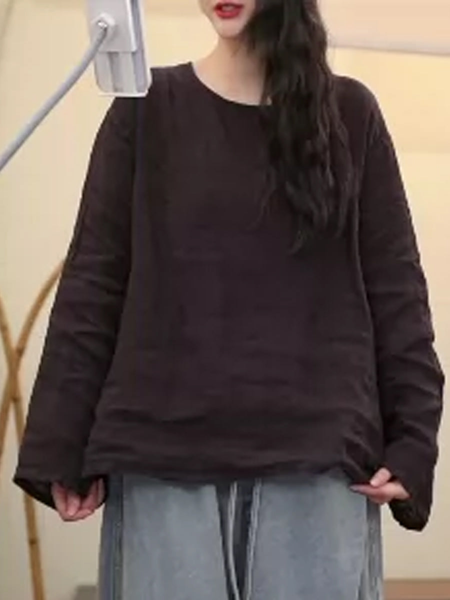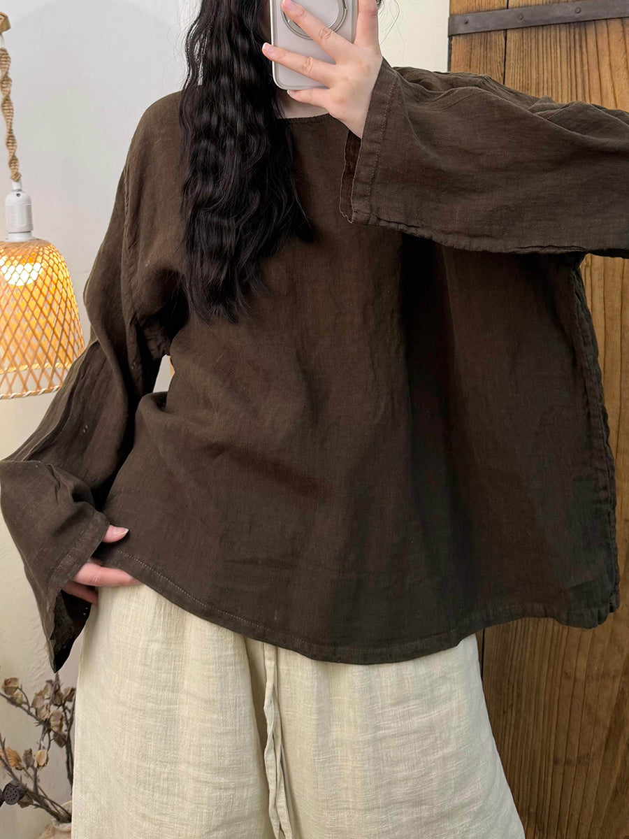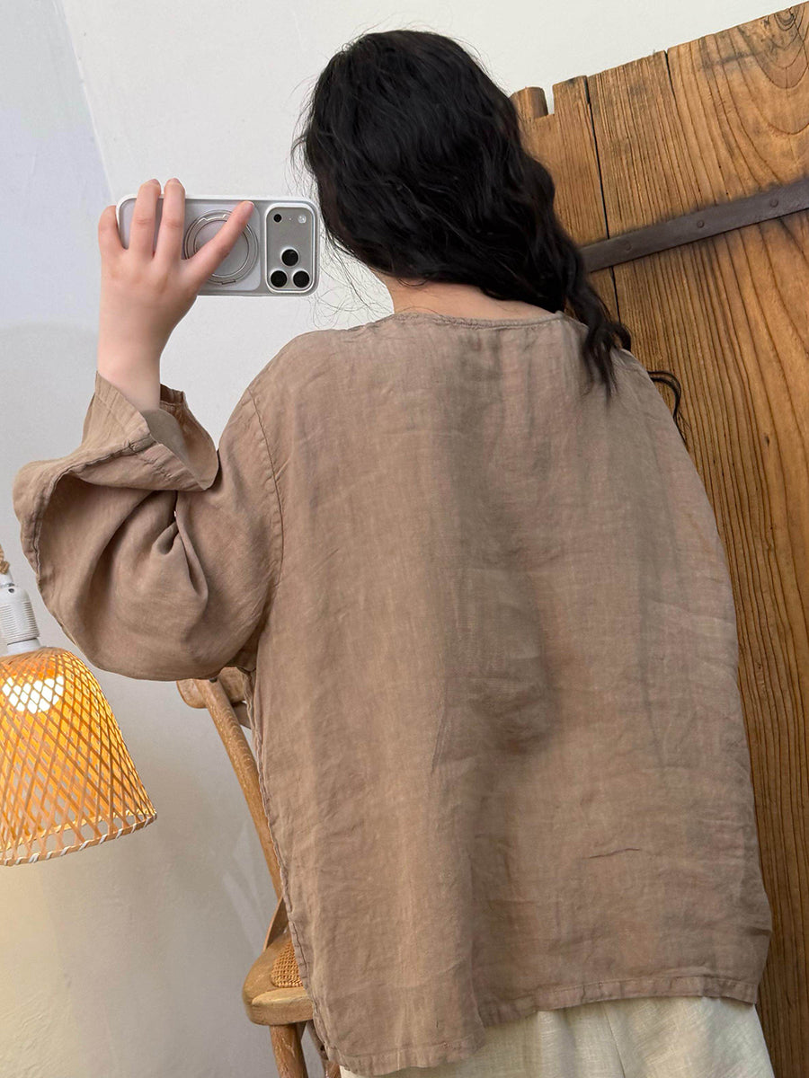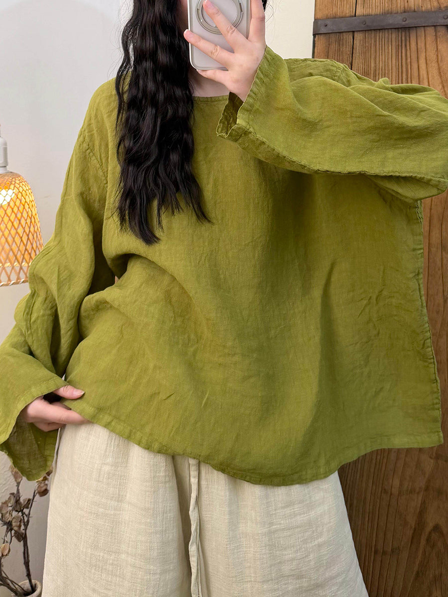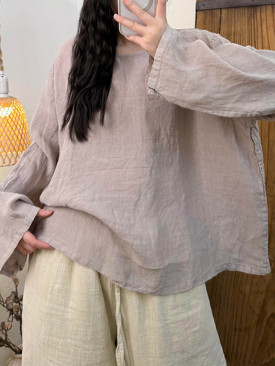 Women Summer Casual Pure Color O-Neck Linen Shirt