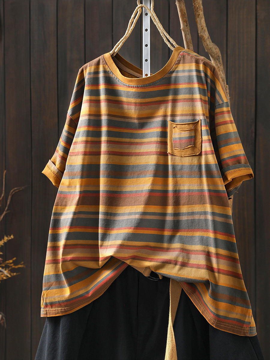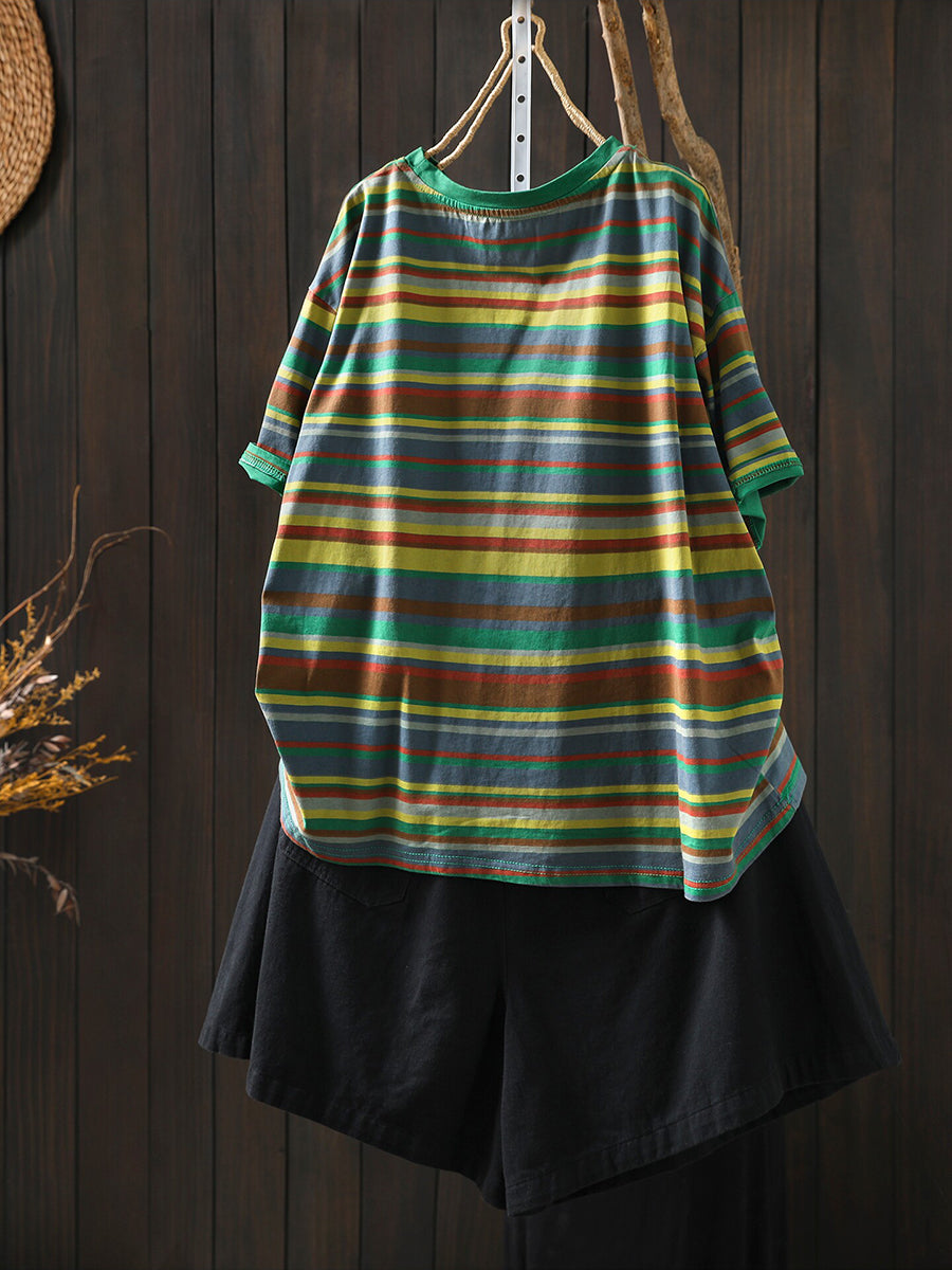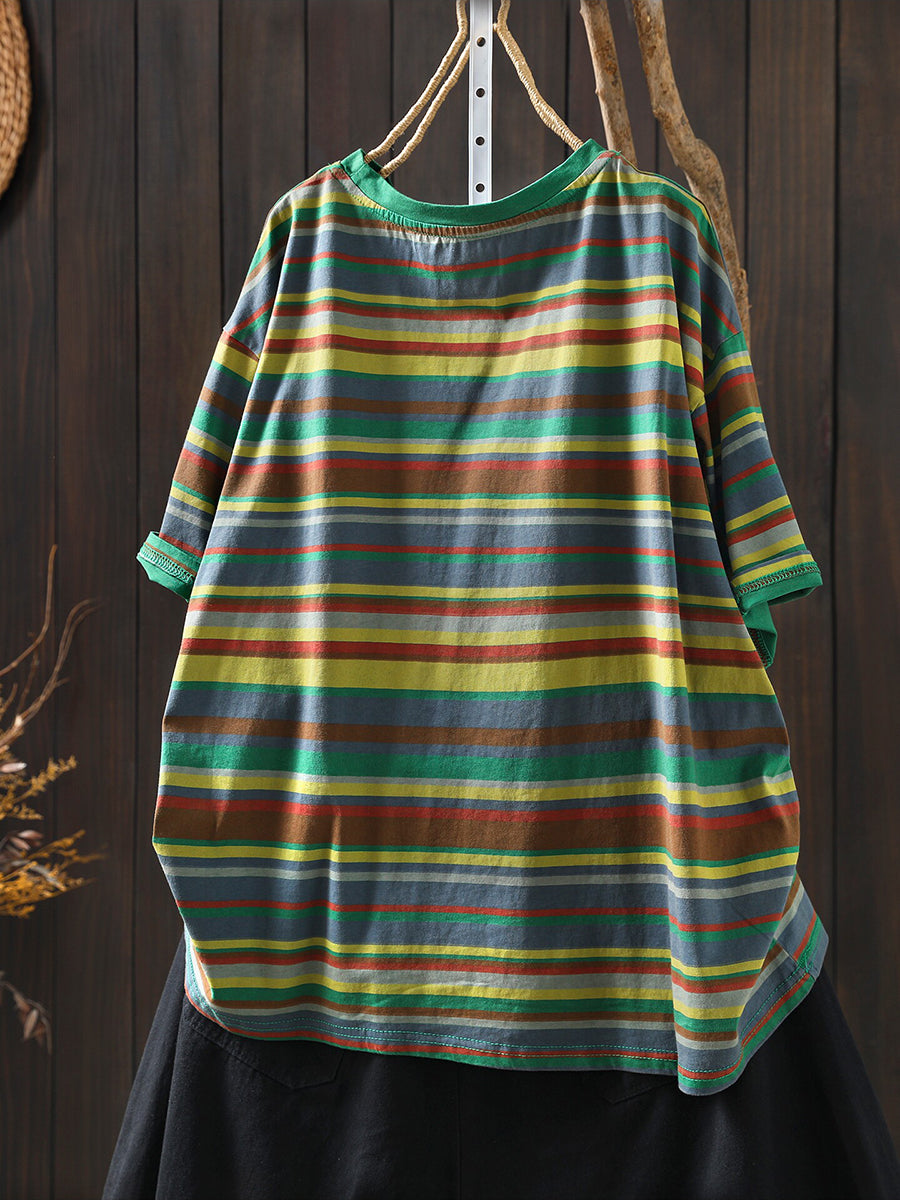 Women Summer Casual Stripe Cotton O-Neck Blouse