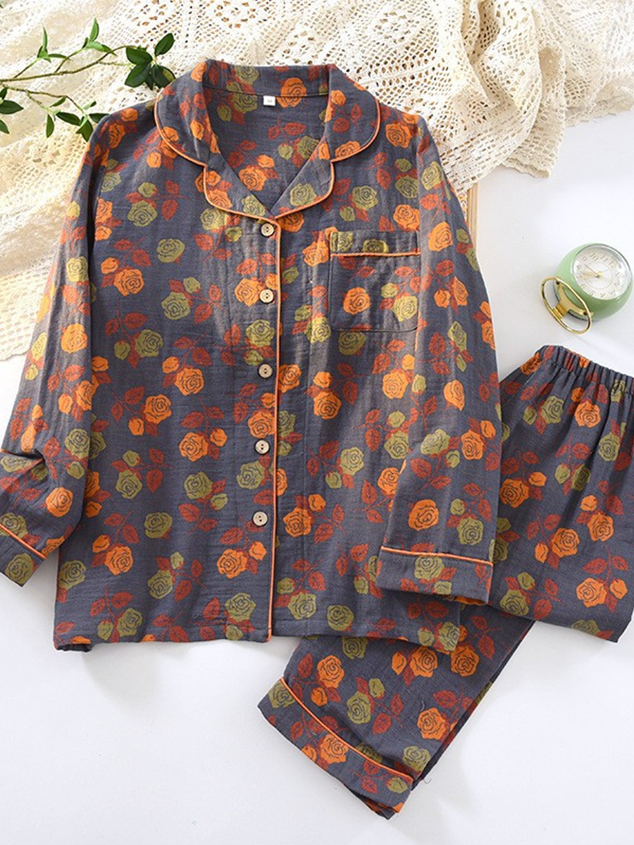 The Women’s Summer Floral Homewear Pajama Set is crafted from soft jacquard gauze for comfort. This stylish set features a V-neck, floral pattern, long sleeves, and an elastic waistband, with full-length pants perfect for lounging at home.
