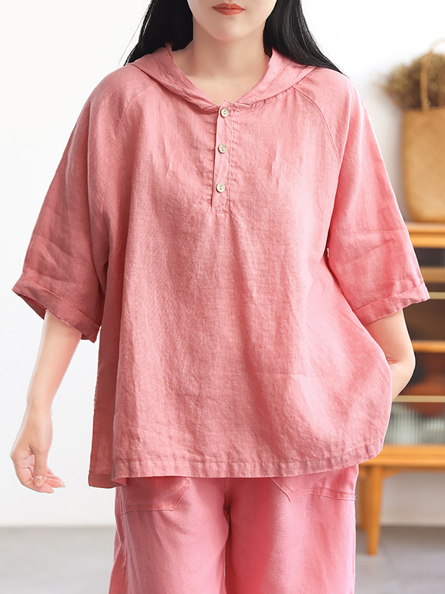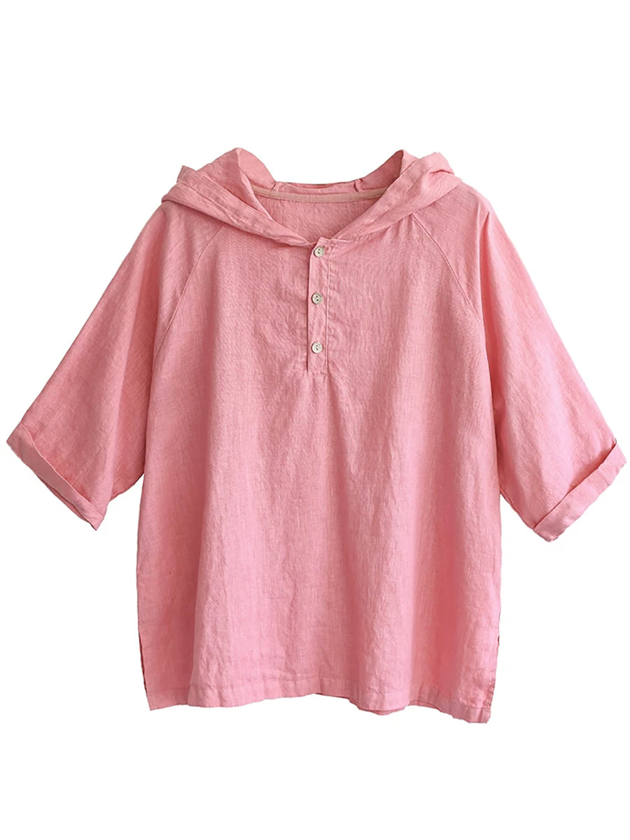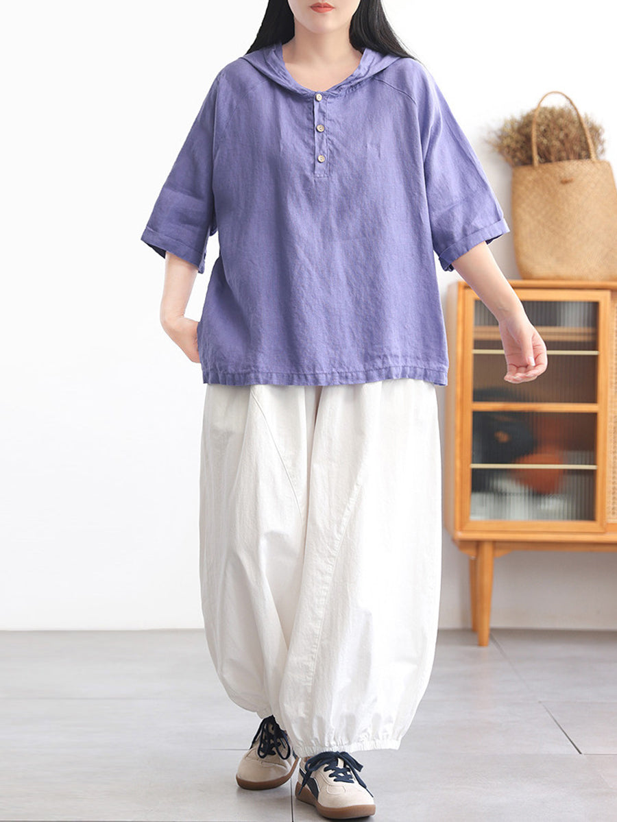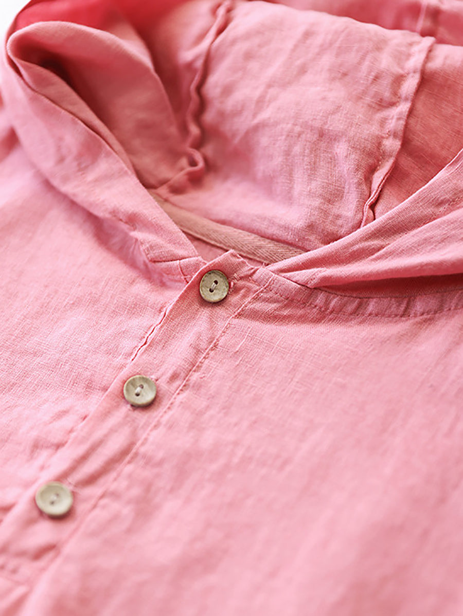 Women Summer Pure Color 100%Linen Hoodie
