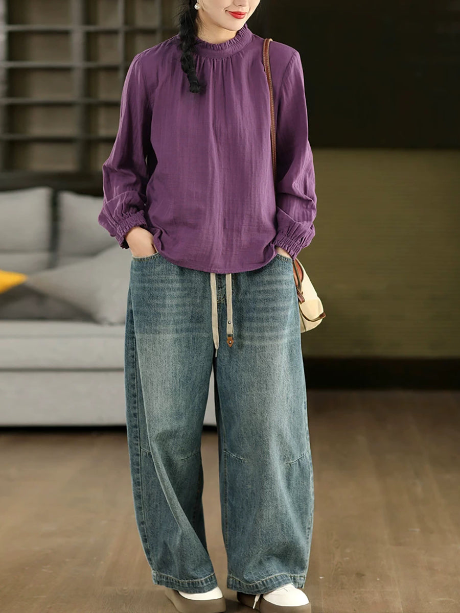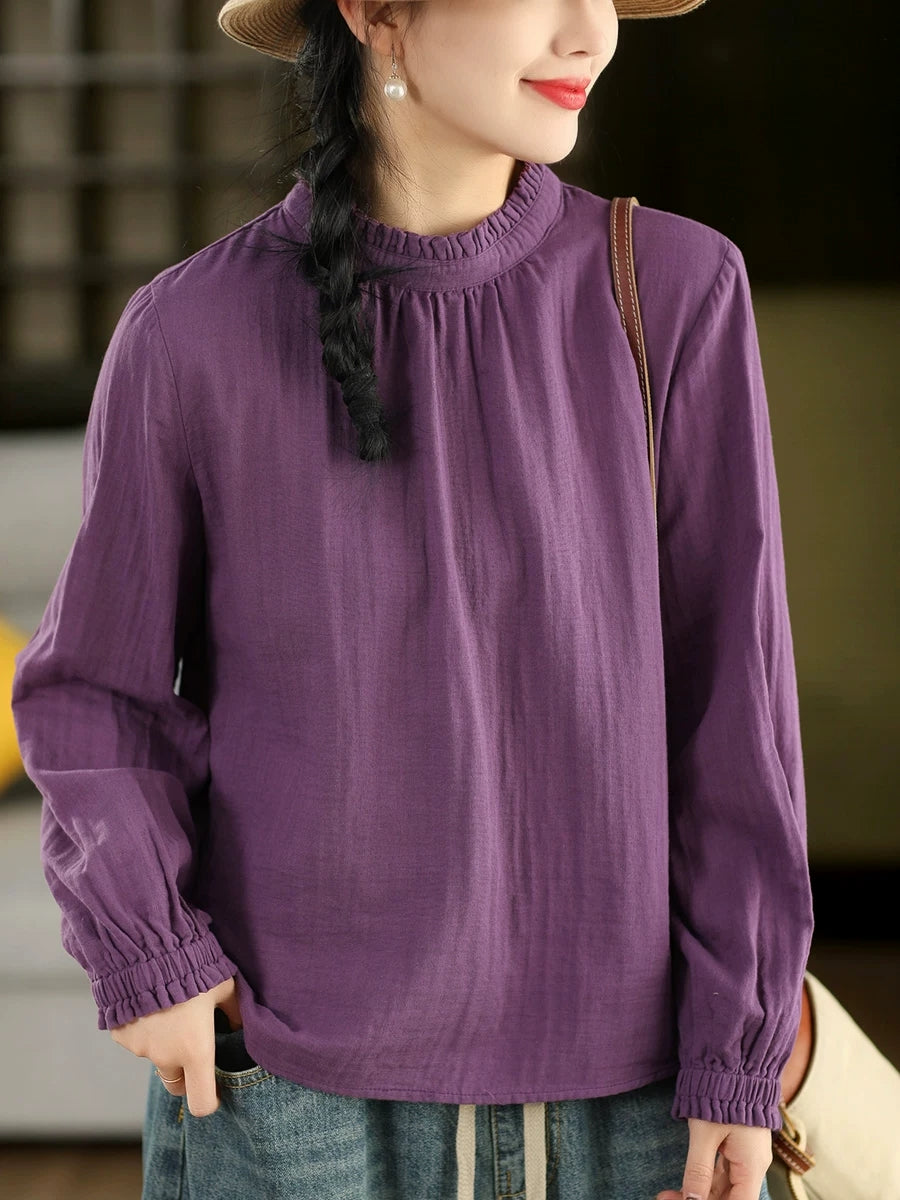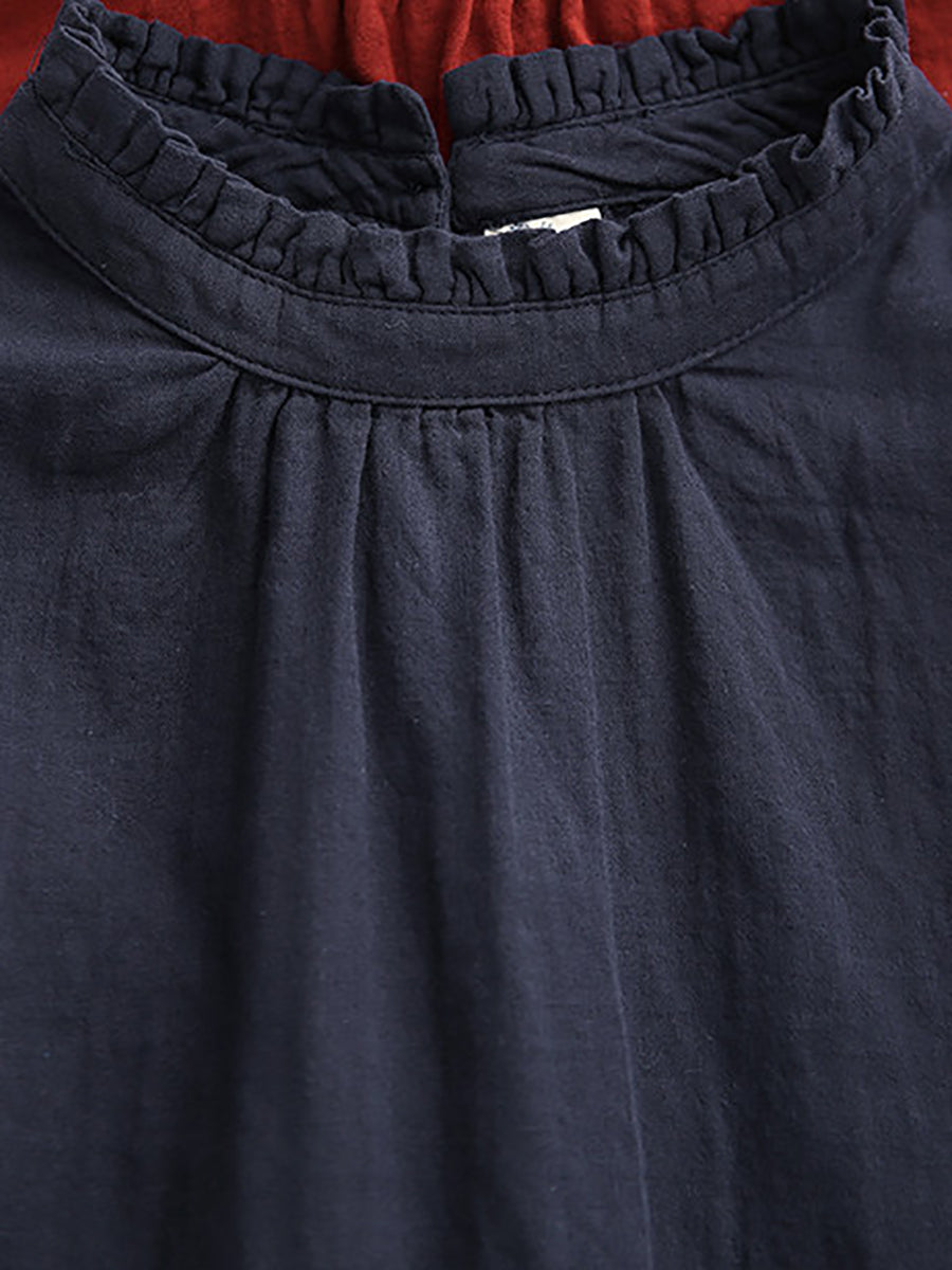 Women Summer Pure Color O-Neck 100%Cotton Blouse