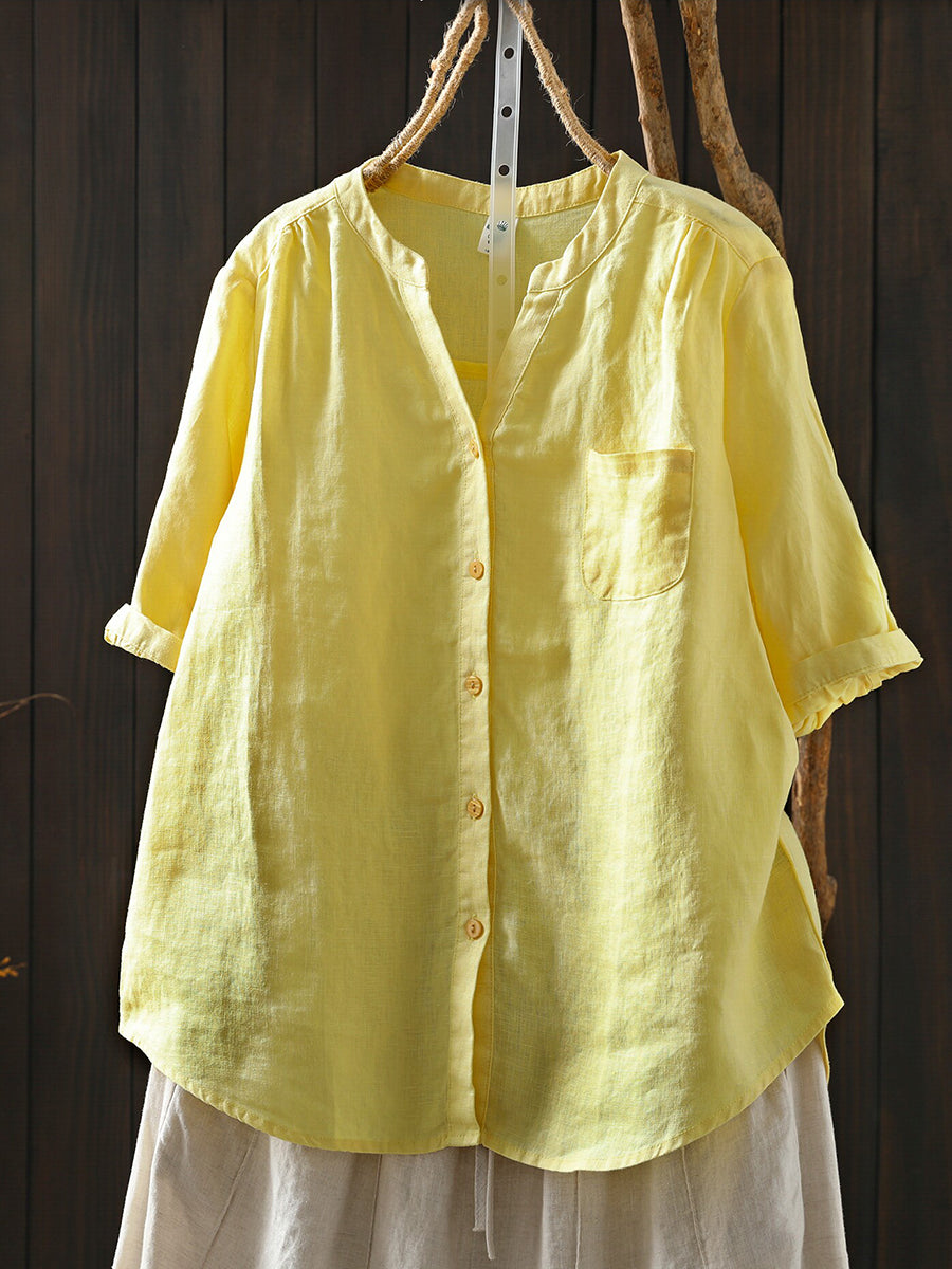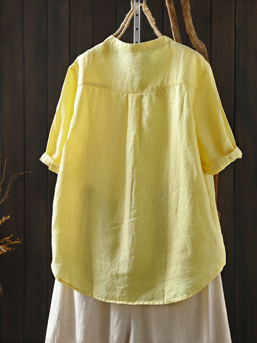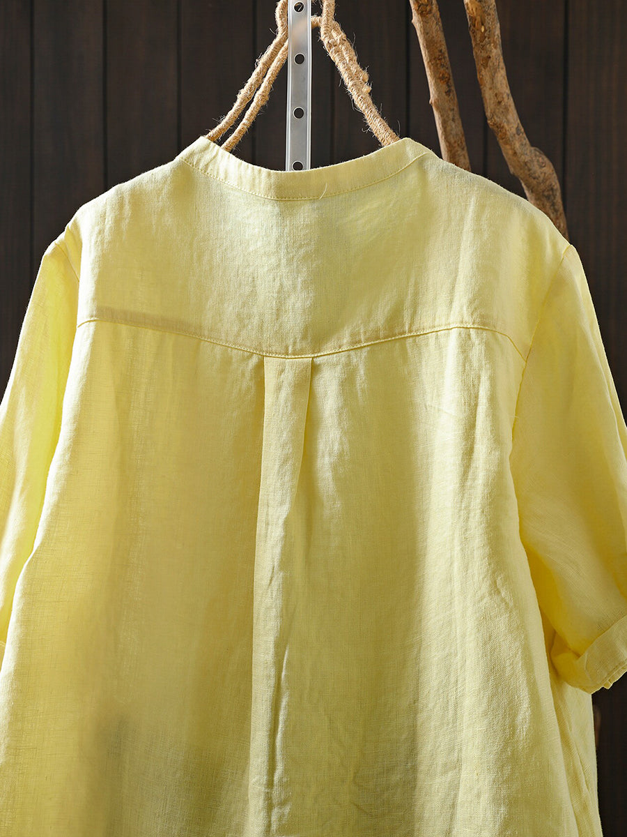 Women Summer Retro Pure Color 100%Linen Blouse